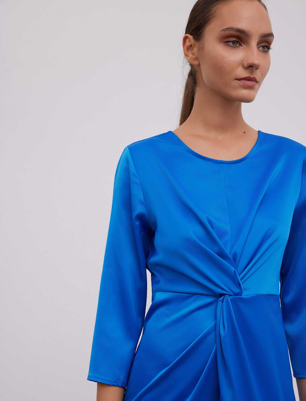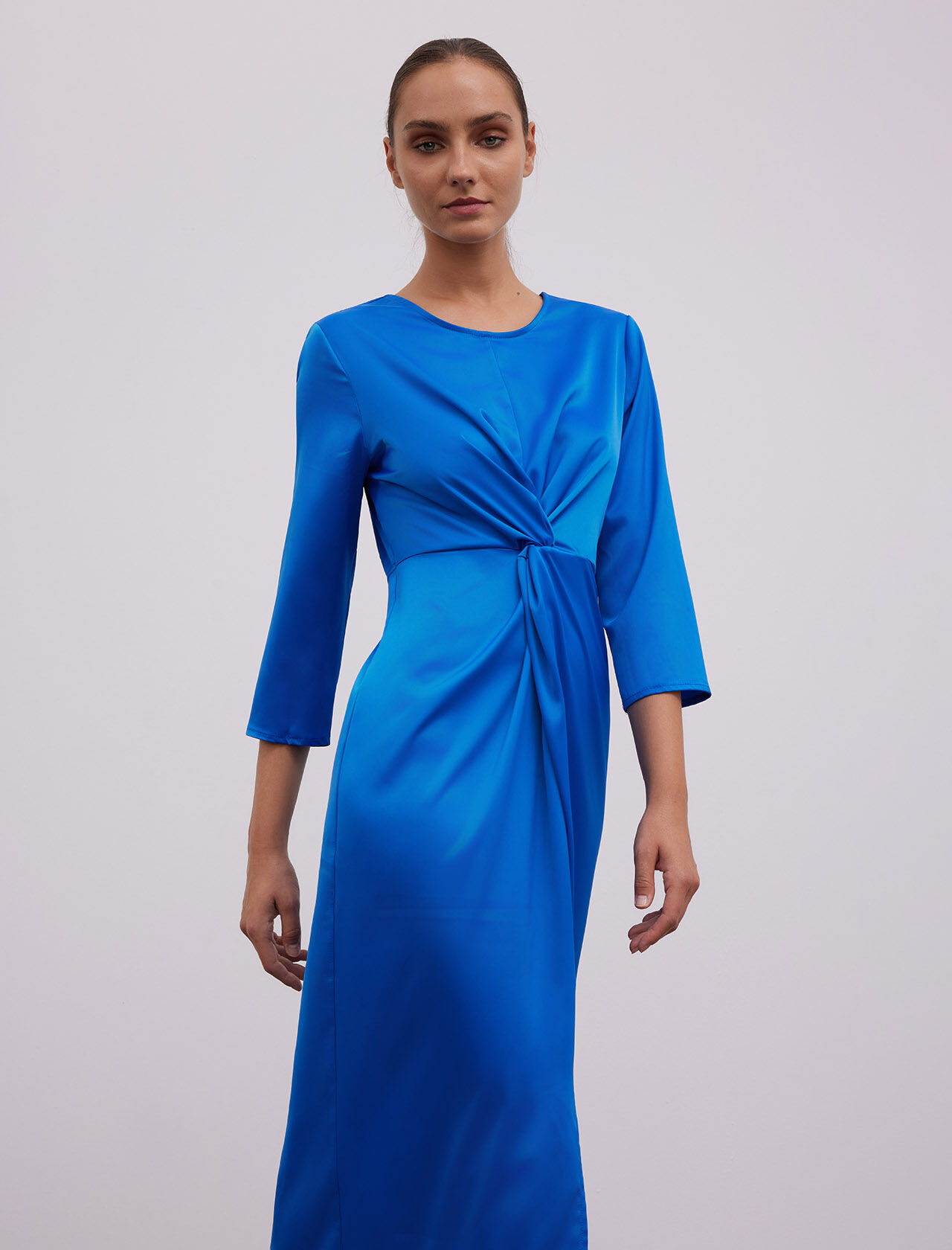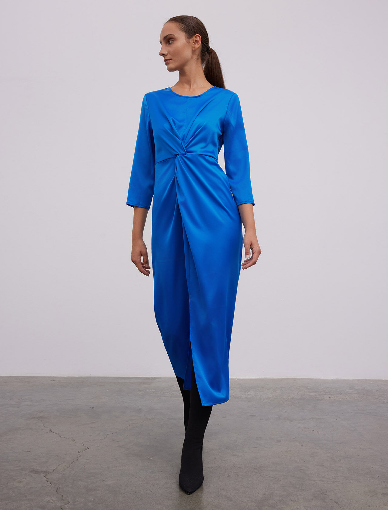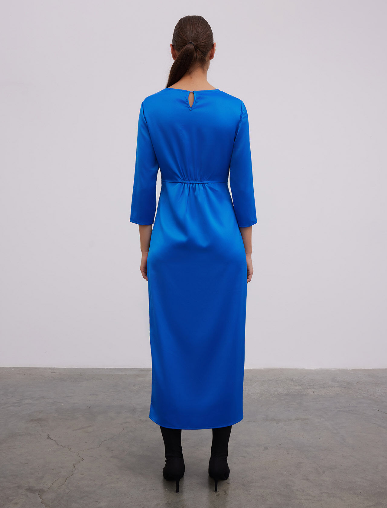 BELDE DUGUM DETAYLI YIRTMACLI UZUN SATEN ELBISE