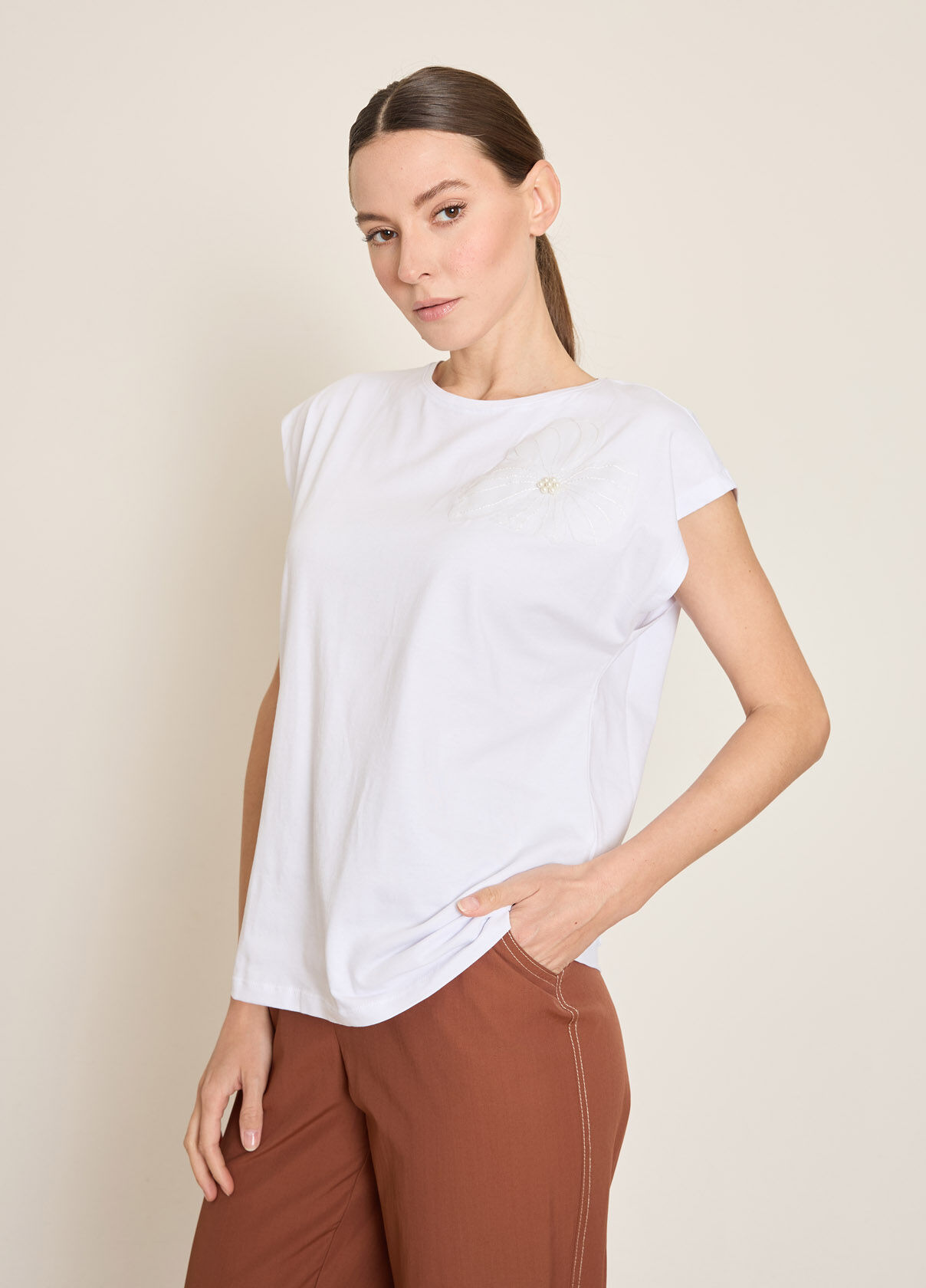 BONCUK İŞLEMELİ CICEK APLİKELİ PAMUKLU T-SHIRT