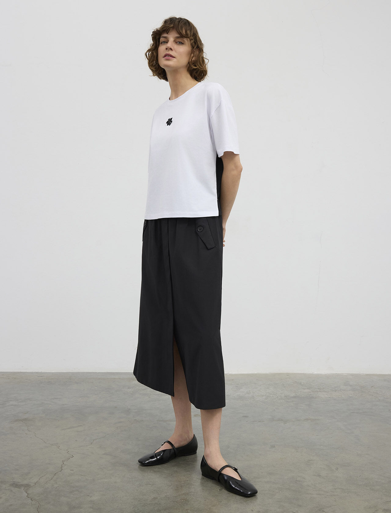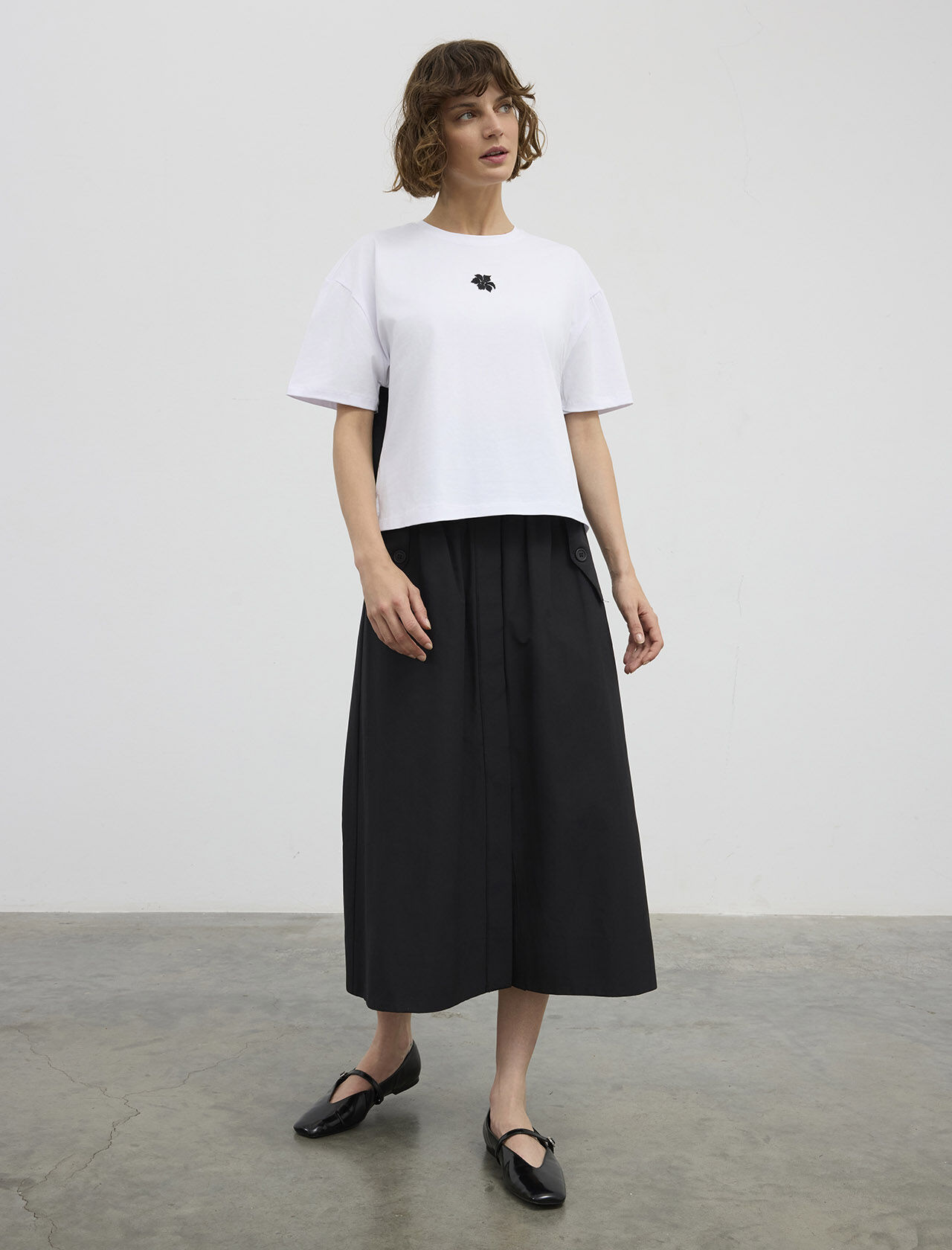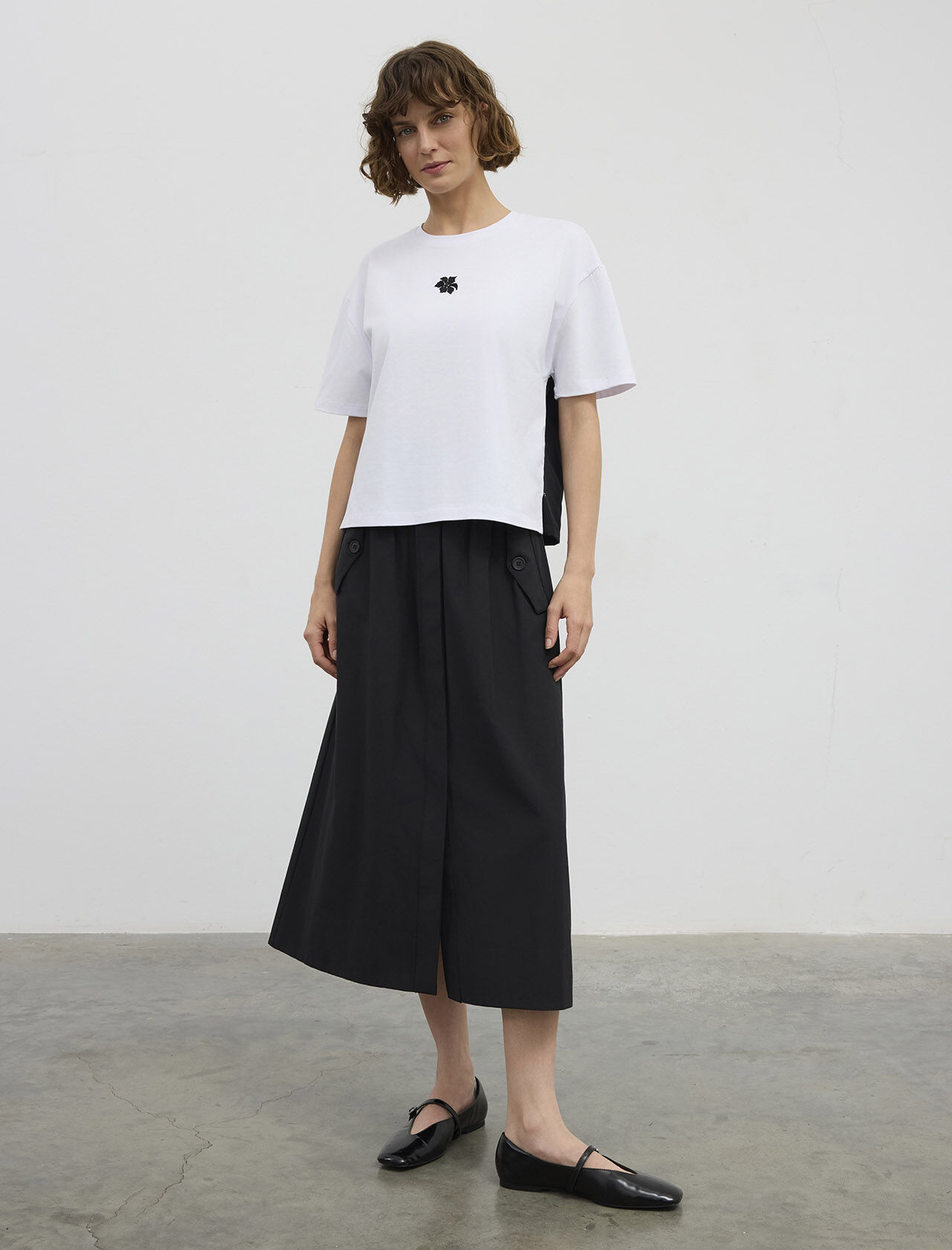 Önünde Nakış Detaylı Asimetrik Pamuk Tişört