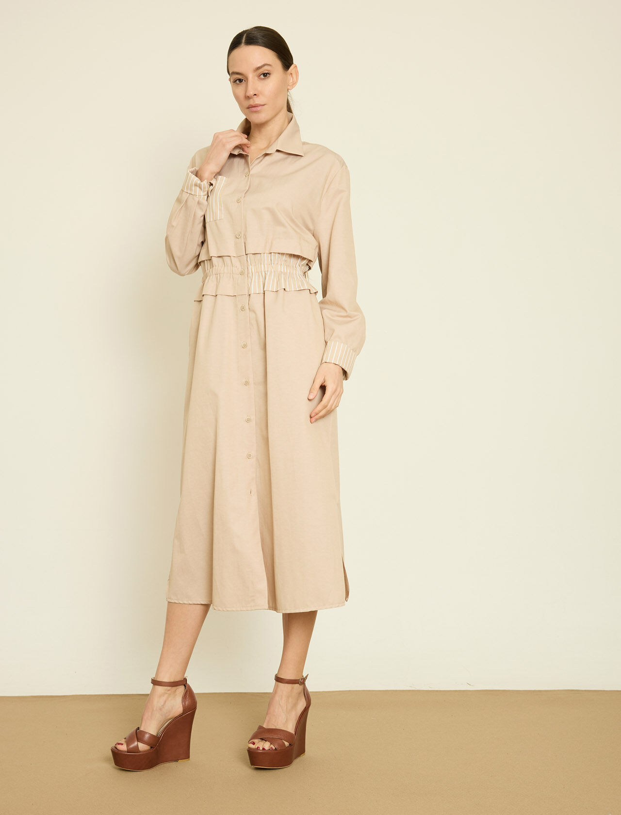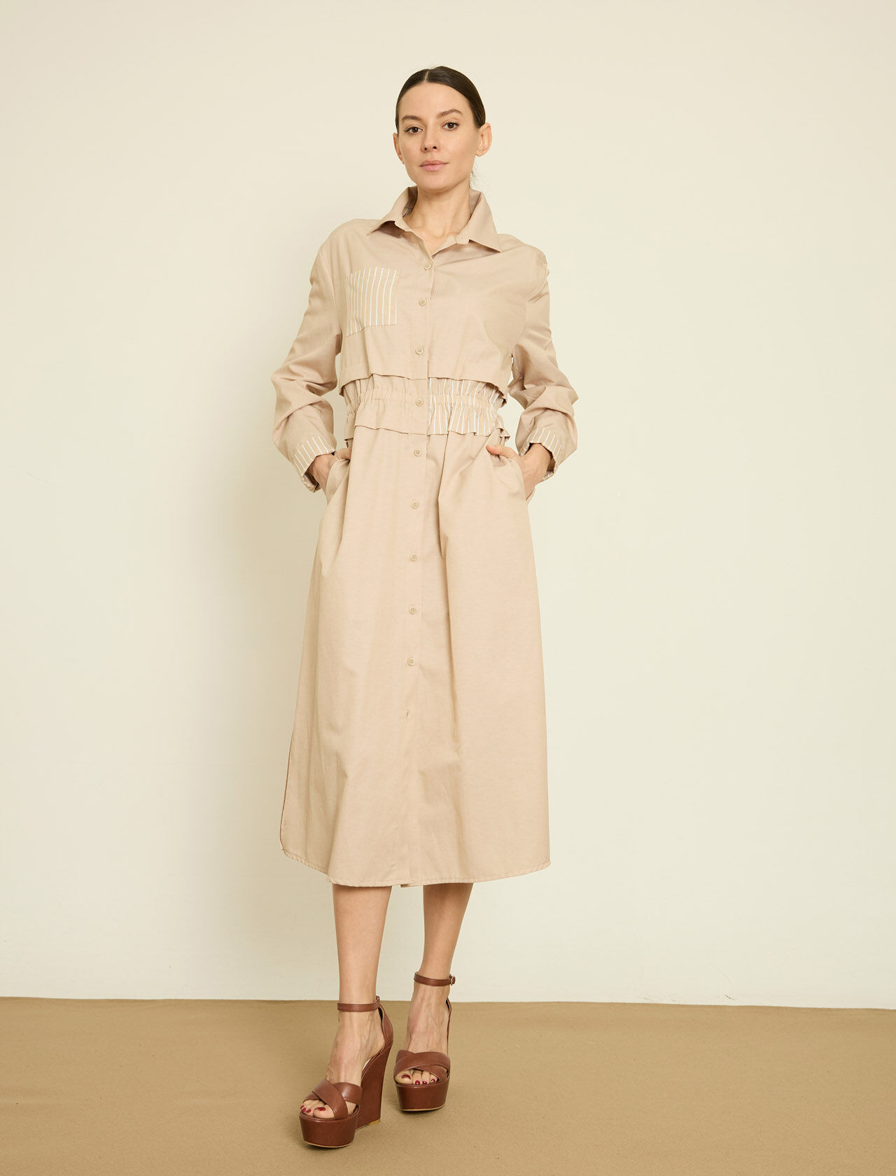 CIZGI KOMBINLI PAMUK KARISIM MIDI GOMLEK ELBISE