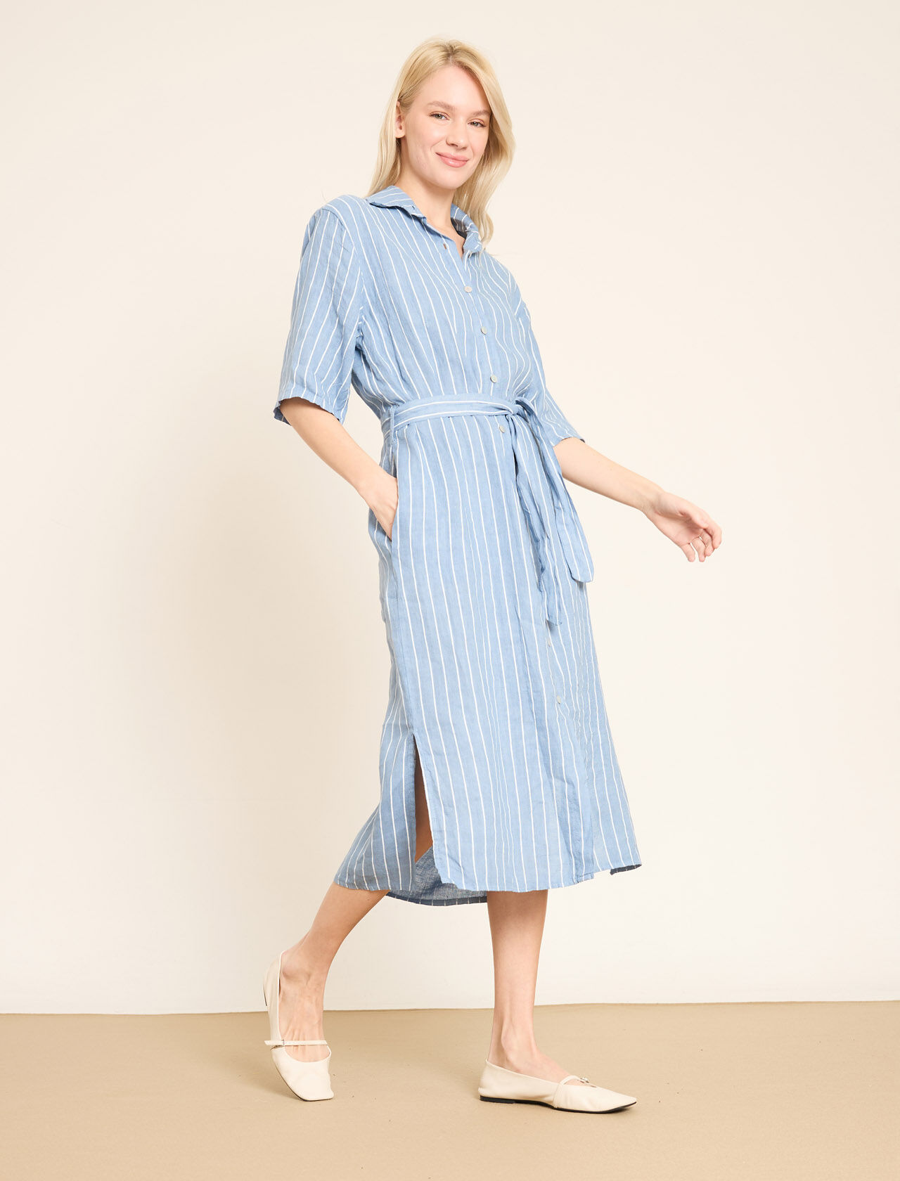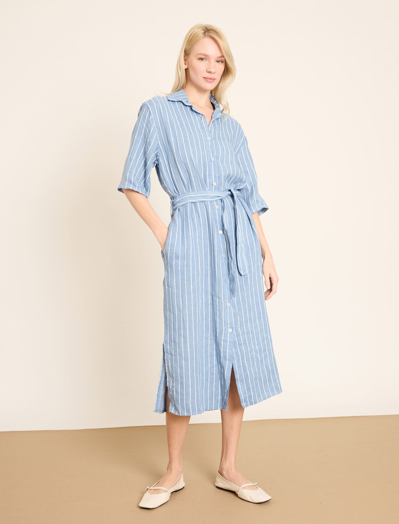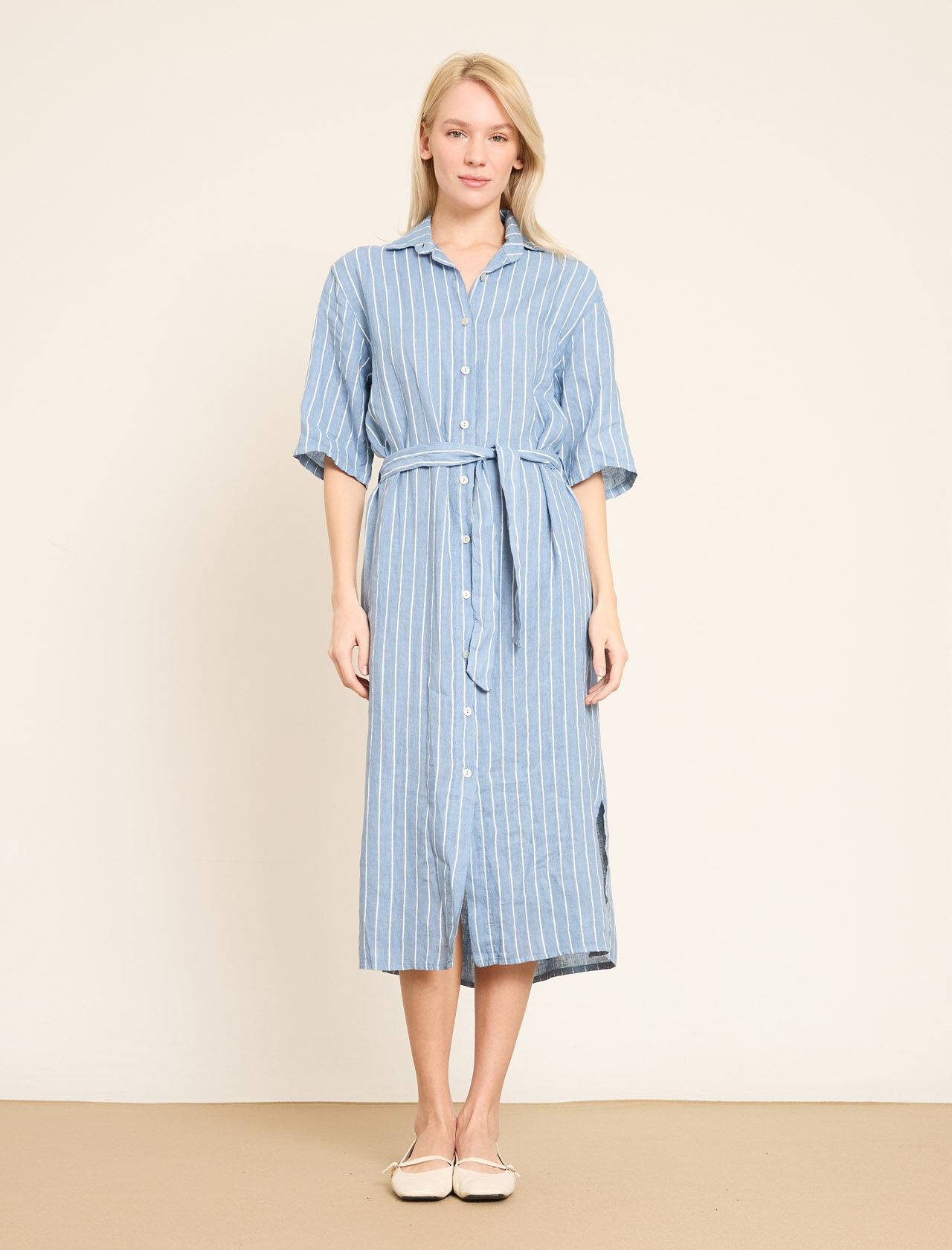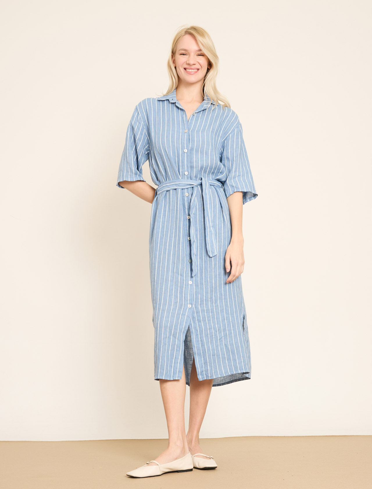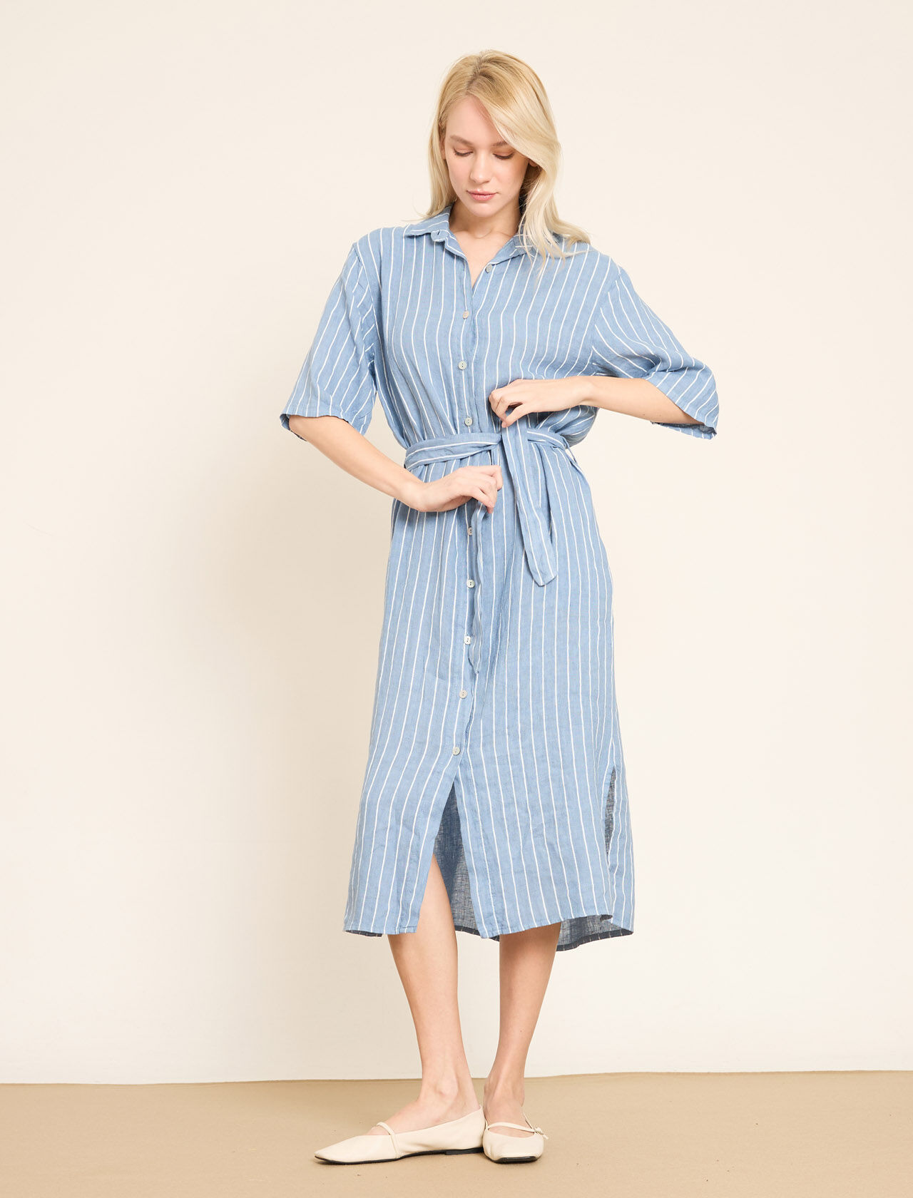 Dikey Çizgili ve Kemerli Keten Gömlek Elbise