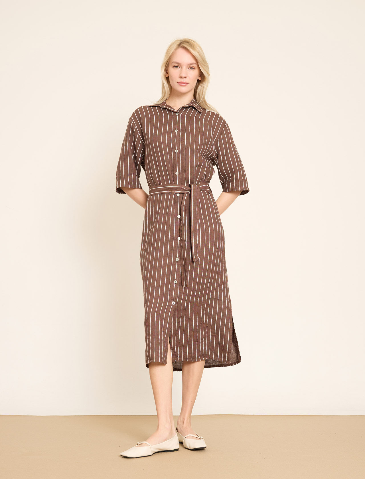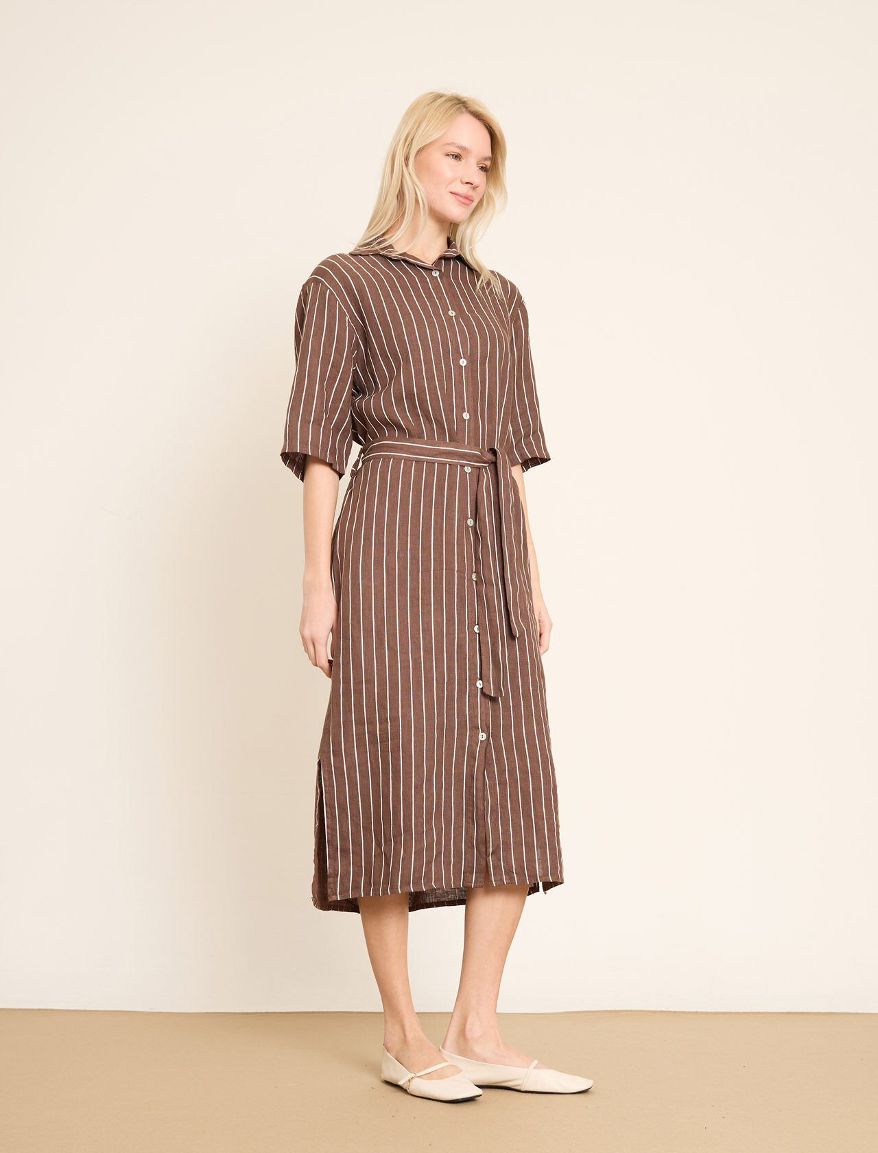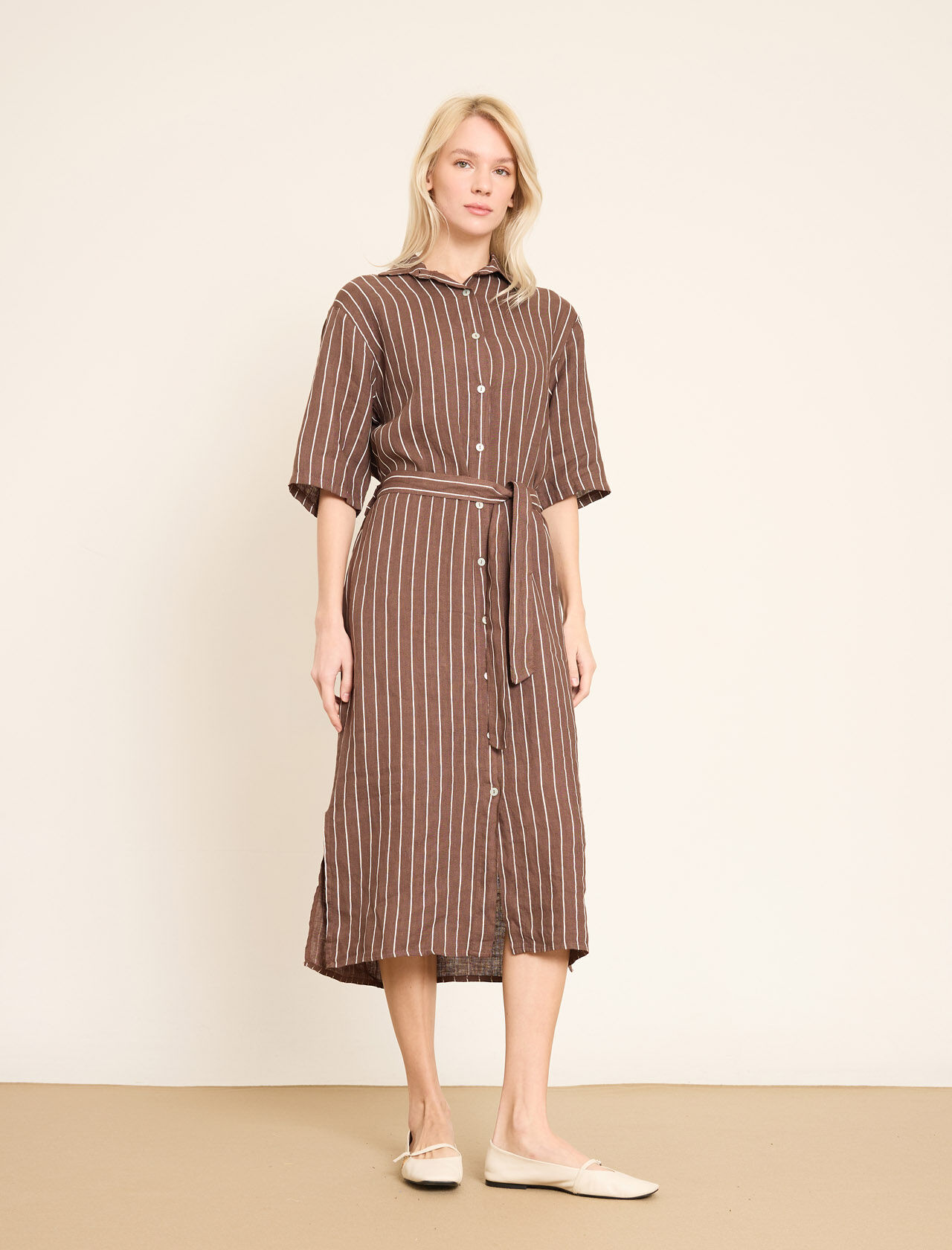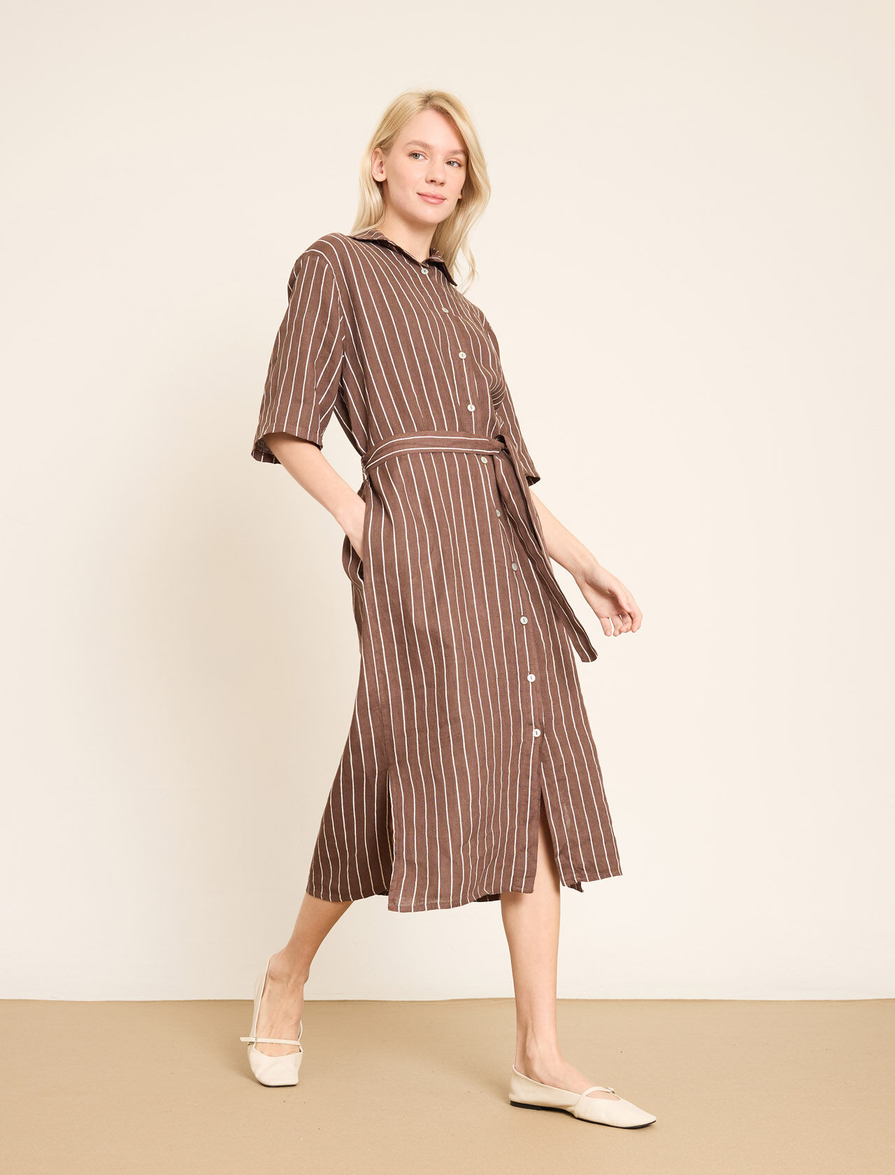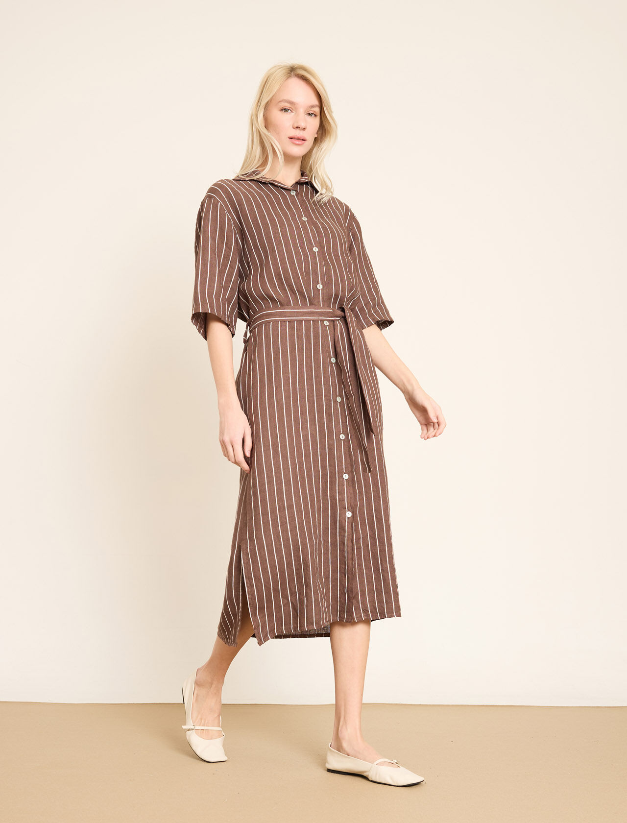 Dikey Çizgili ve Kemerli Keten Gömlek Elbise