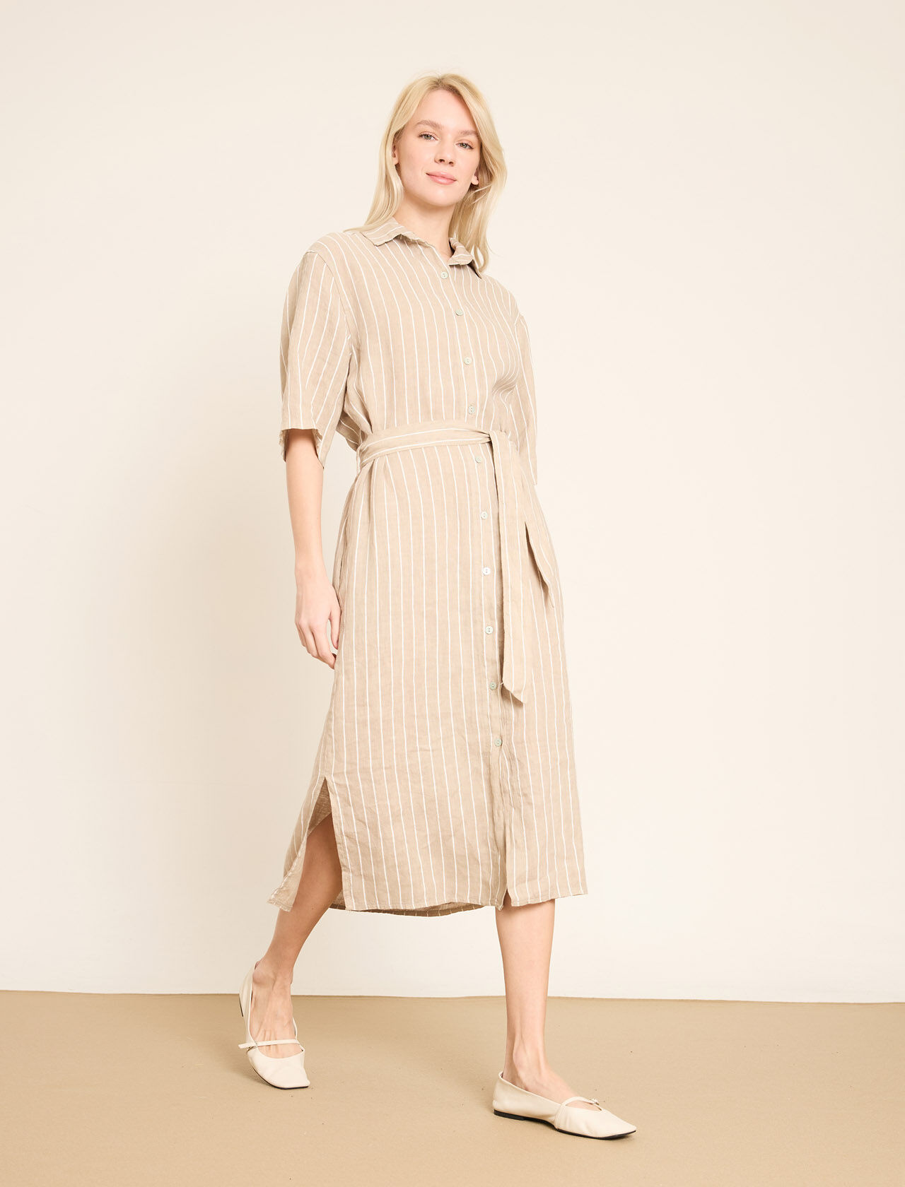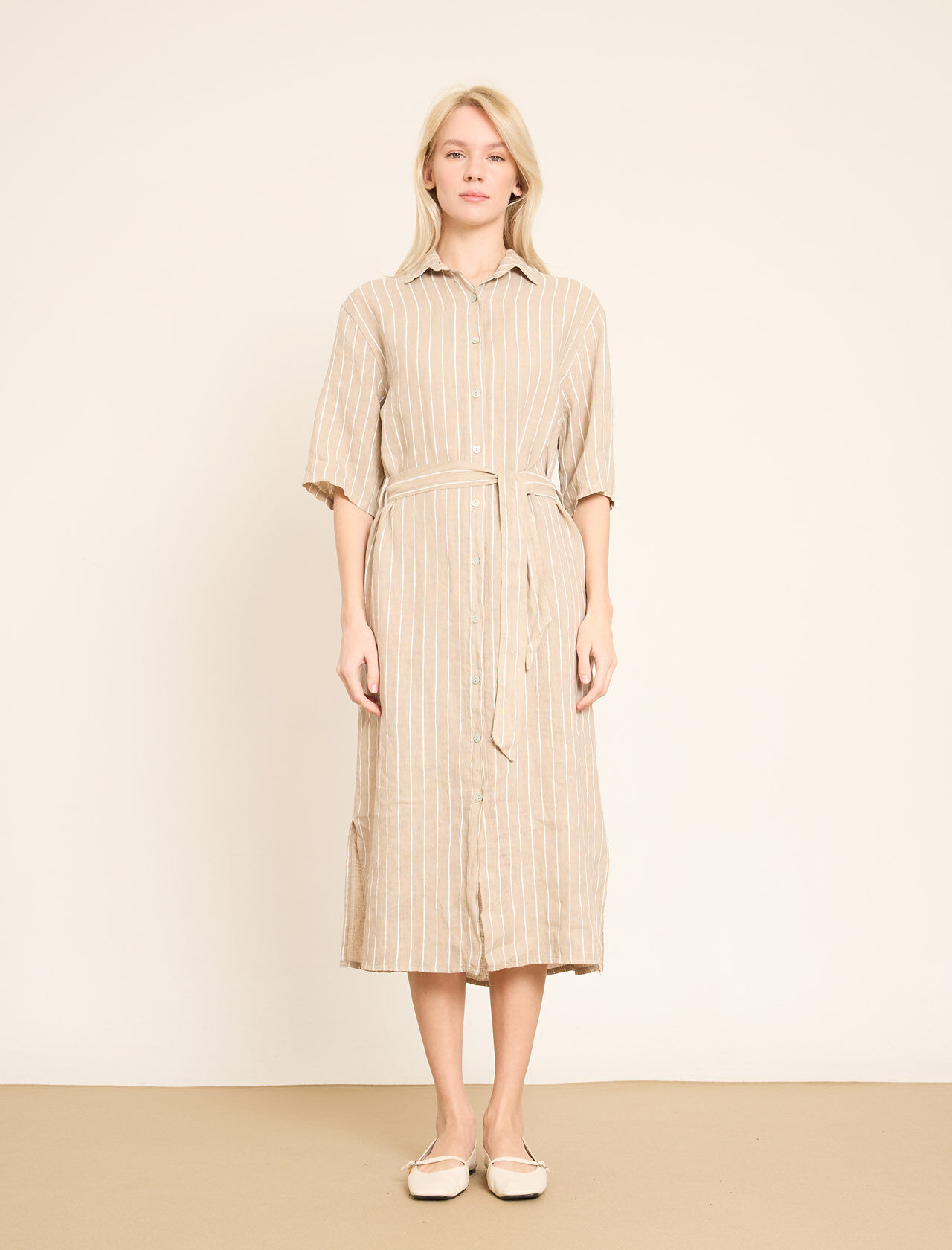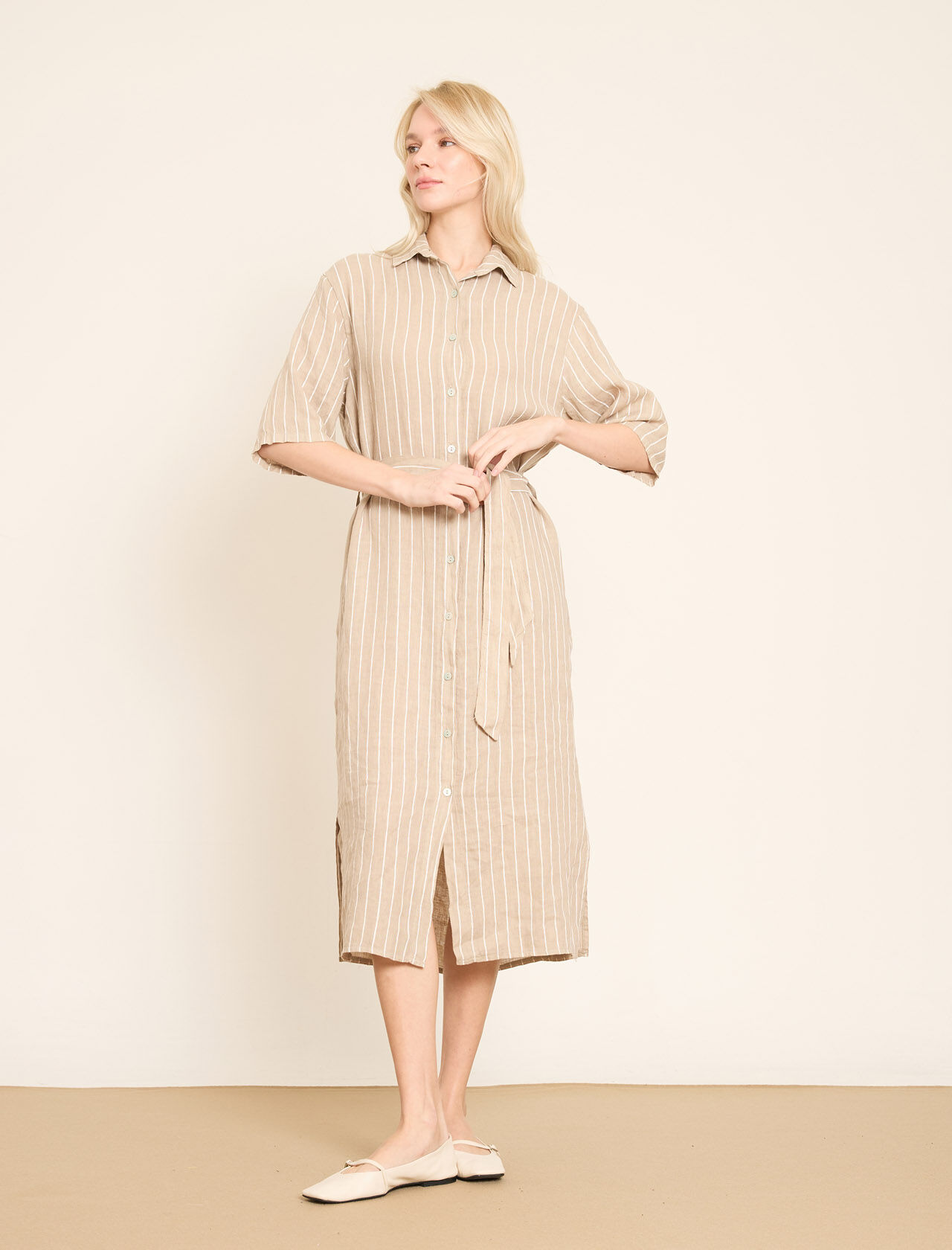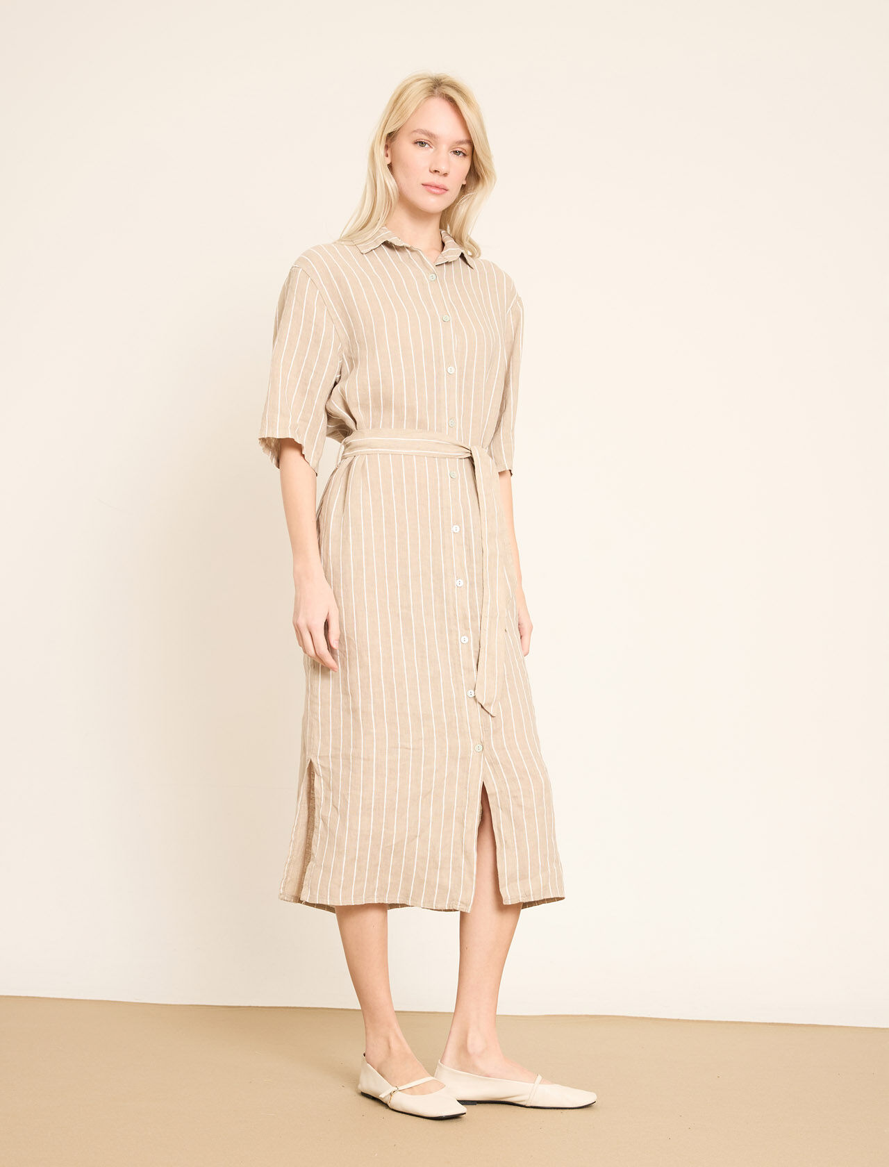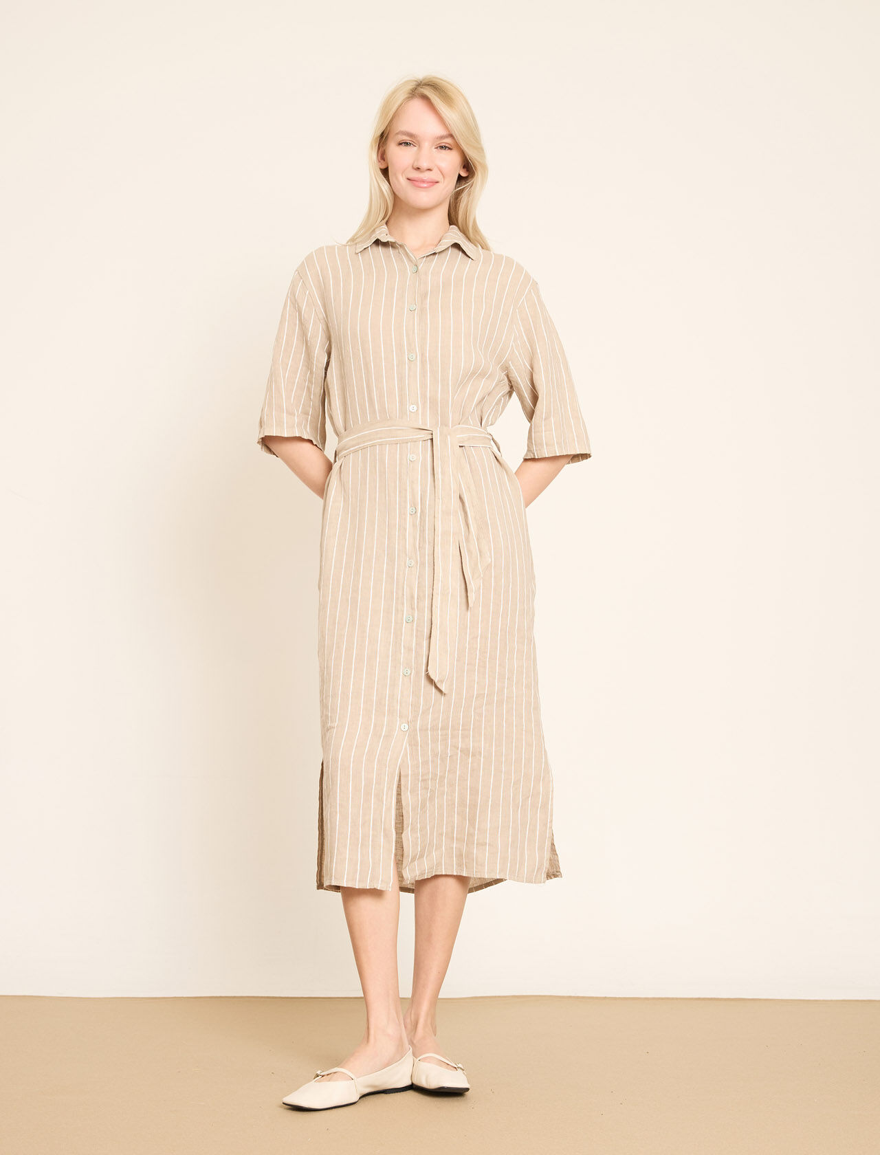 Dikey Çizgili ve Kemerli Keten Gömlek Elbise
