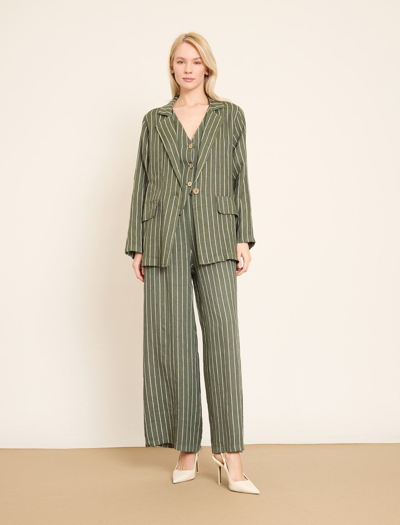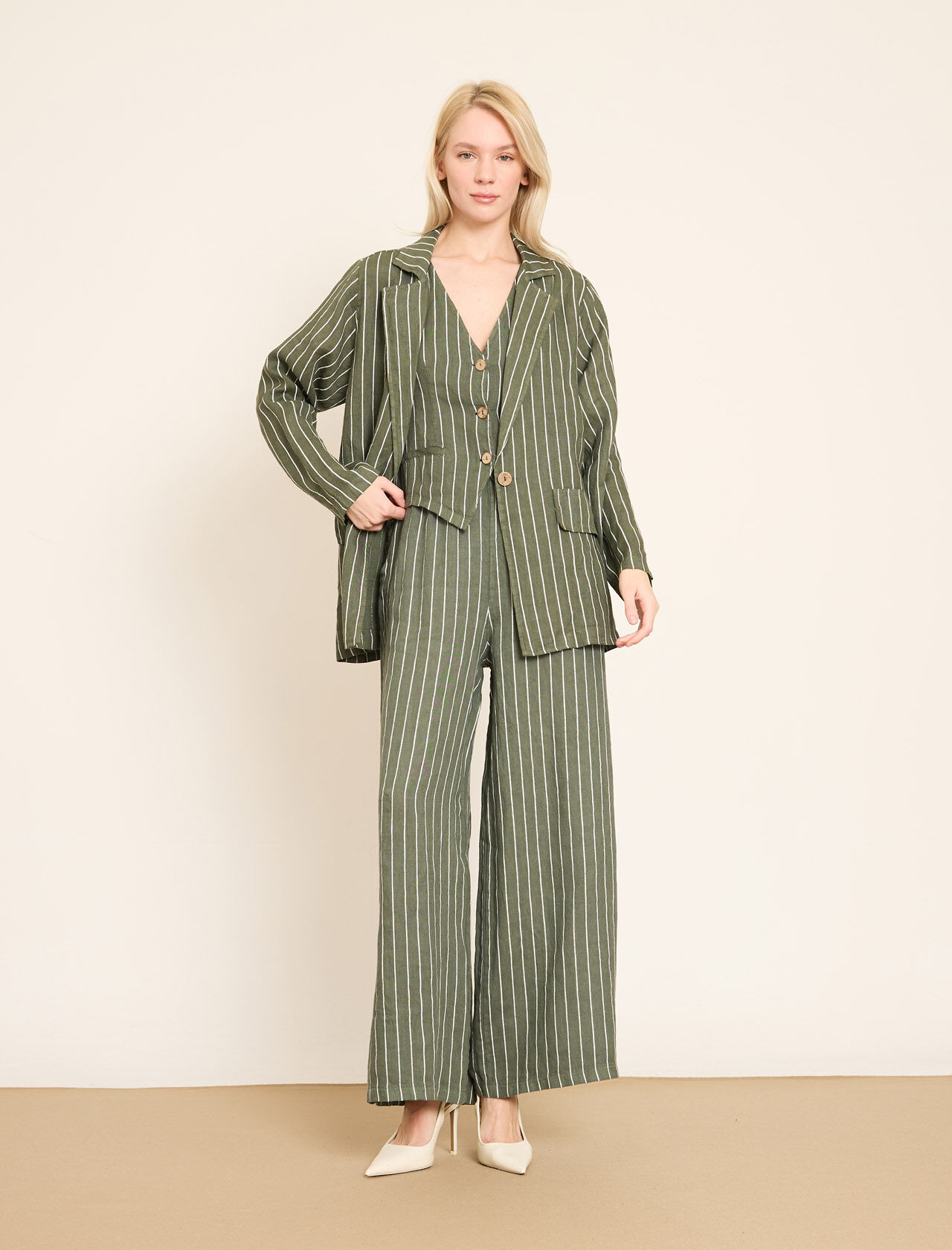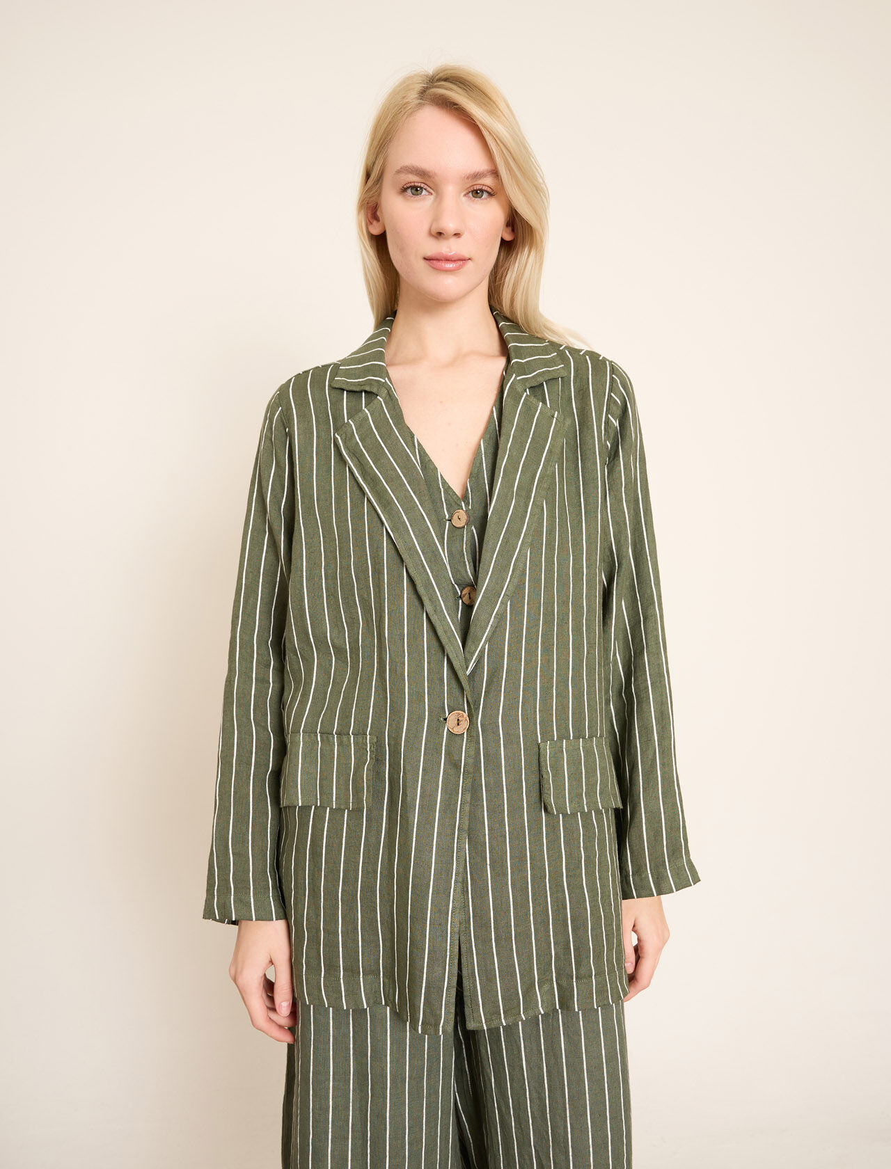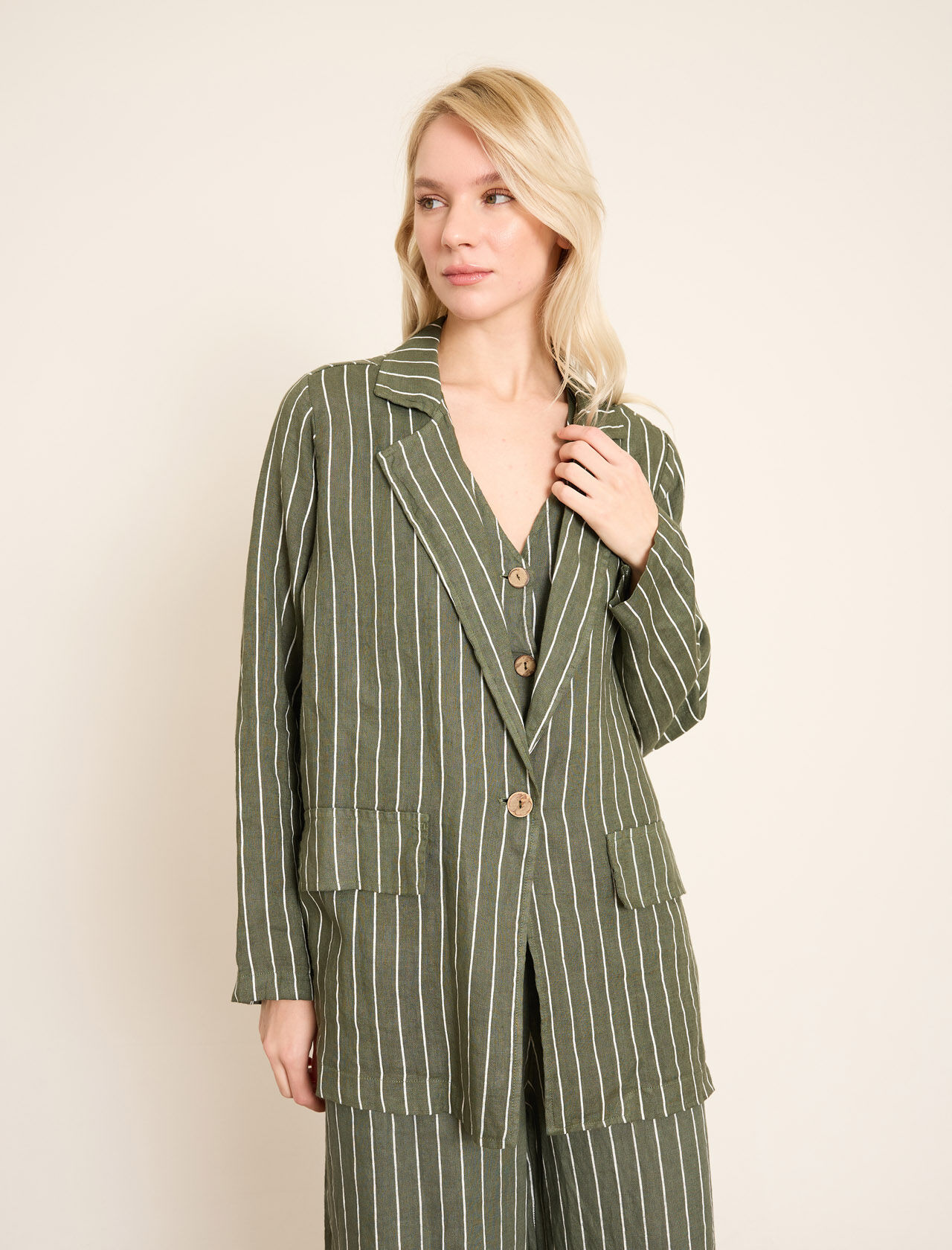 Düğmeli ve Ön Cepli Çizgili Keten Blazer