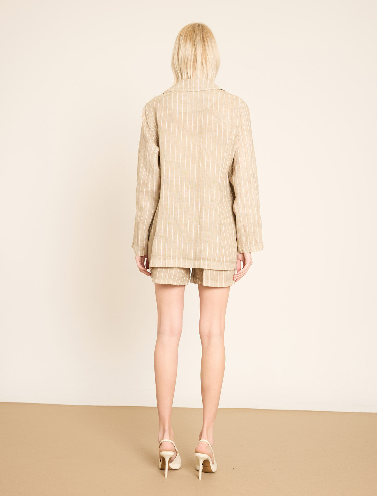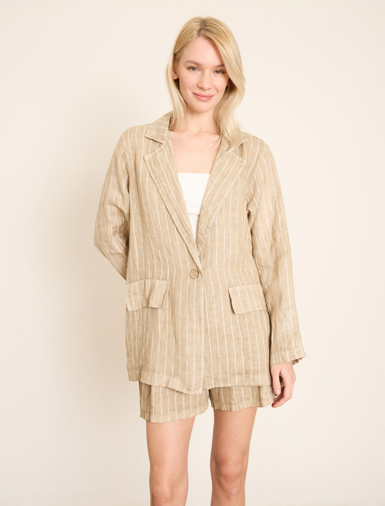 Düğmeli ve Ön Cepli Çizgili Keten Blazer