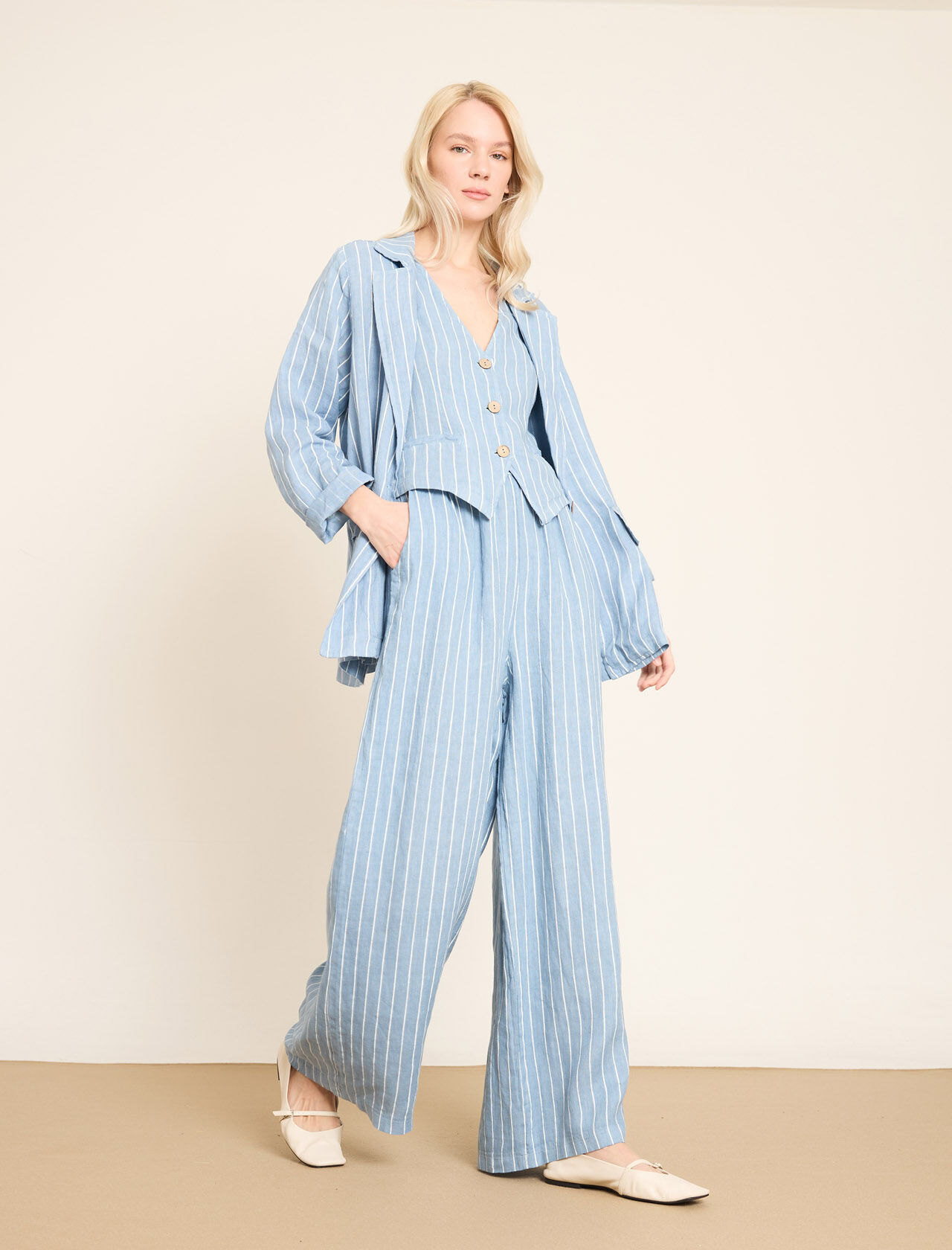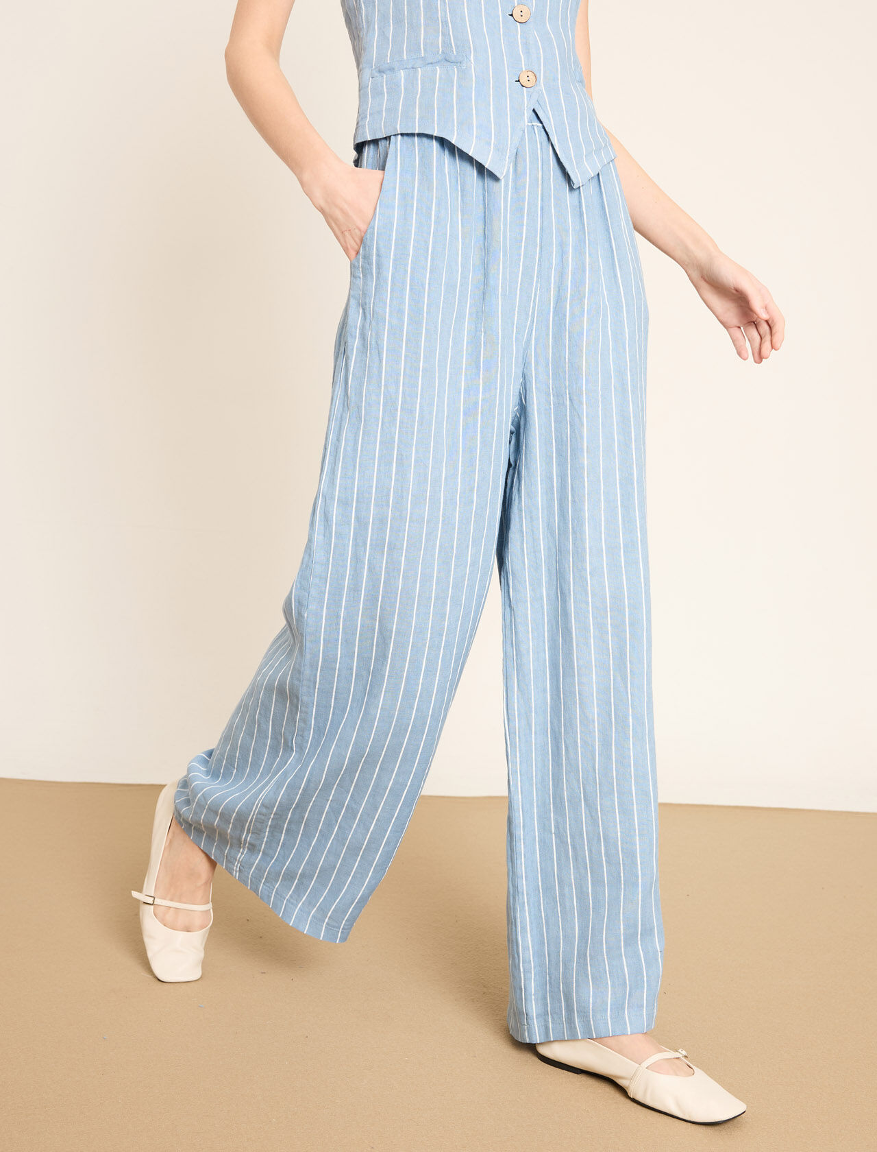 Geniş Paça Lastikli Bel Detaylı Çizgili Keten Pant
