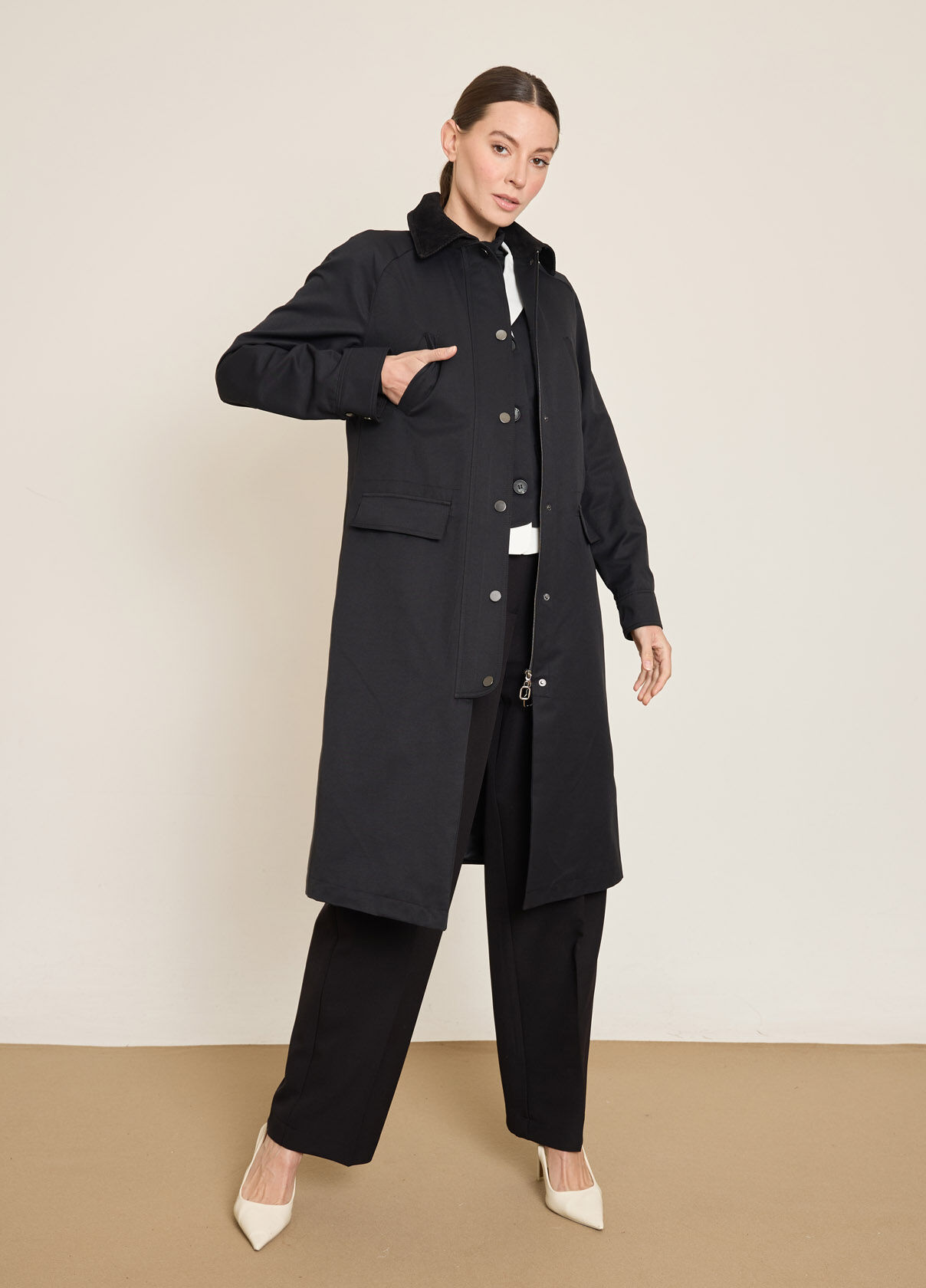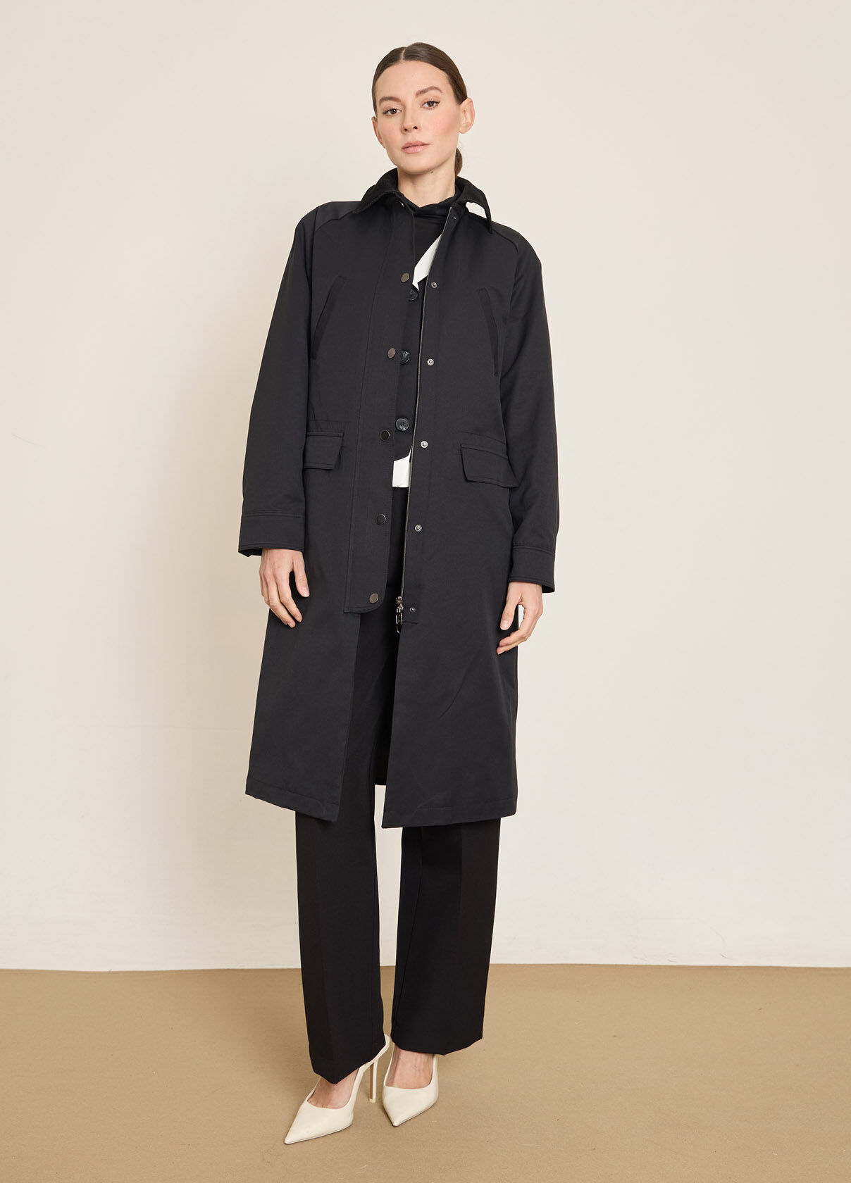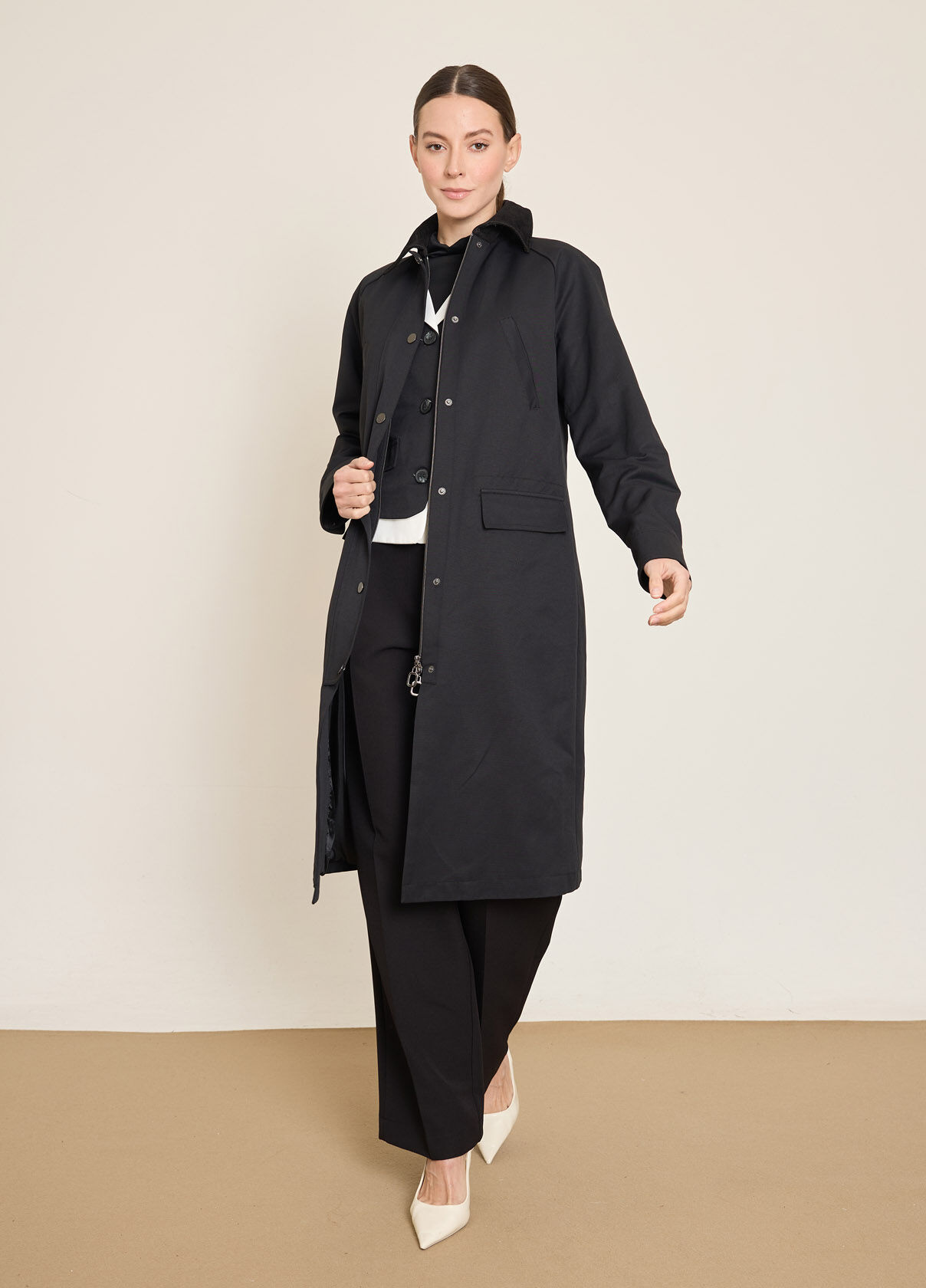 KADIFE YAKALI FERMUARLI UZUN TRENCKOT