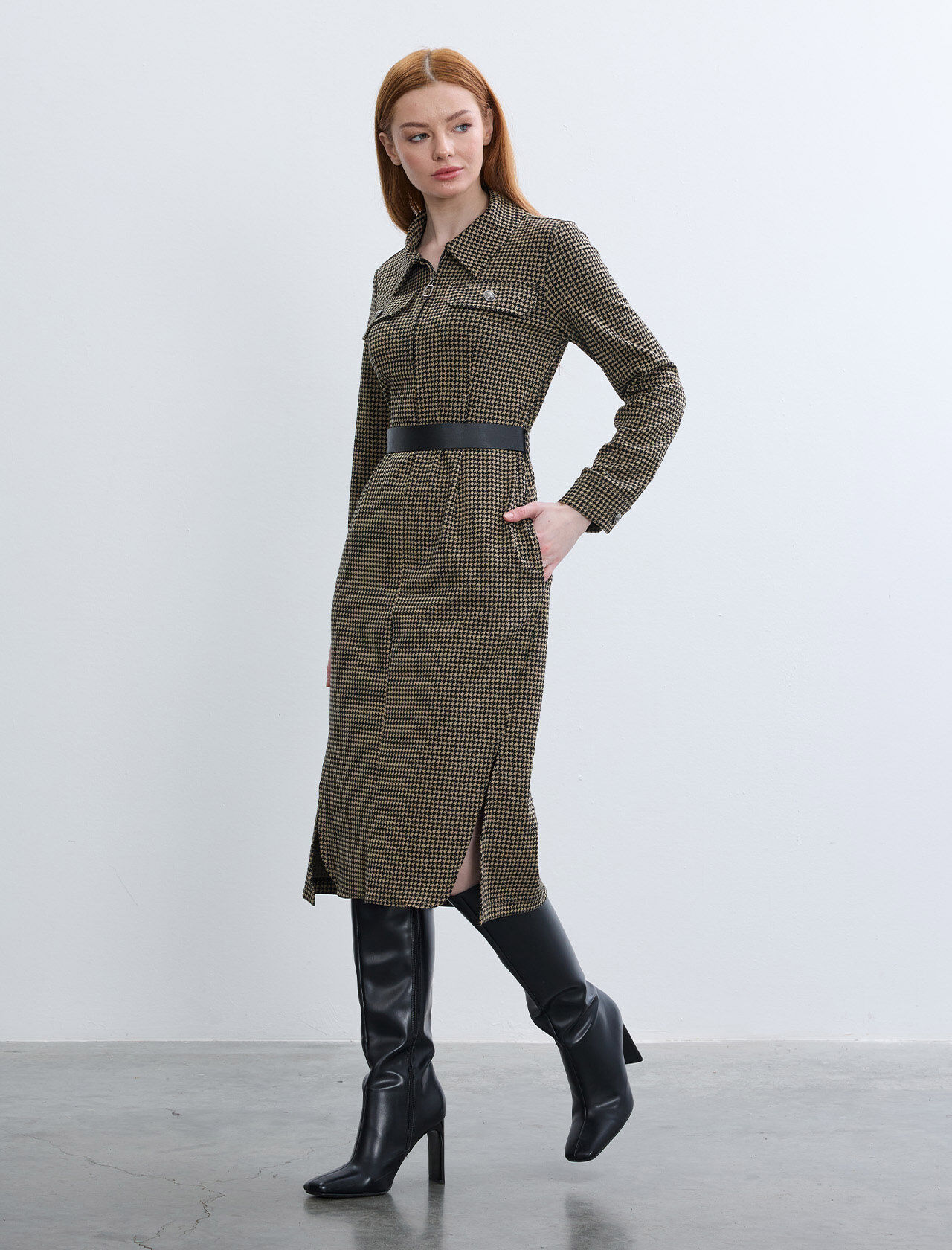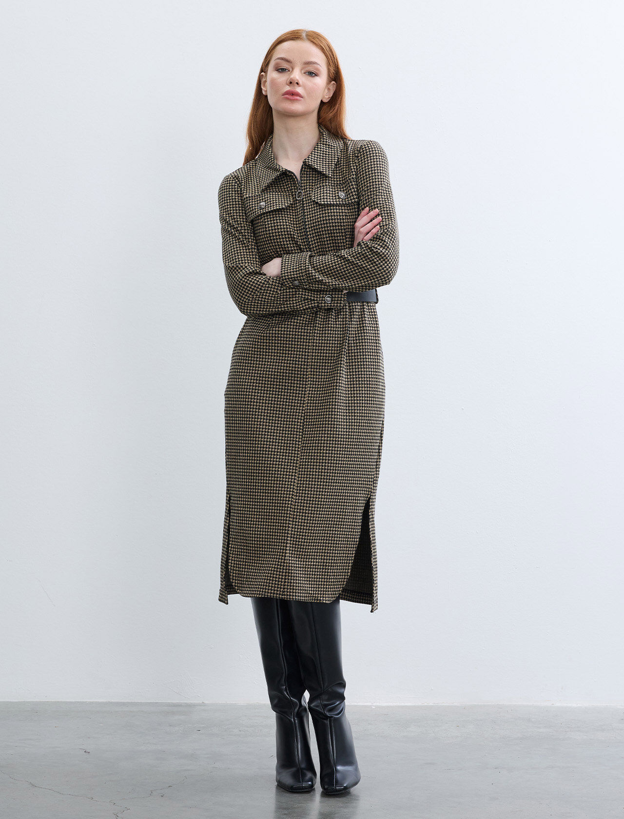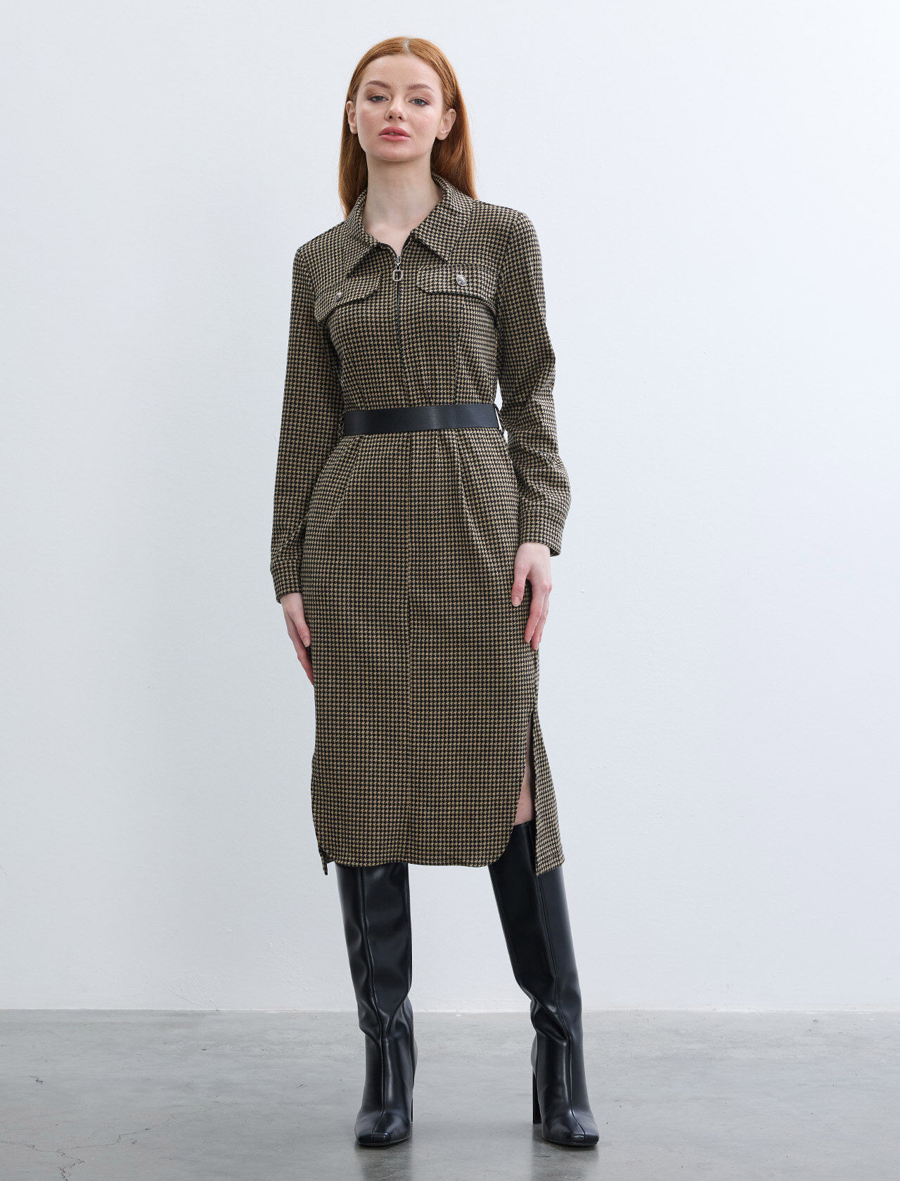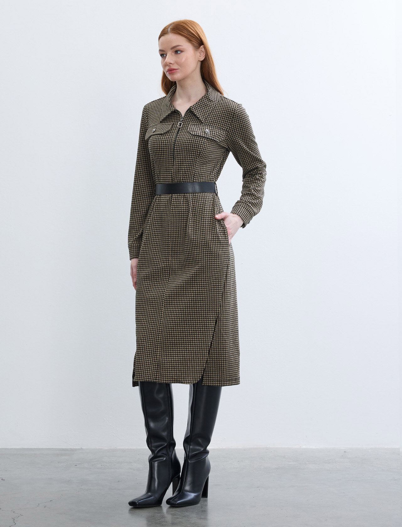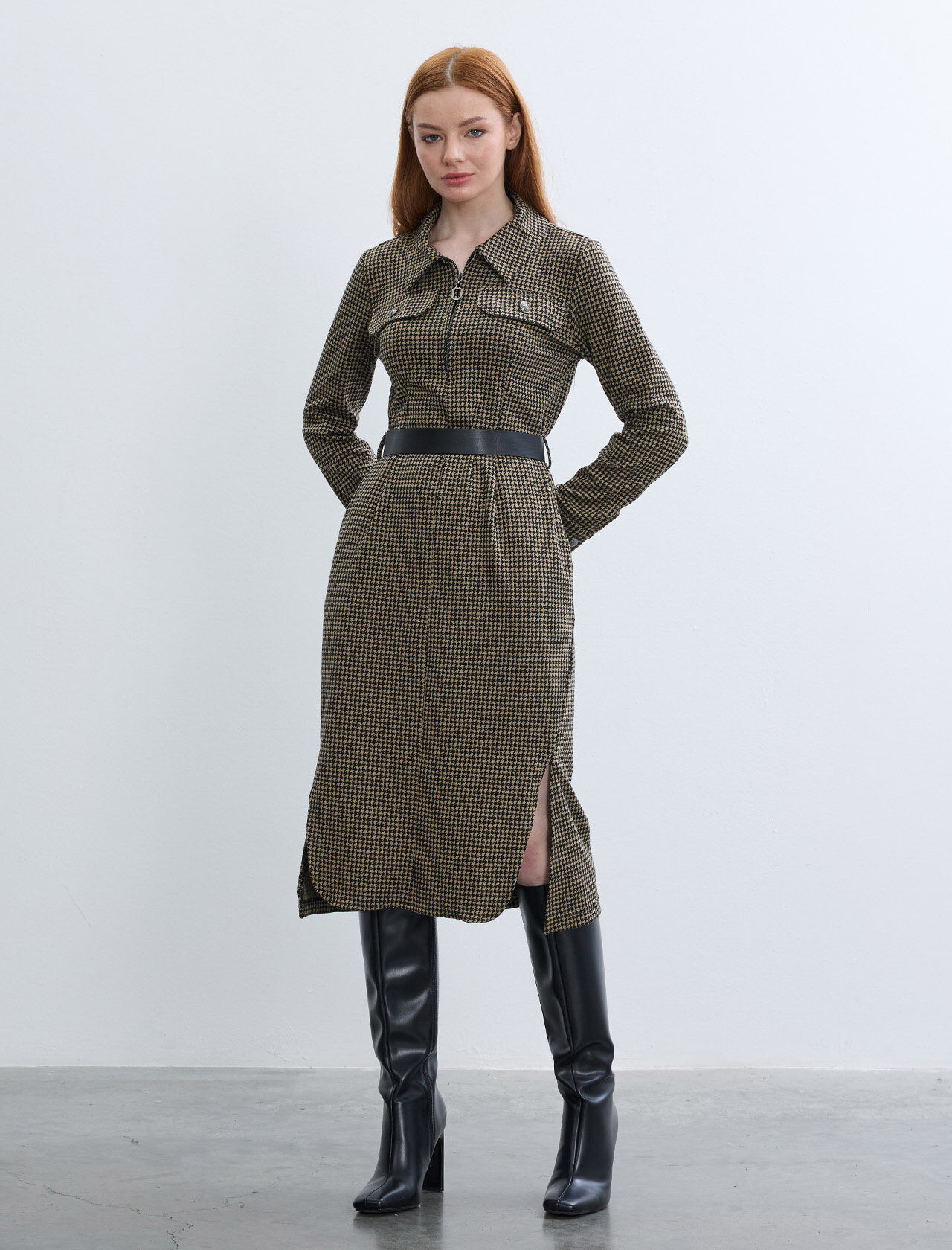 KAZAYAGI DESEN CEP DETAYLI YAKASI FERMUARLI ELBISE