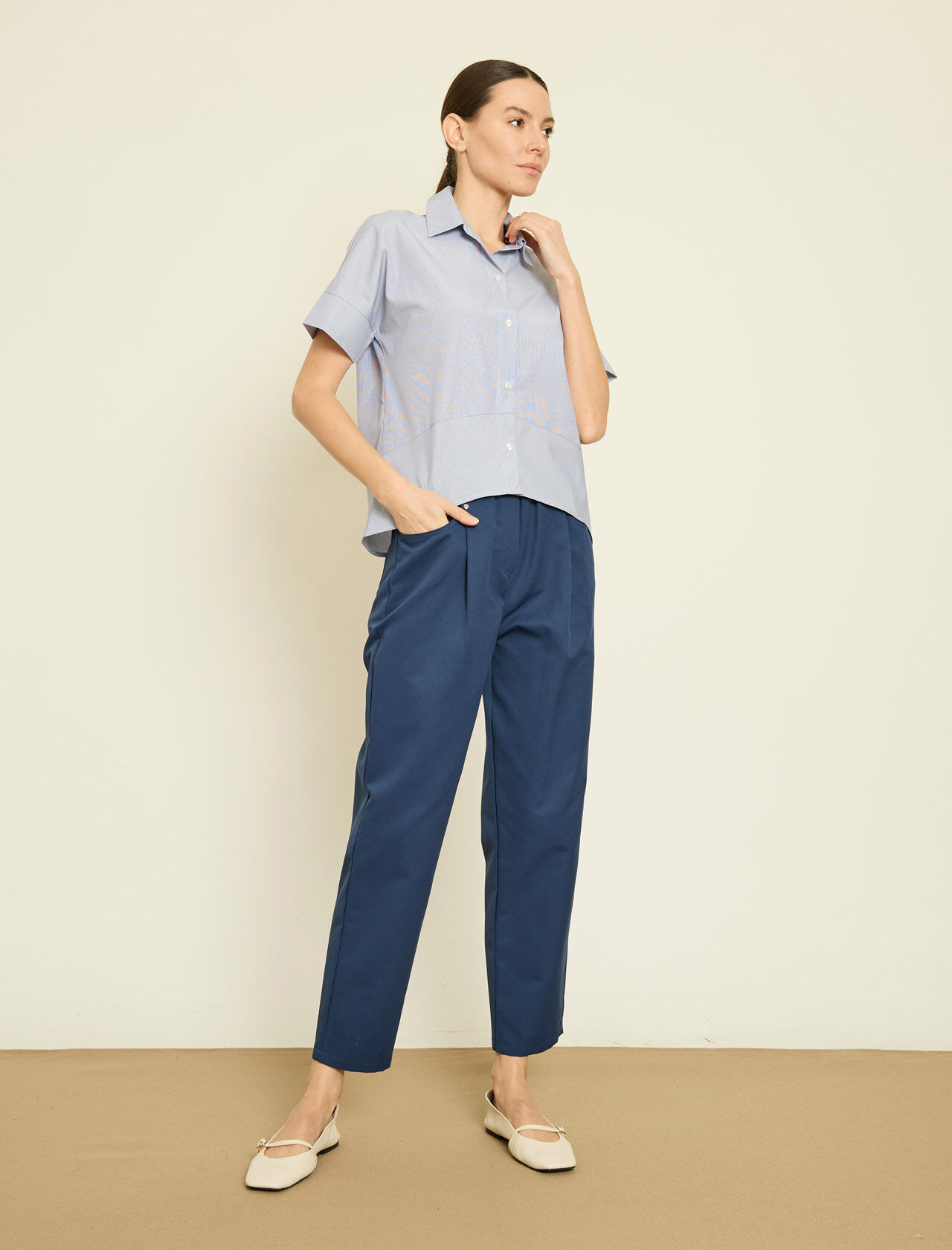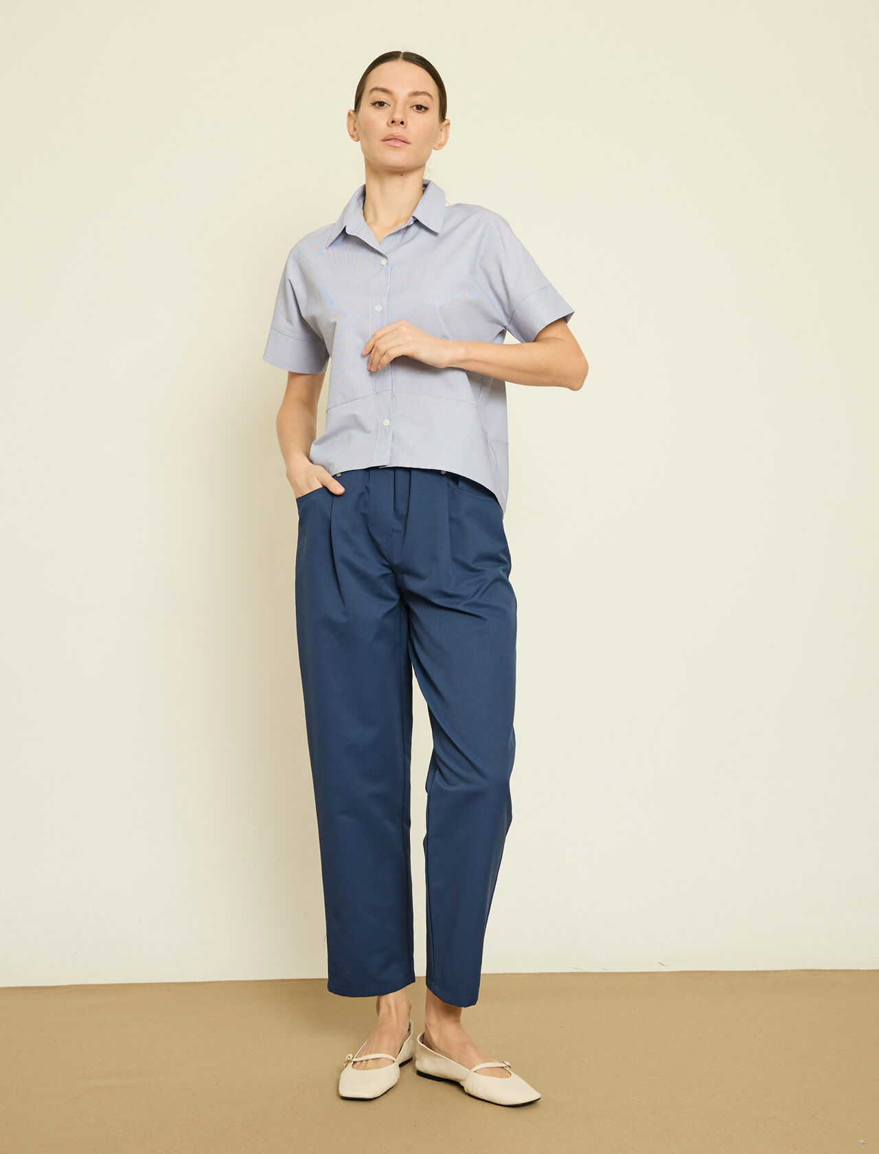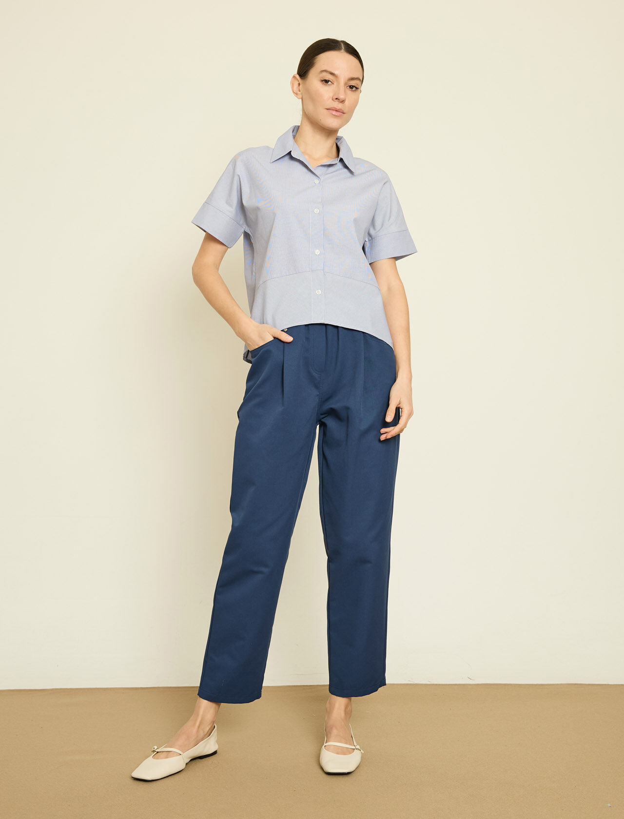 PİLE DETAYLI KISA KOLLU PAMUK KARISIM GOMLEK