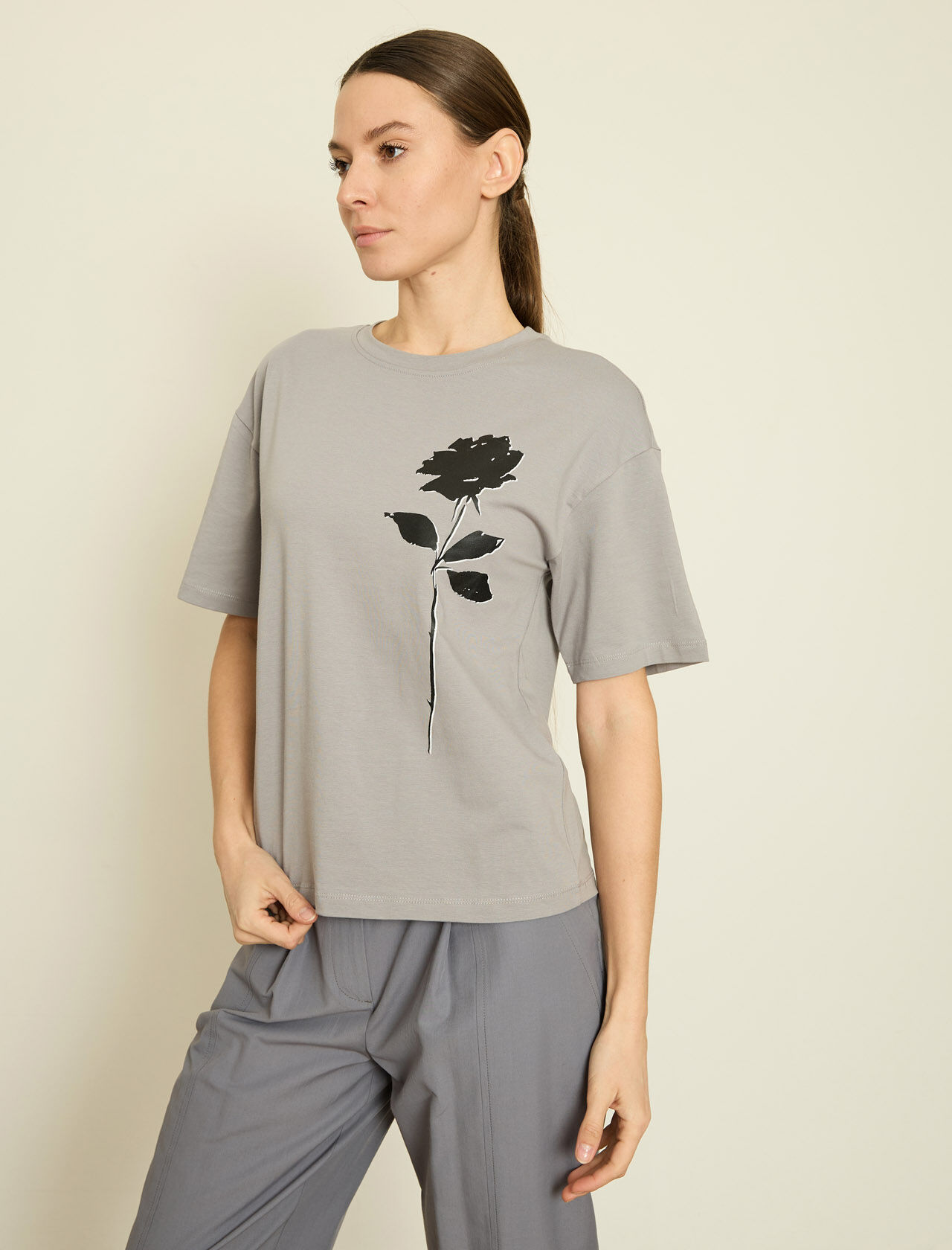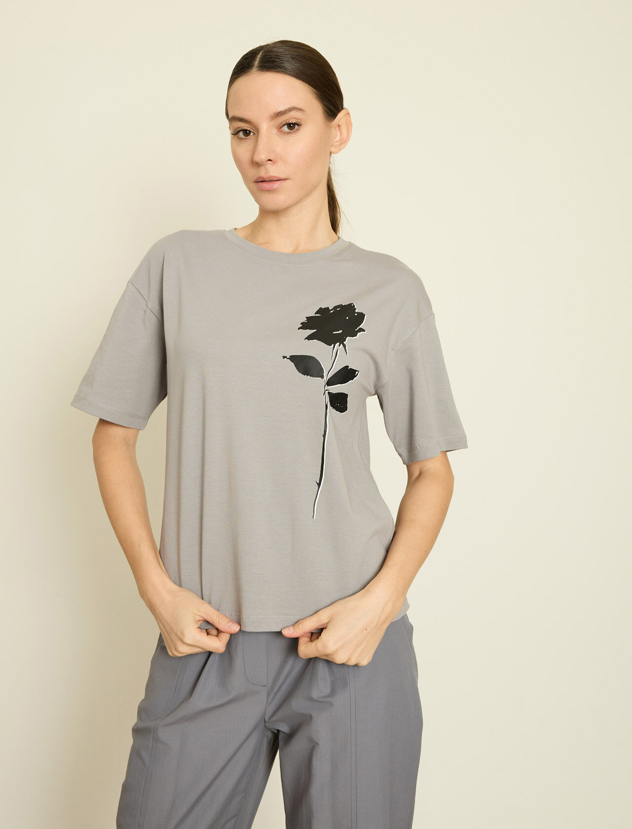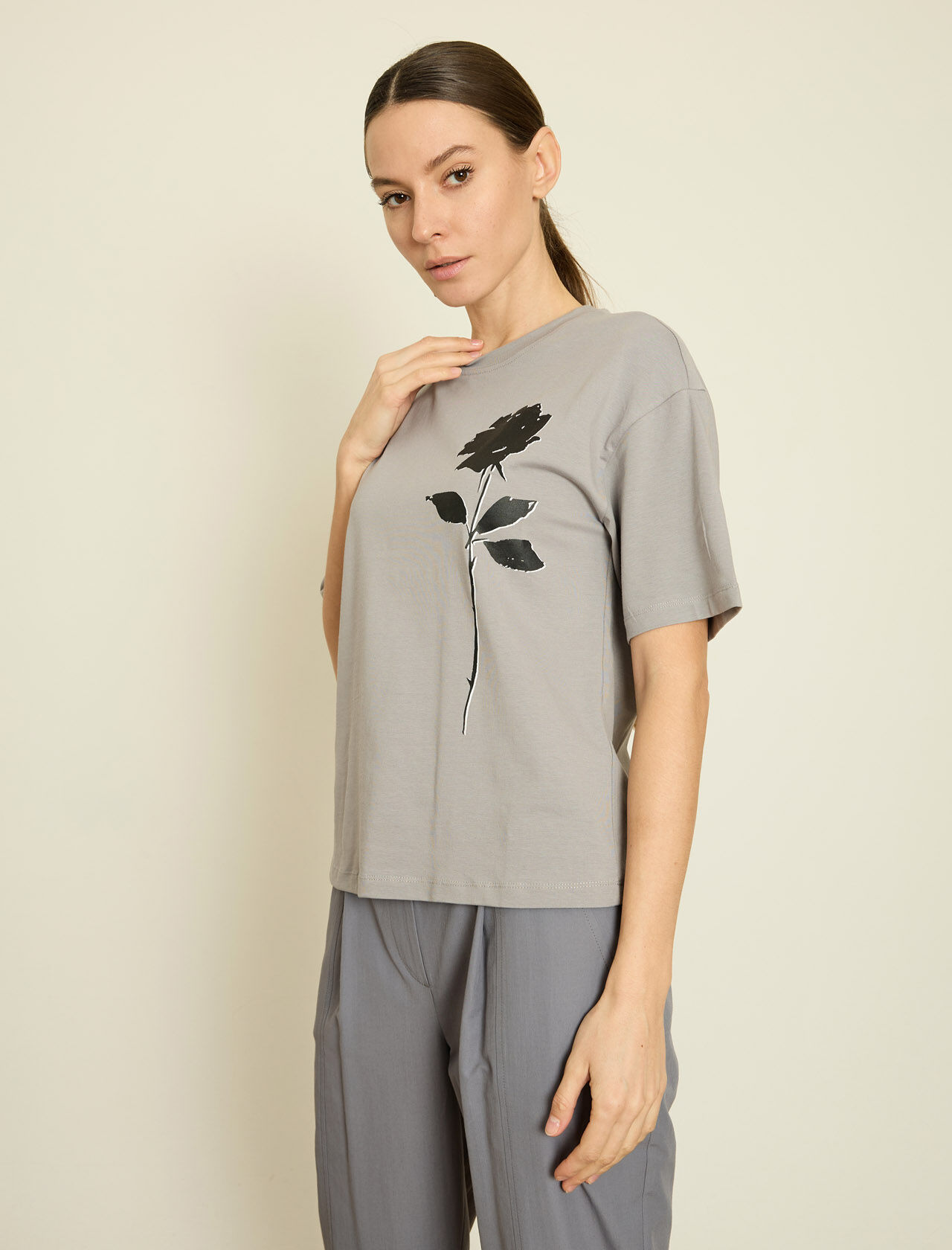 KONTRAST CICEK BASKILI T-SHIRT