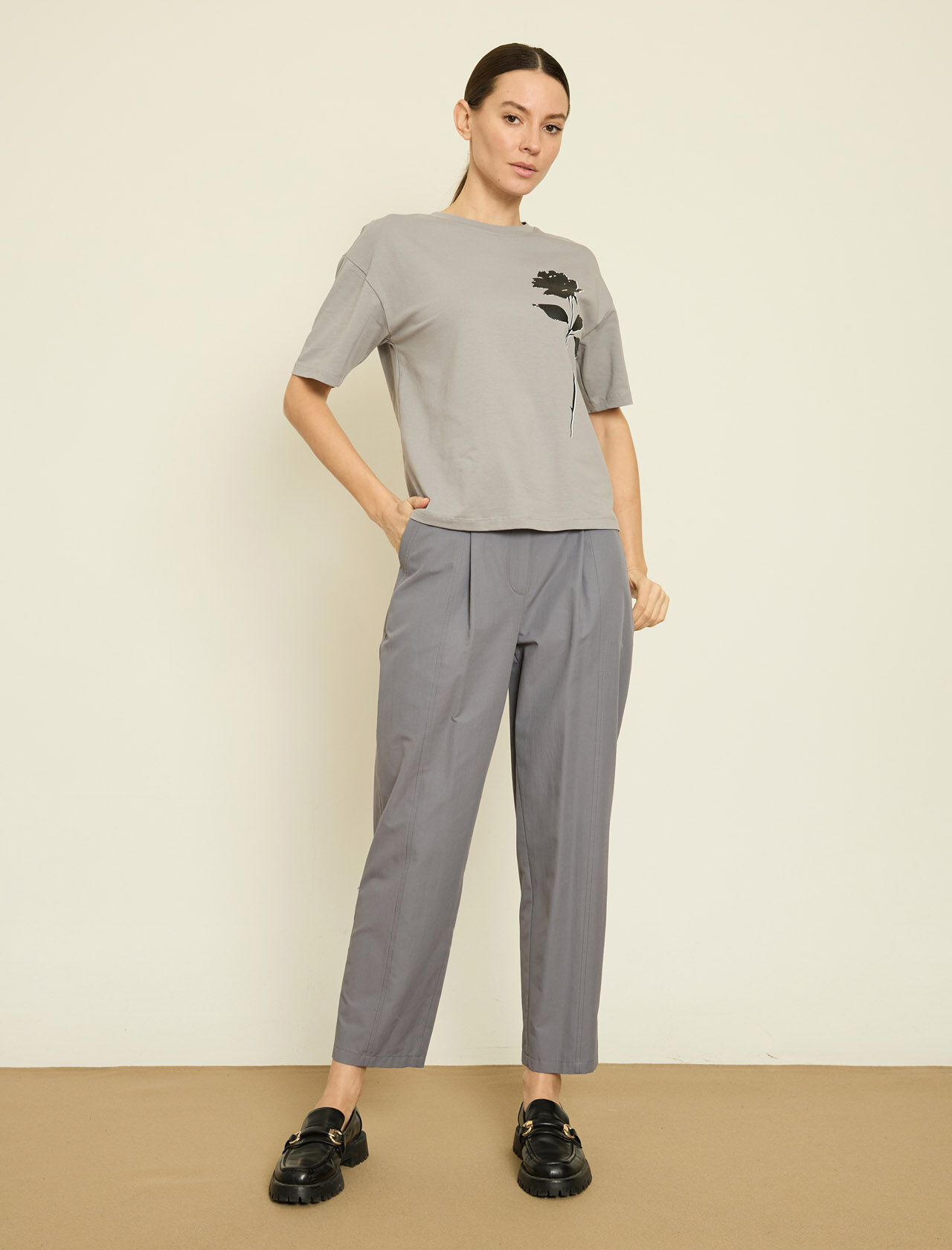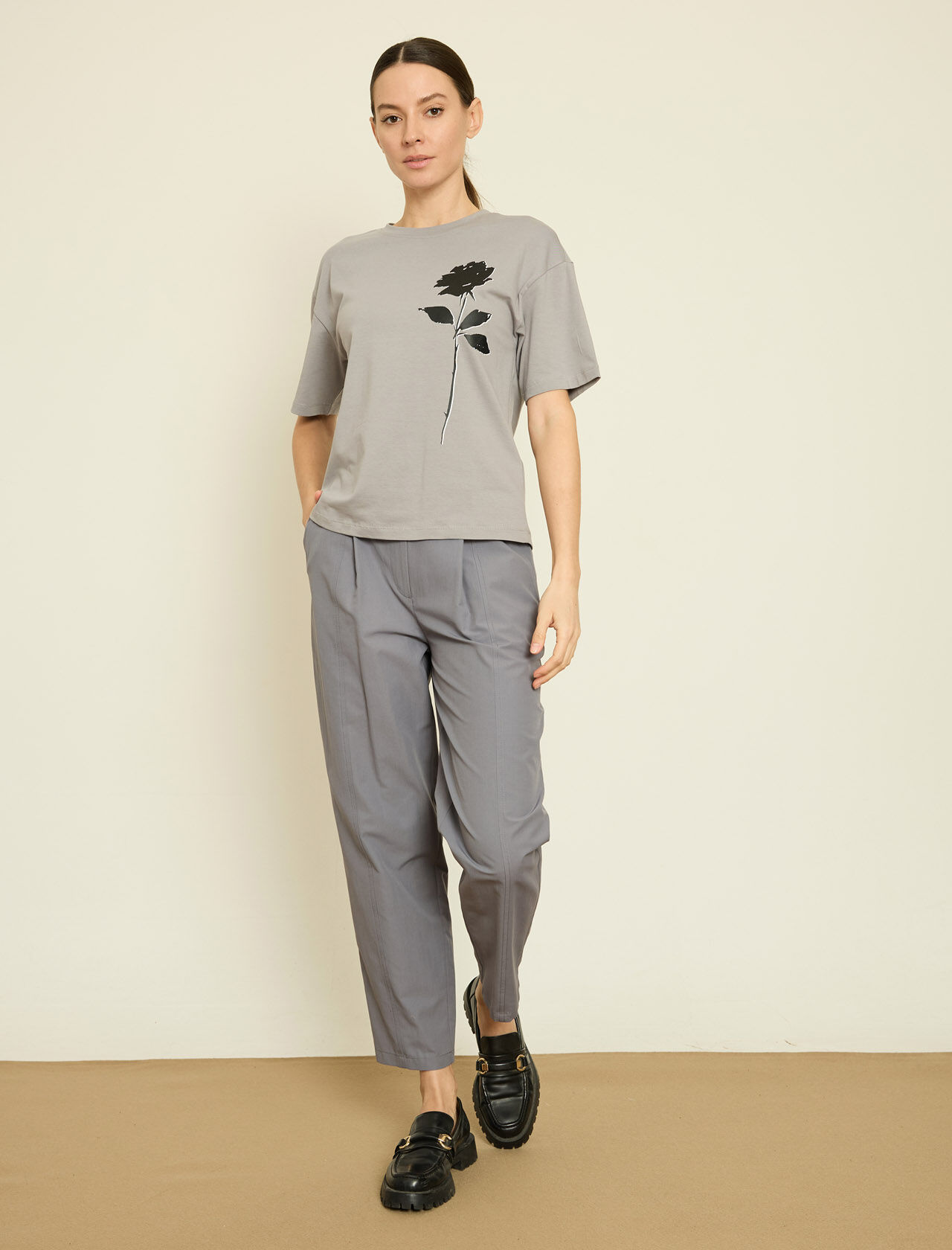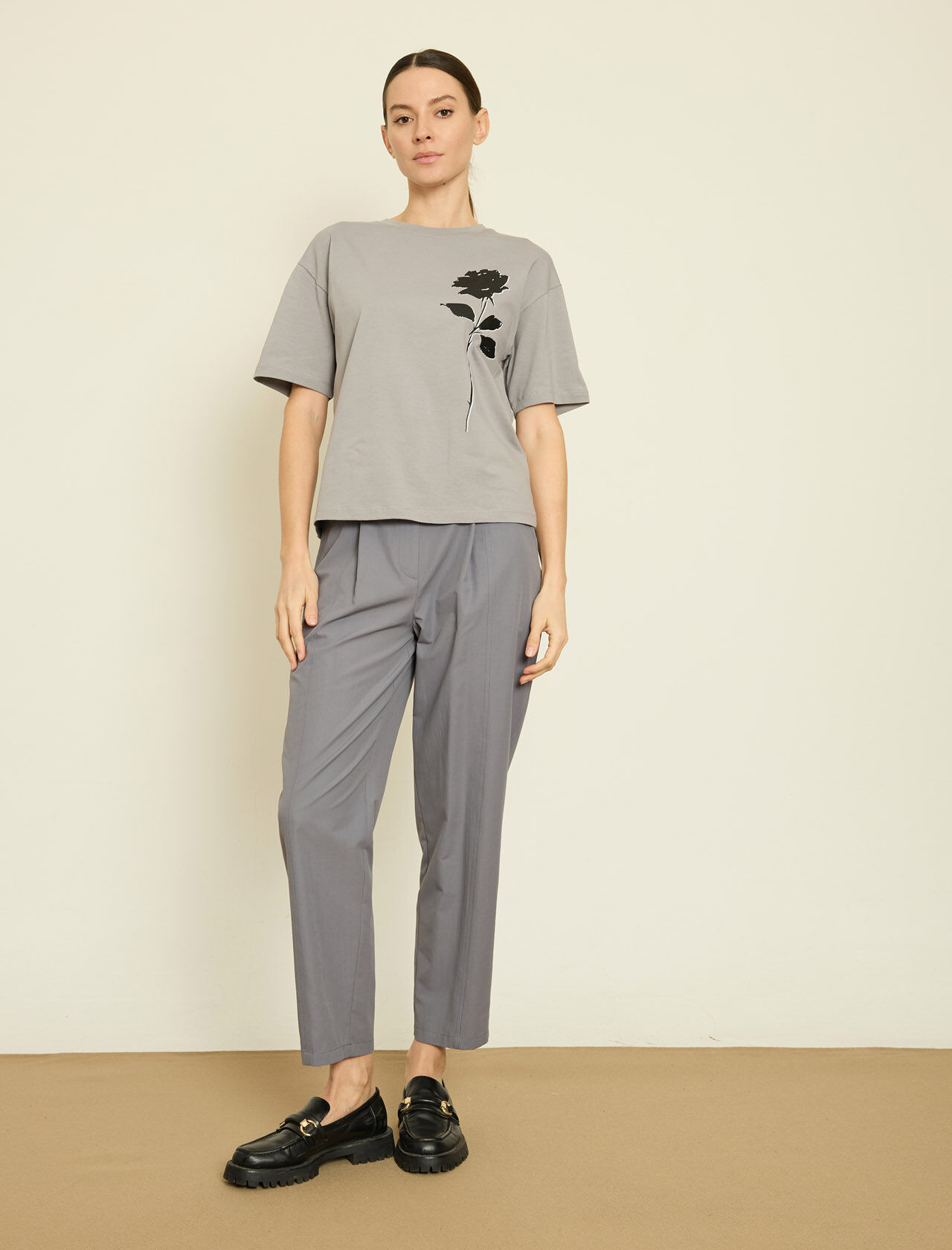 KONTRAST CICEK BASKILI T-SHIRT