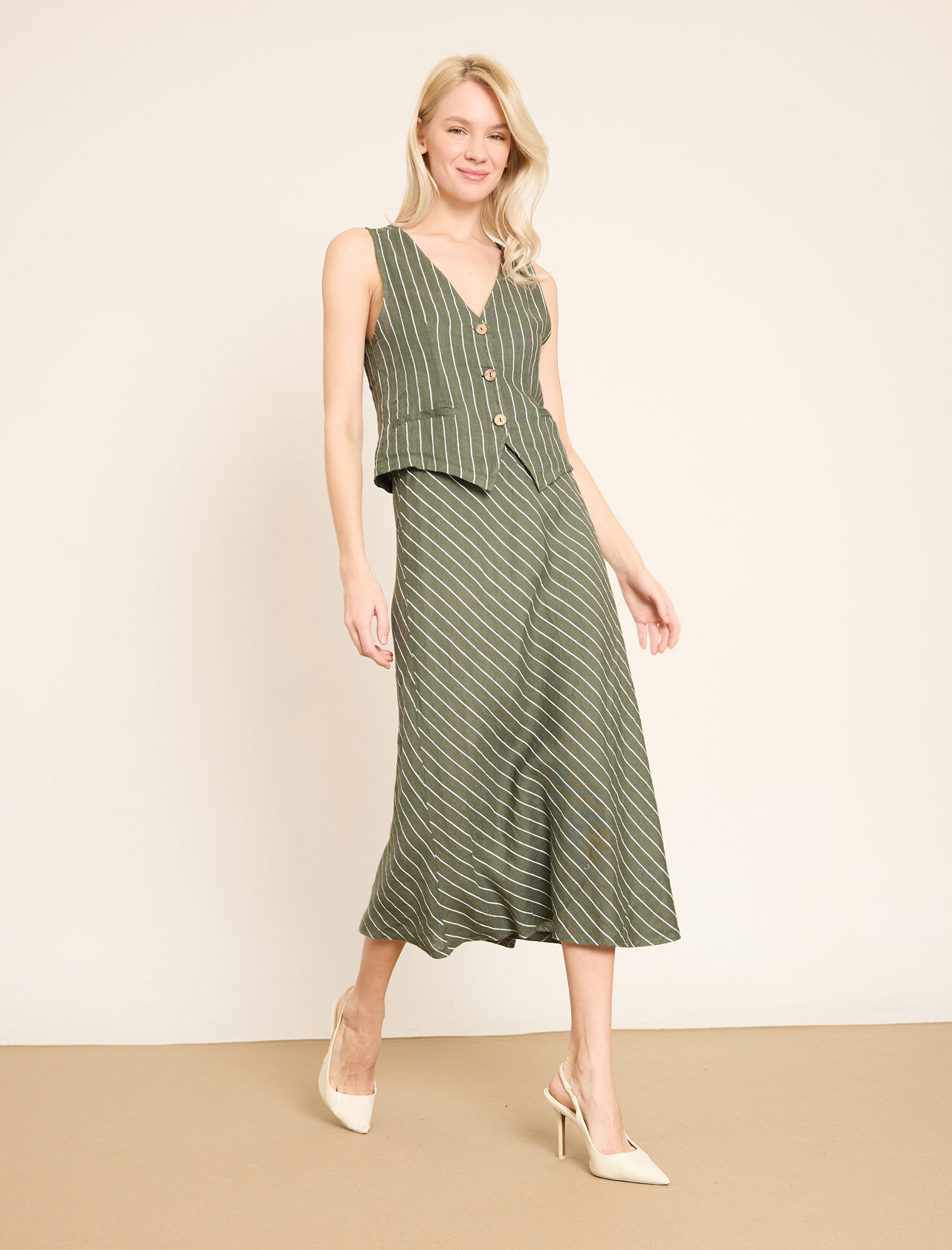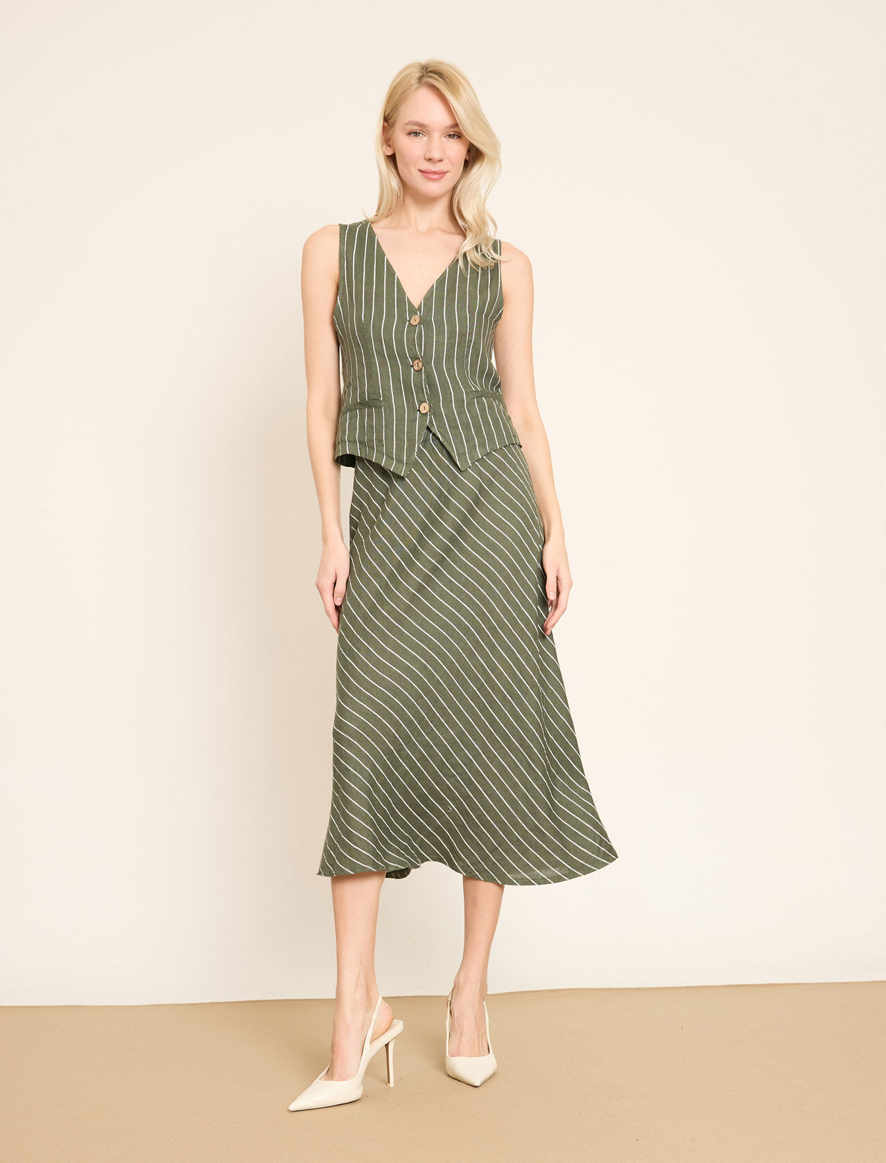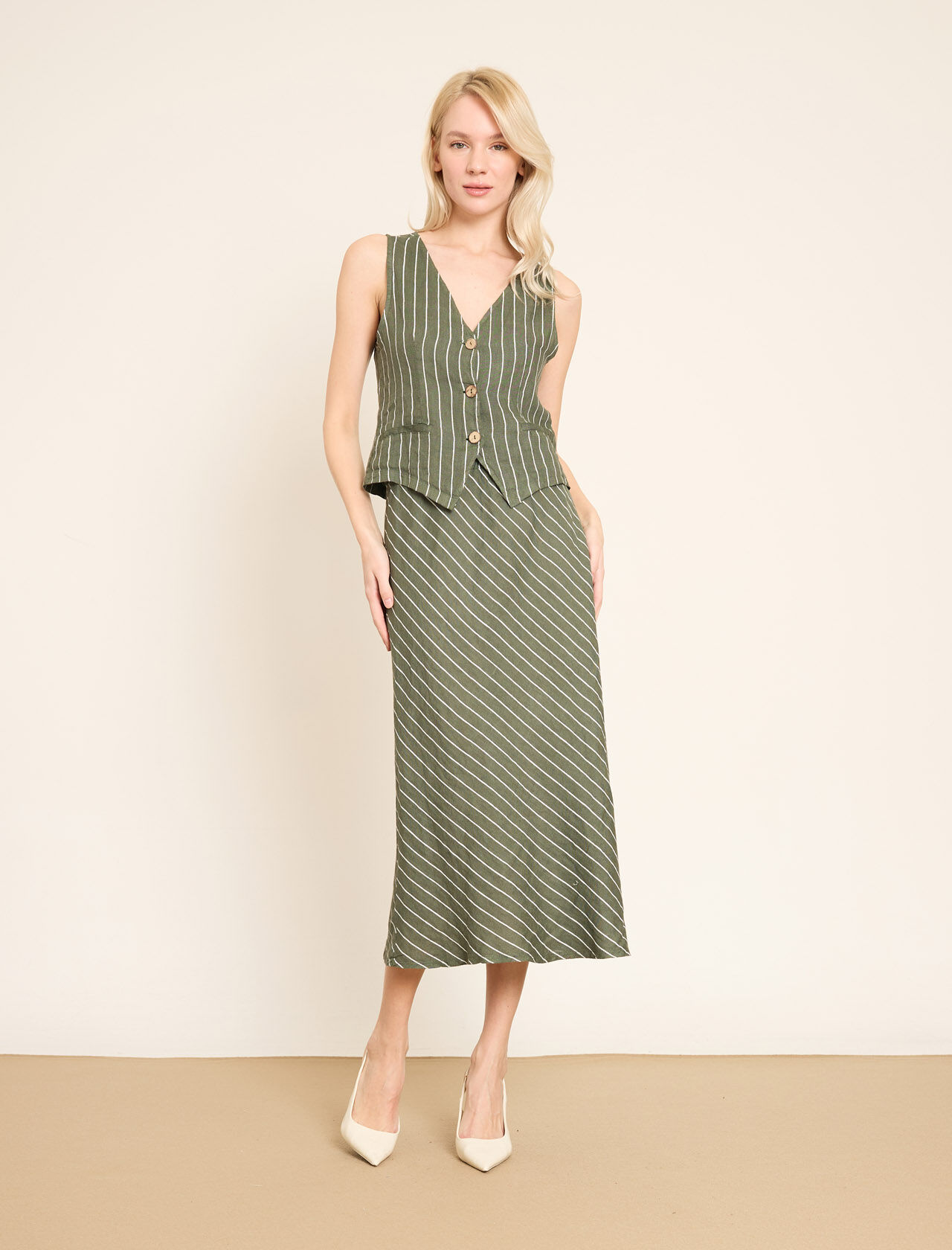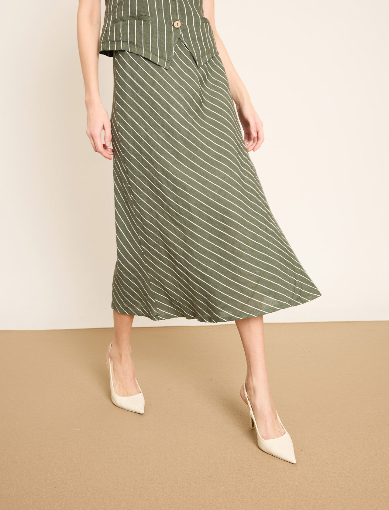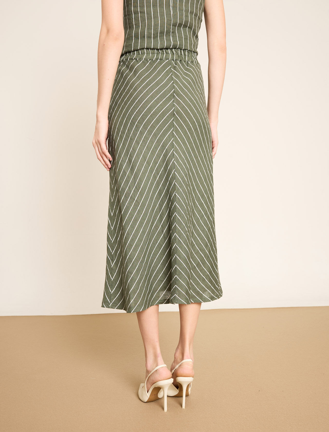 Lastikli Bel Detaylı Çizgili Midi Keten Etek