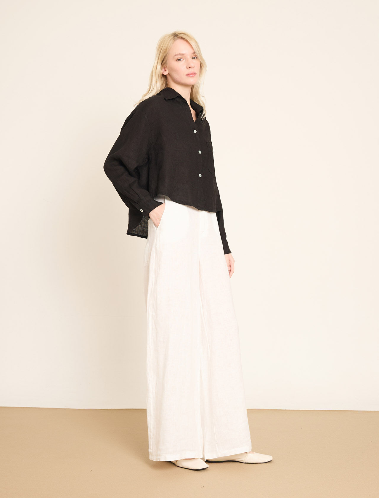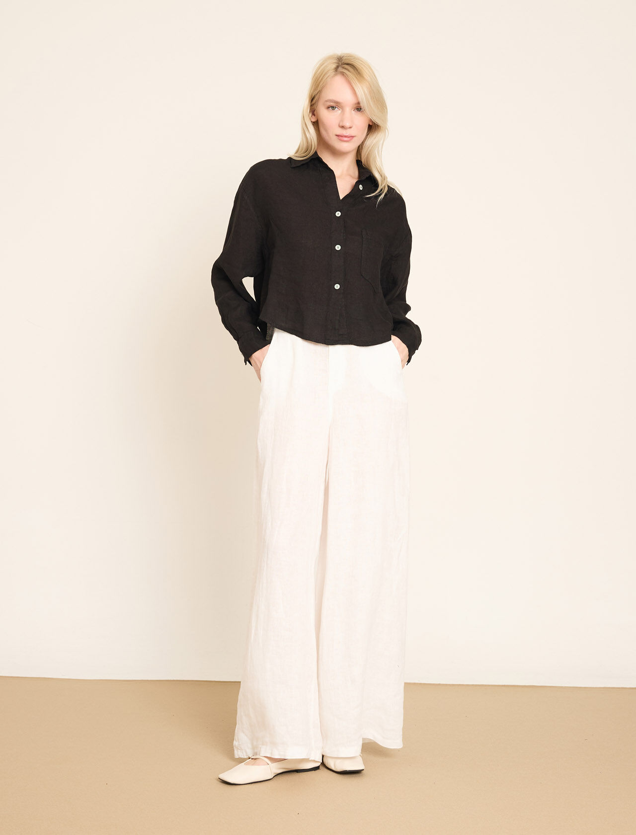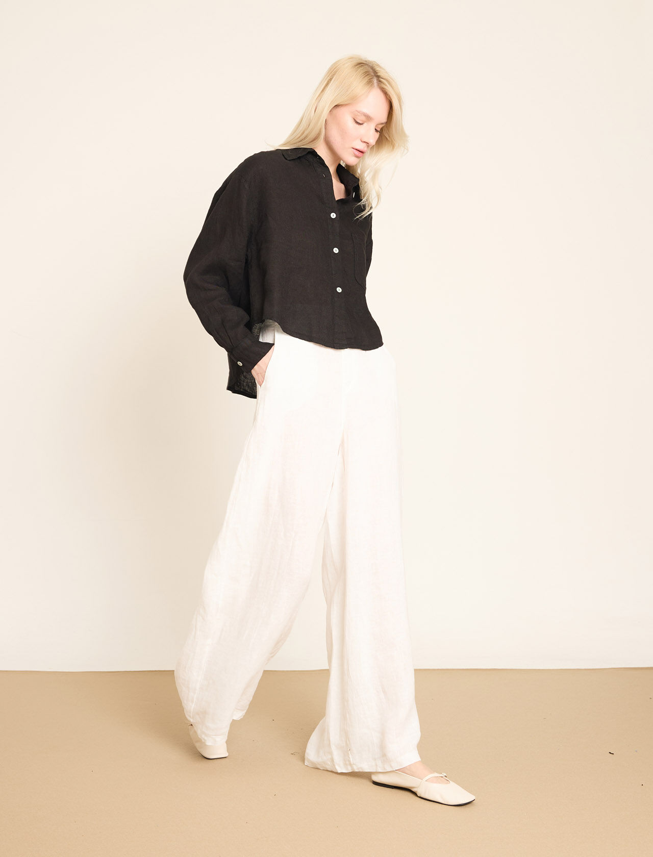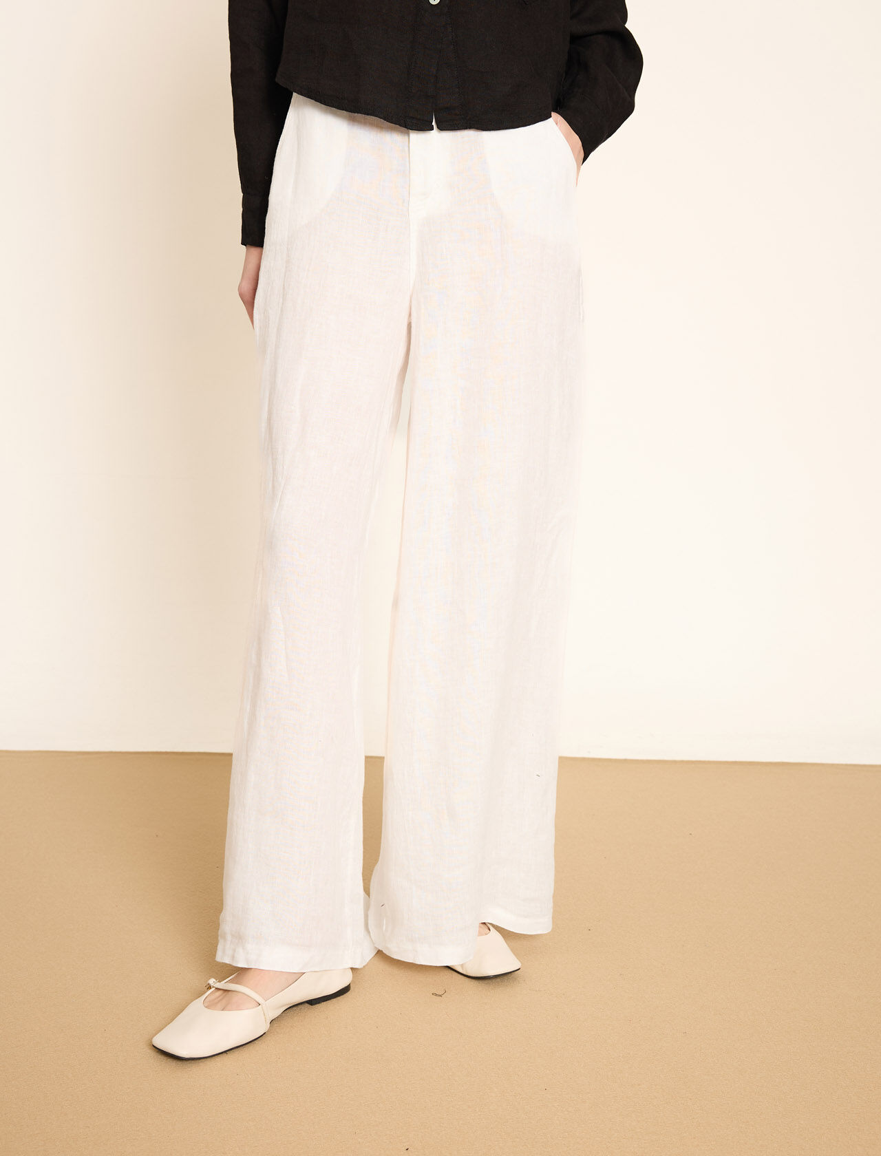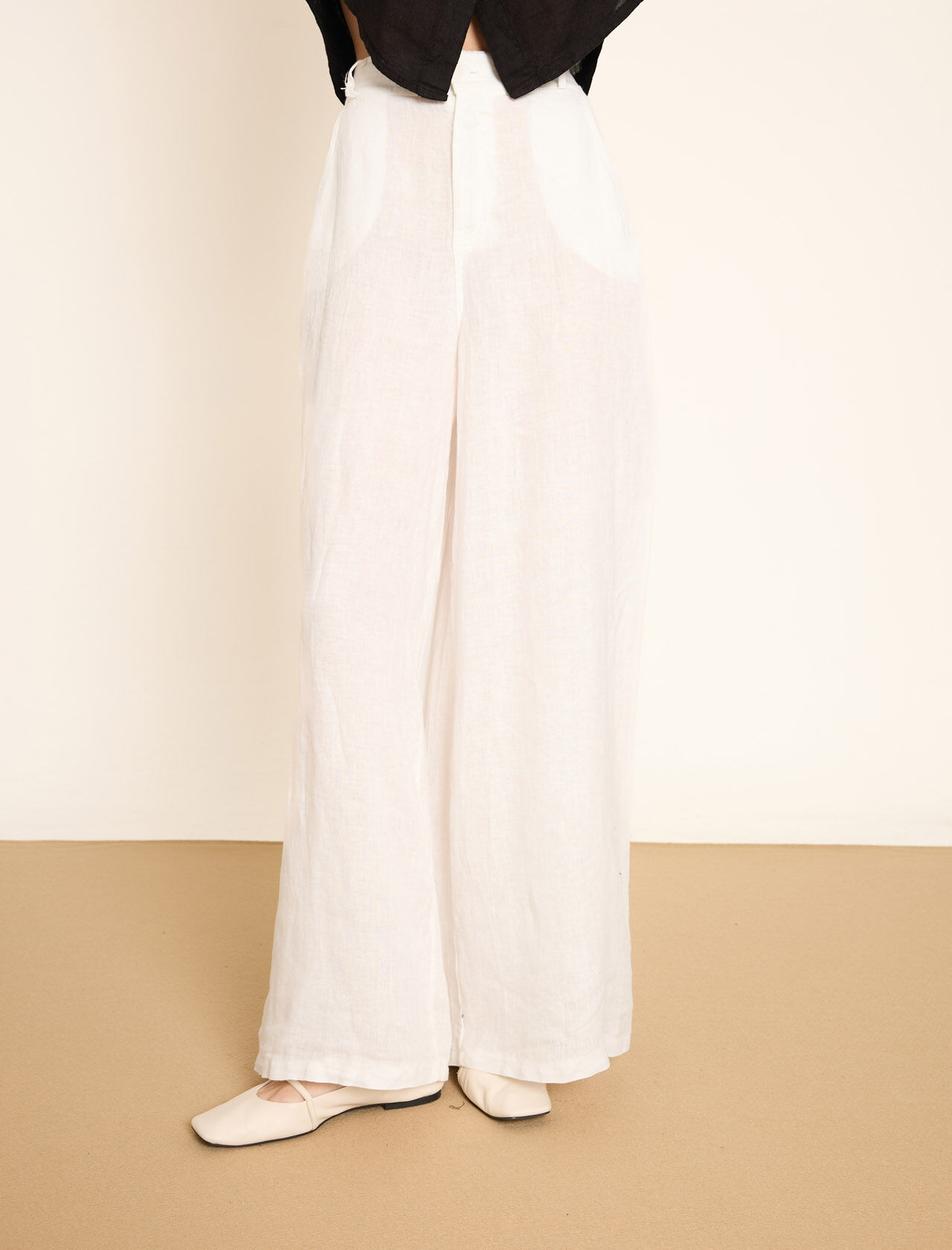 Lastikli Bel Detaylı Geniş Paça Keten Pantolon