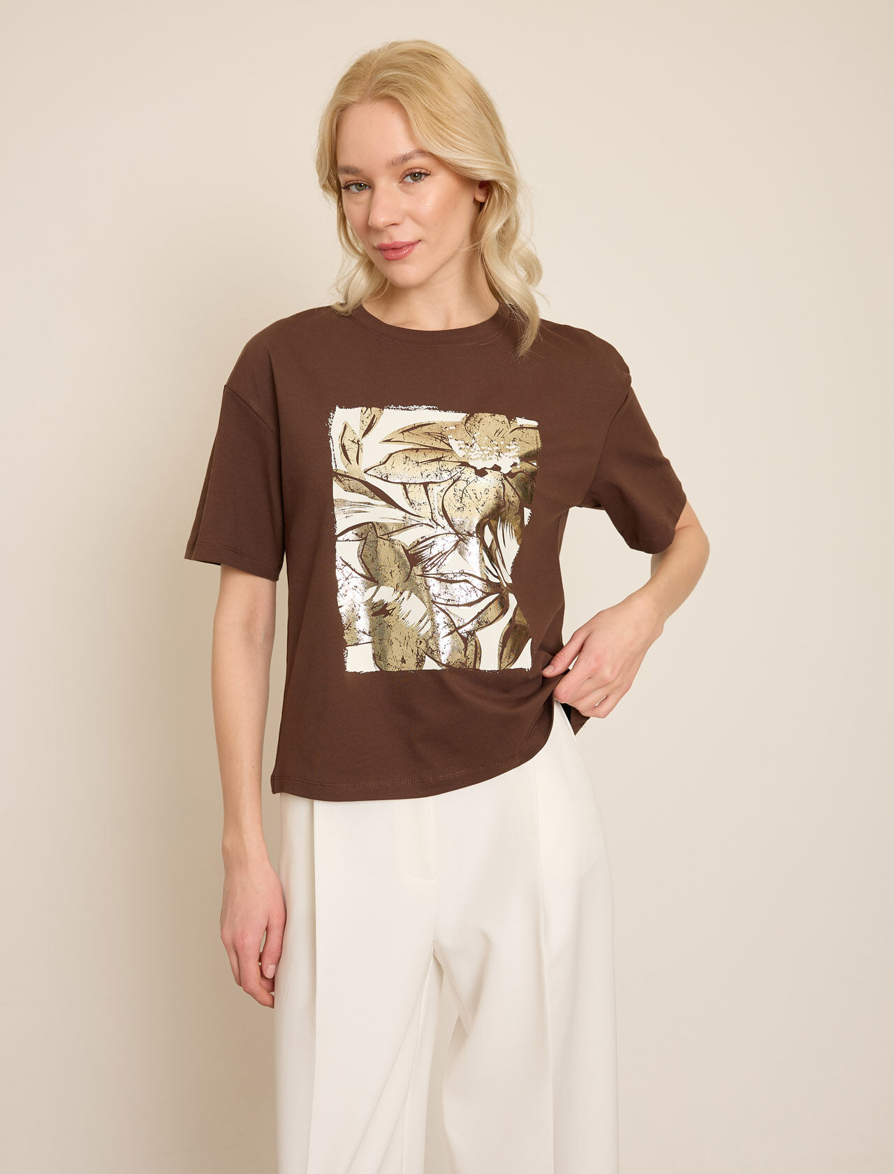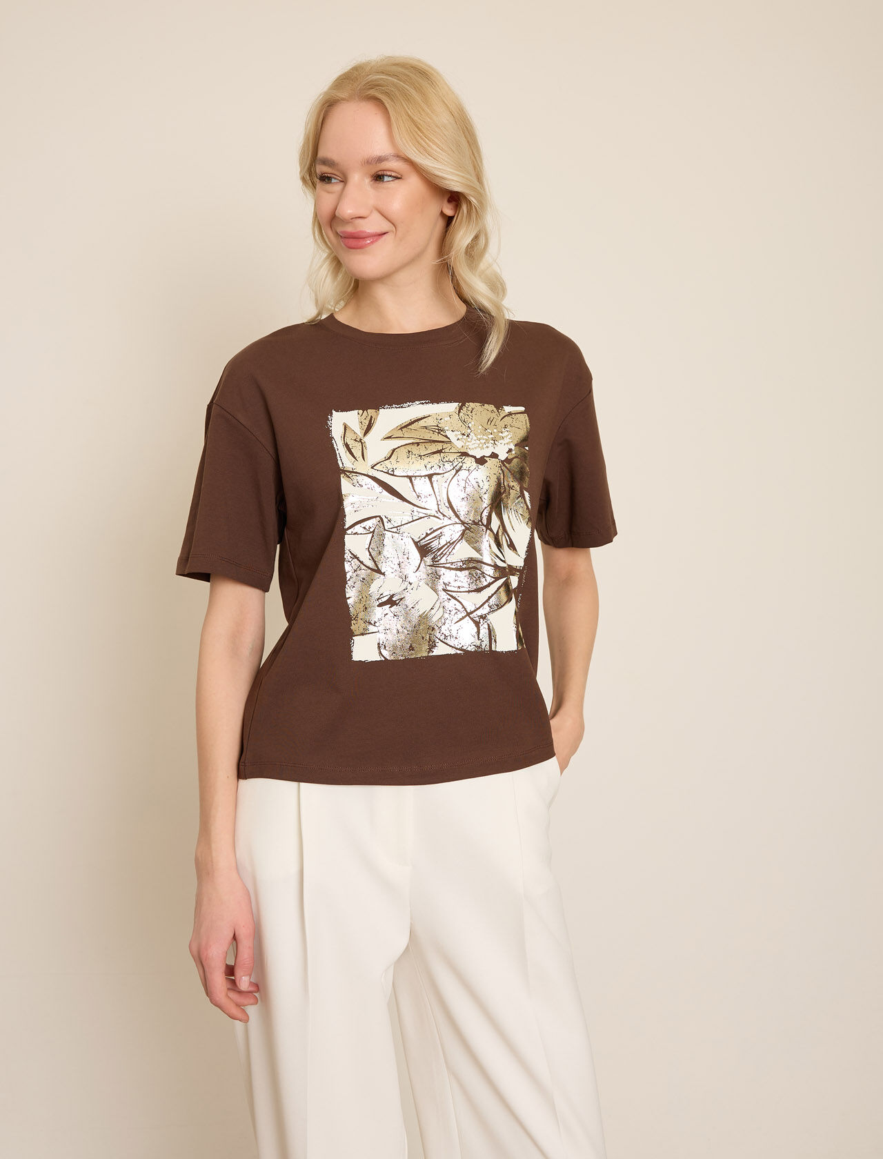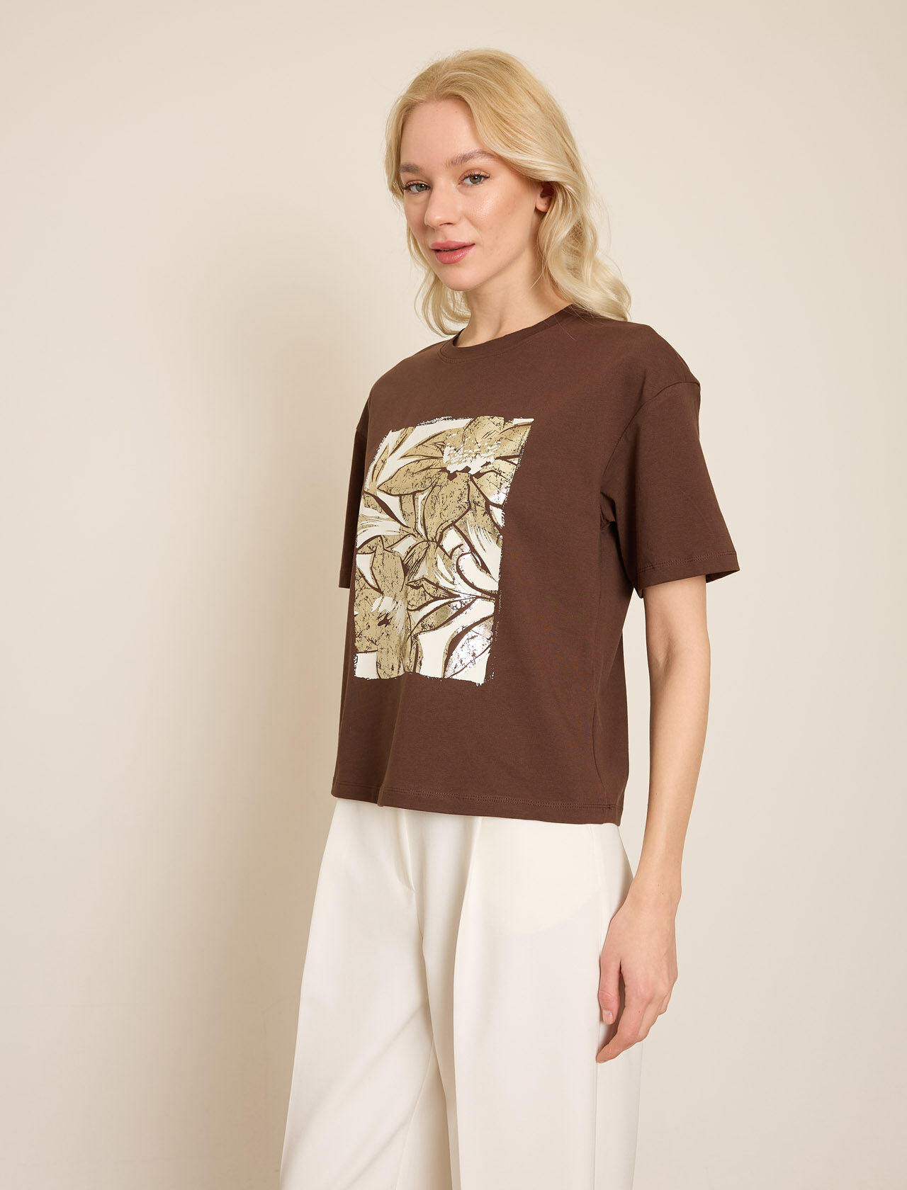METALIK CICEK BASKILI PAMUKLU T-SHIRT