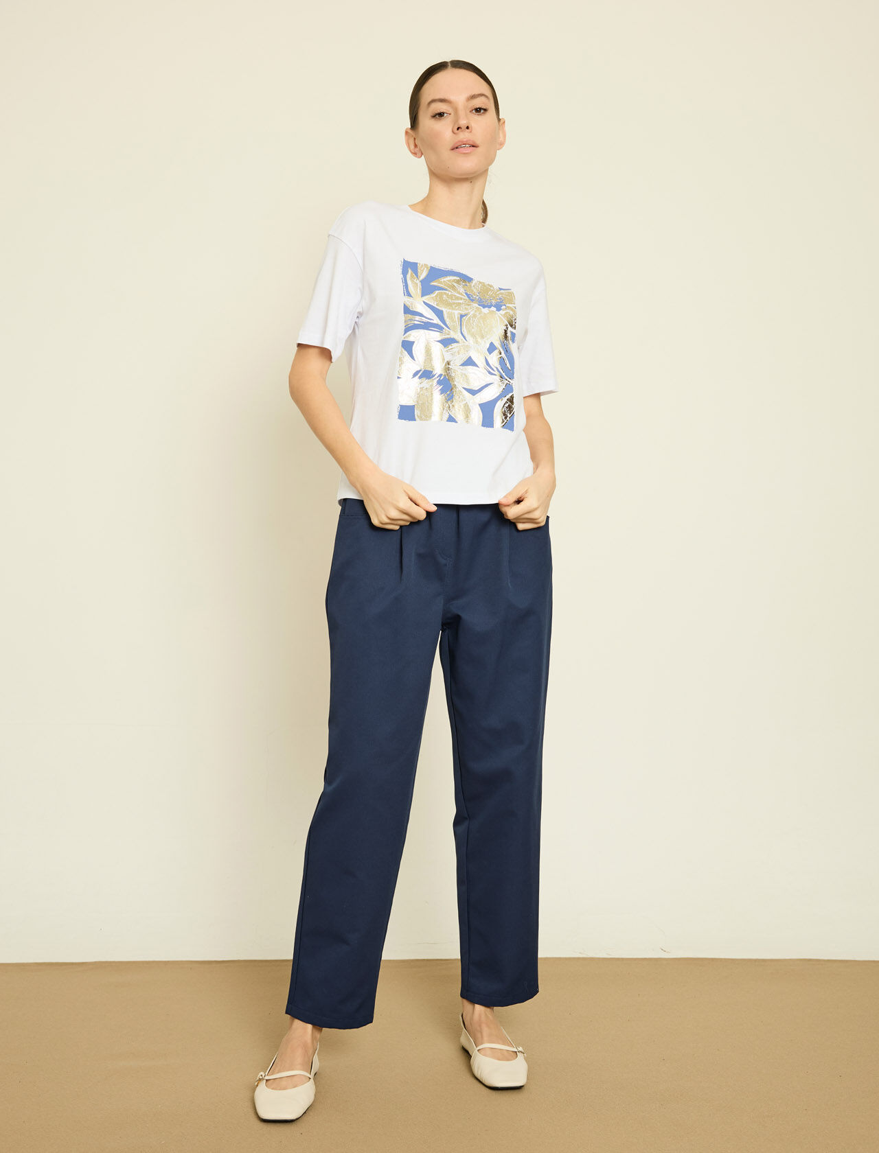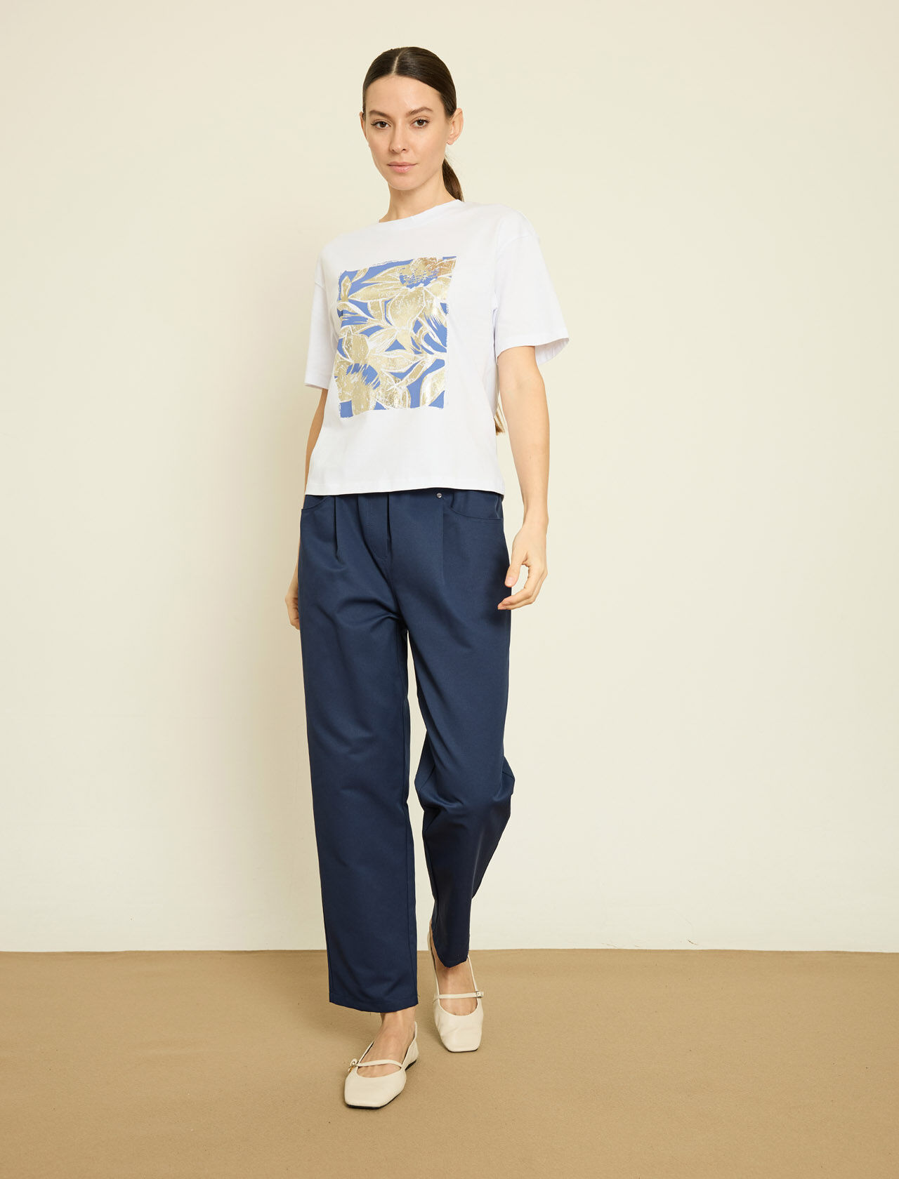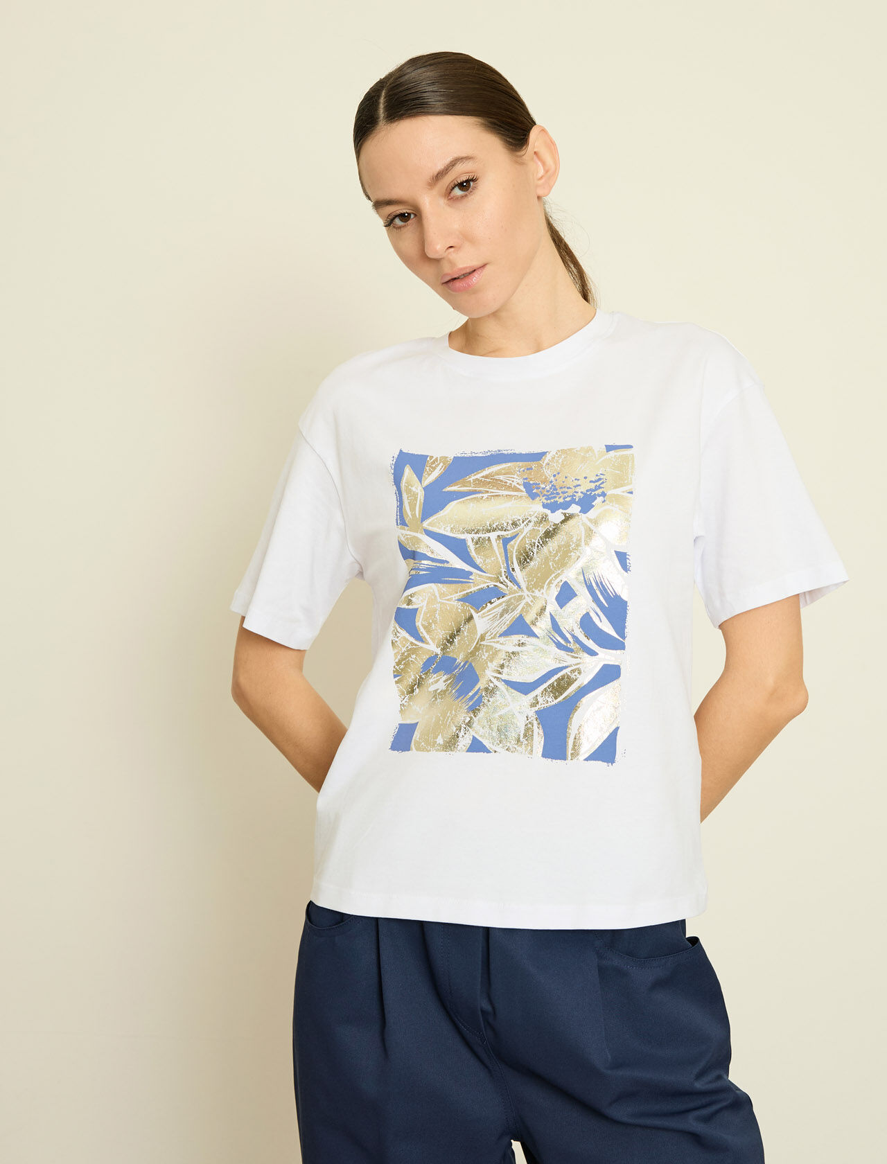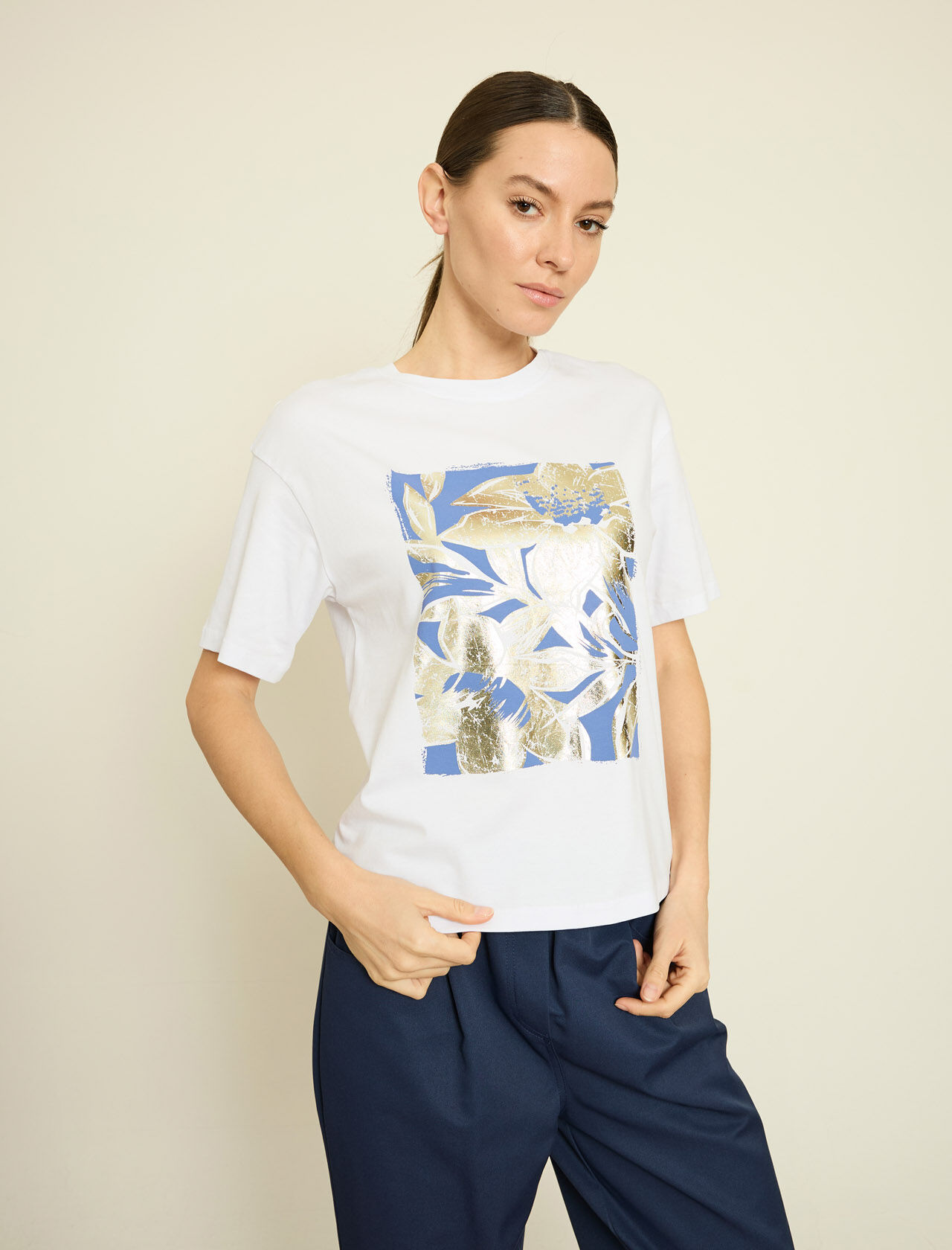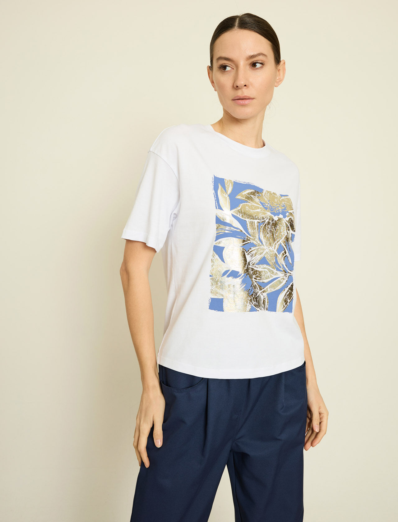 METALIK CICEK BASKILI PAMUKLU T-SHIRT