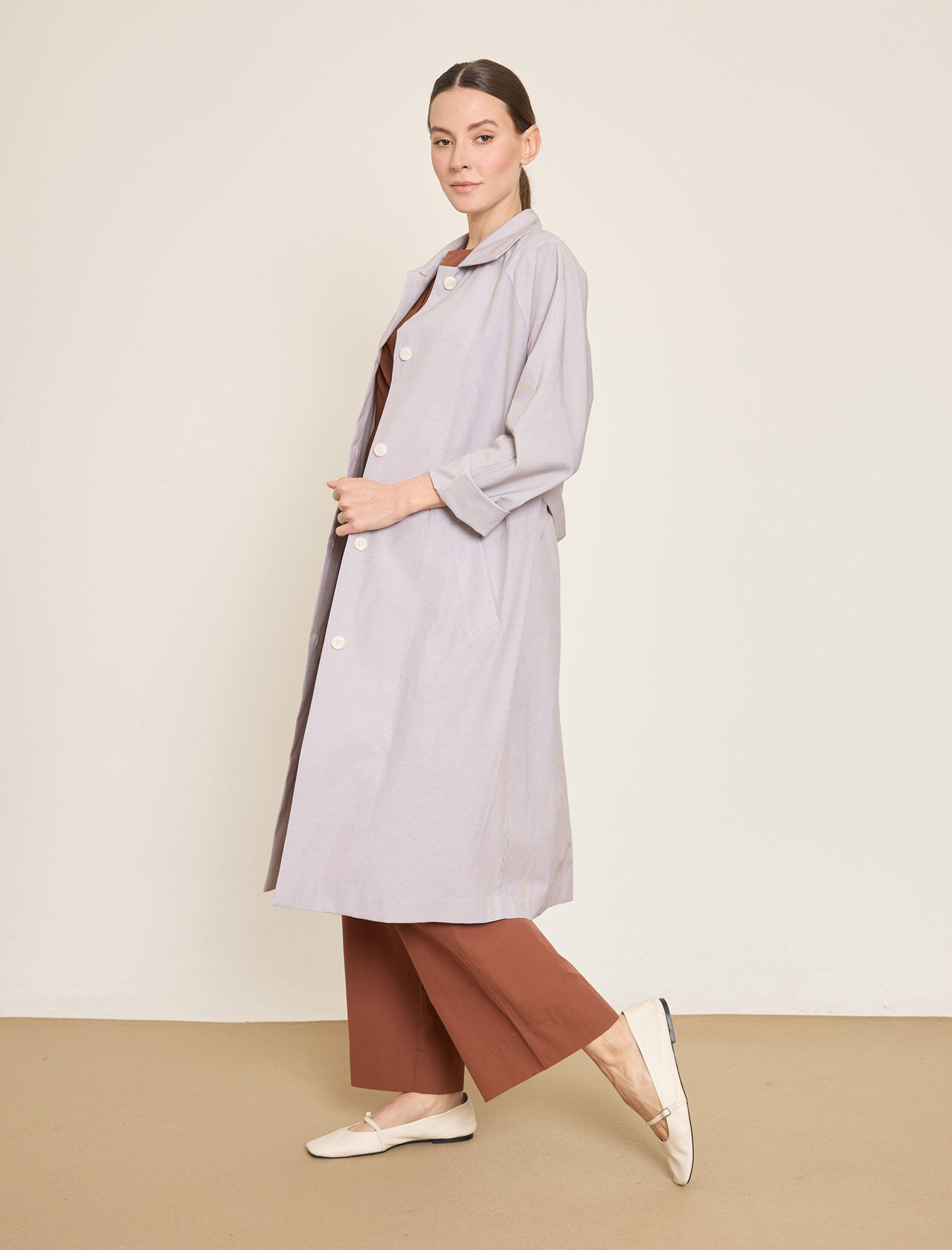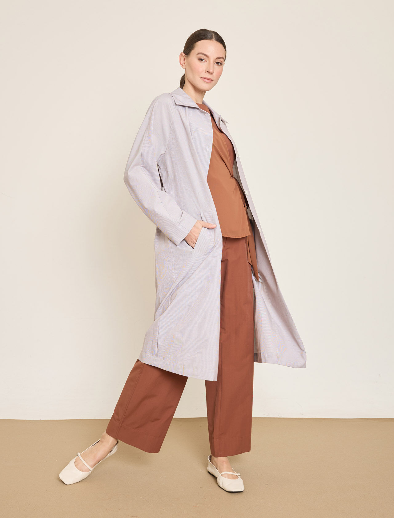 ONDEN DUGMELI UZUN CIZGILI POPLIN TRENCKOT
