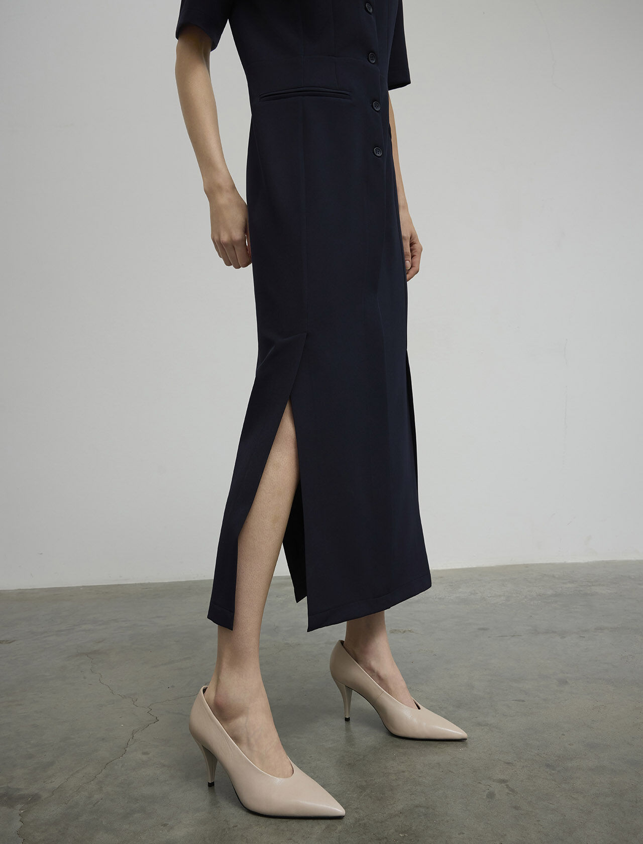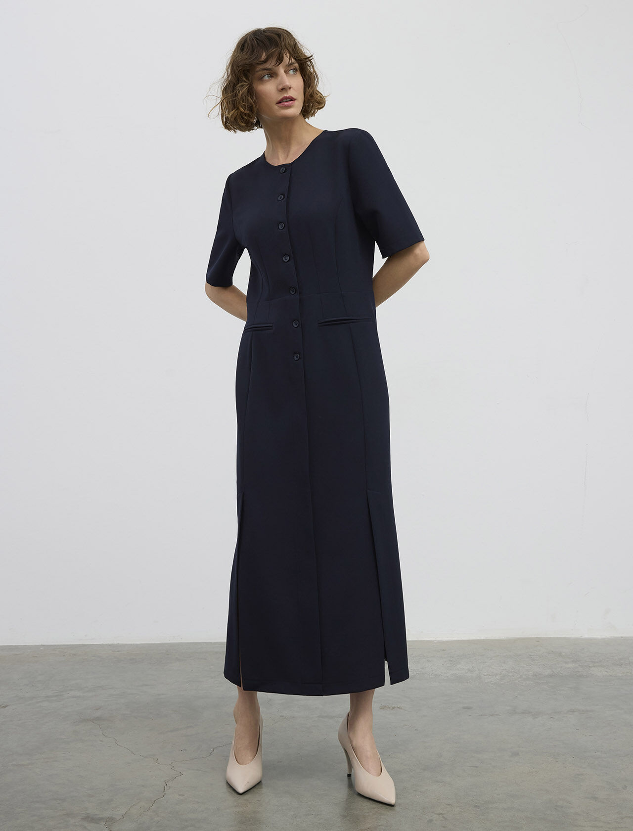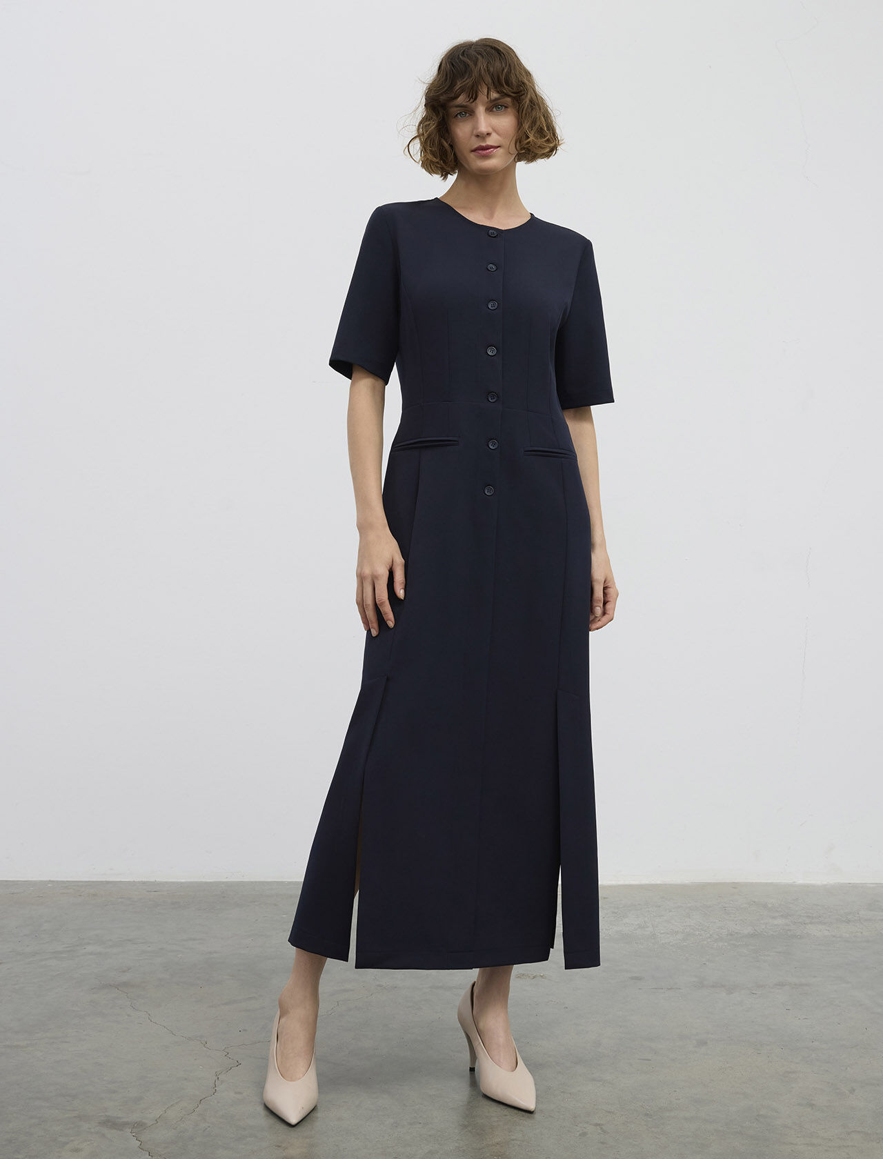 ÖNÜ DUGMELI-YIRTMACLI UZUN ELBISE
