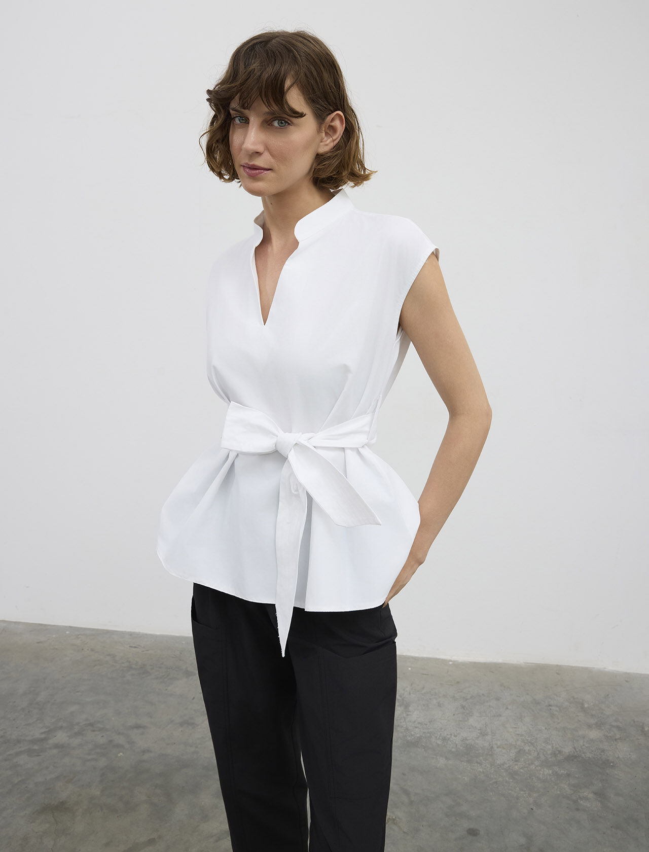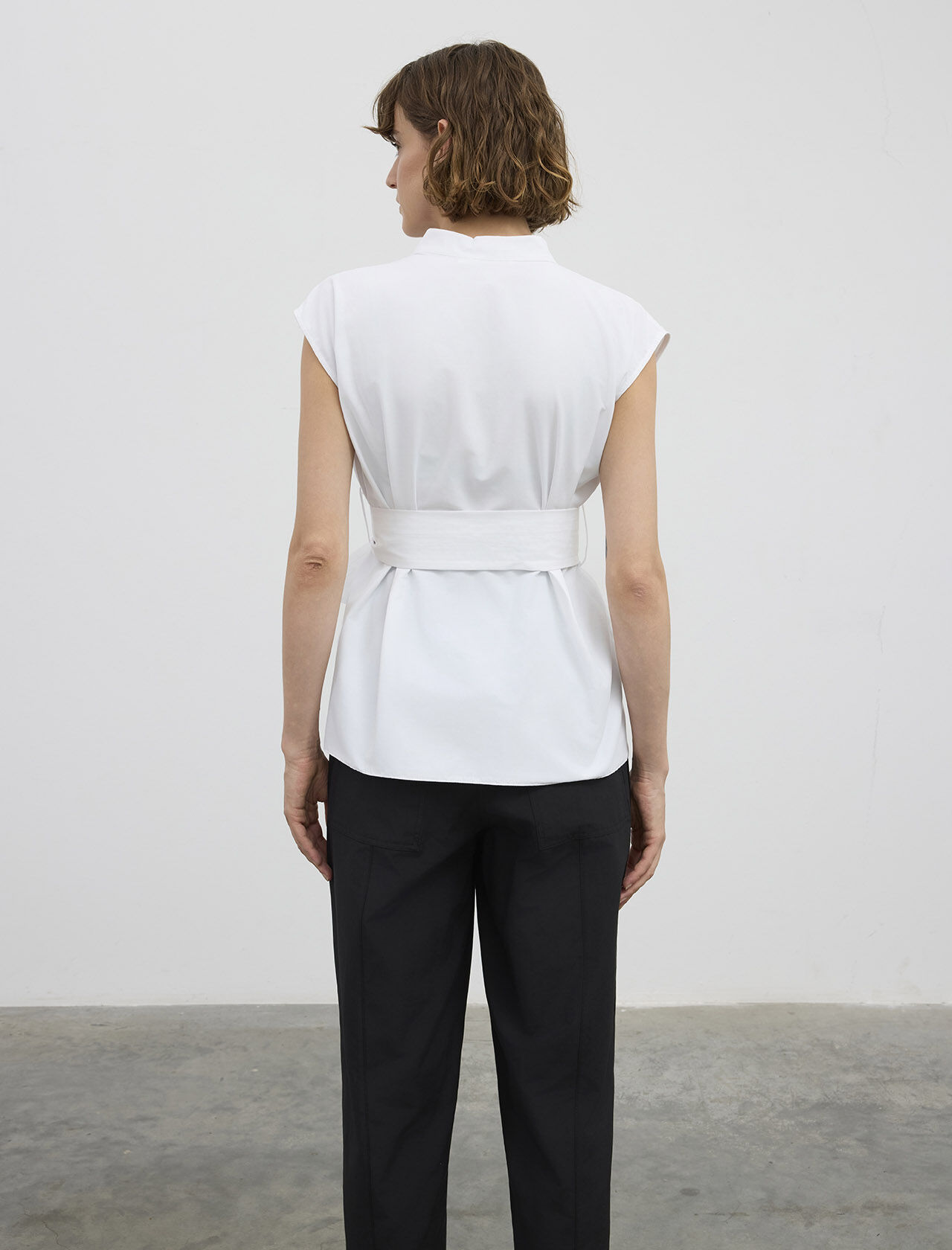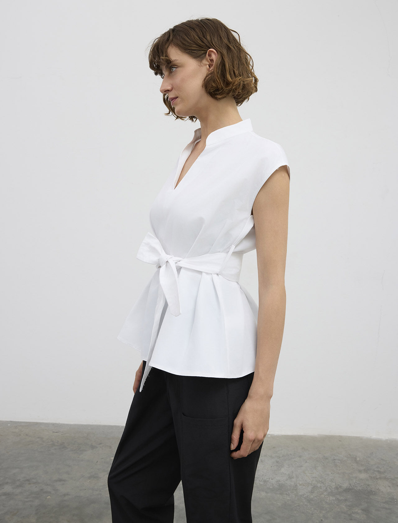 PAMUK KARISIM SUS DIKISLI KEMERLI KOLSUZ BLUZ