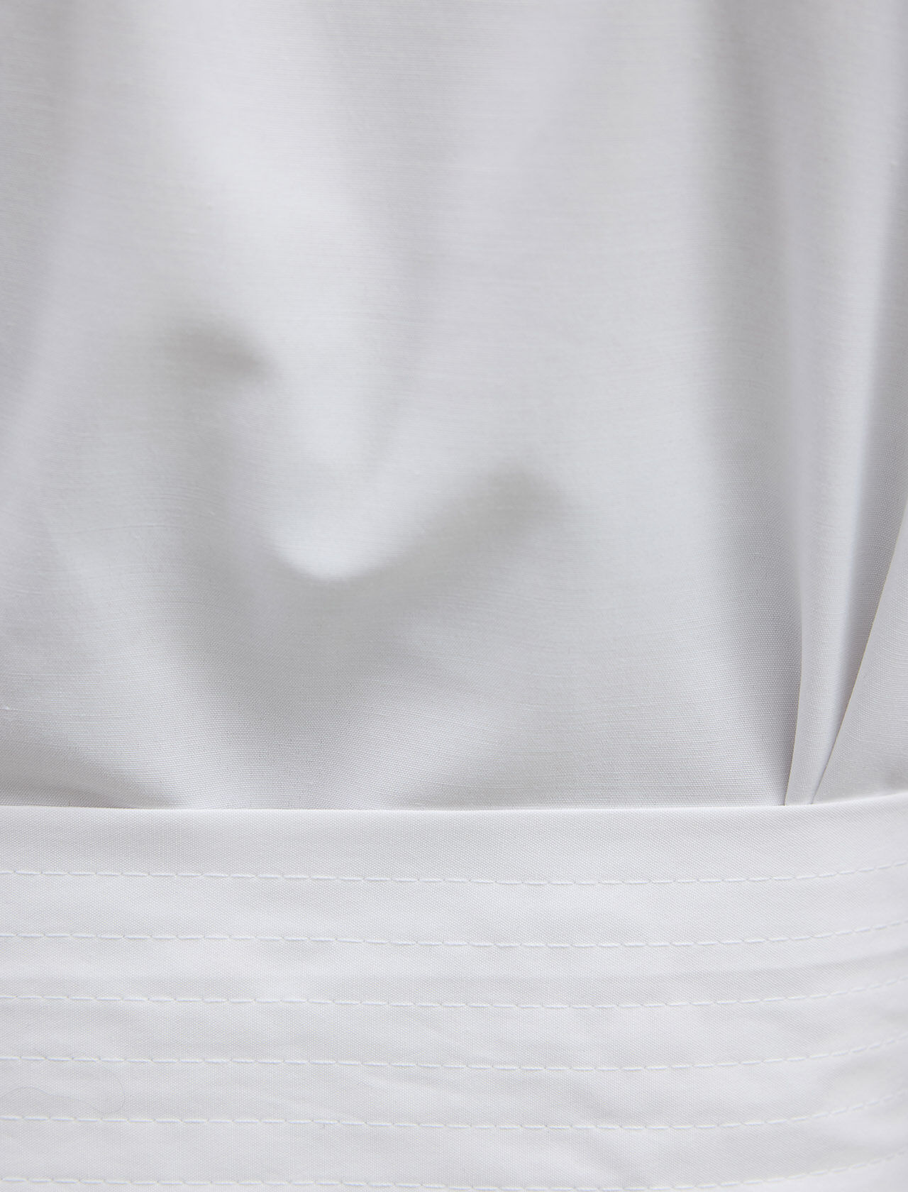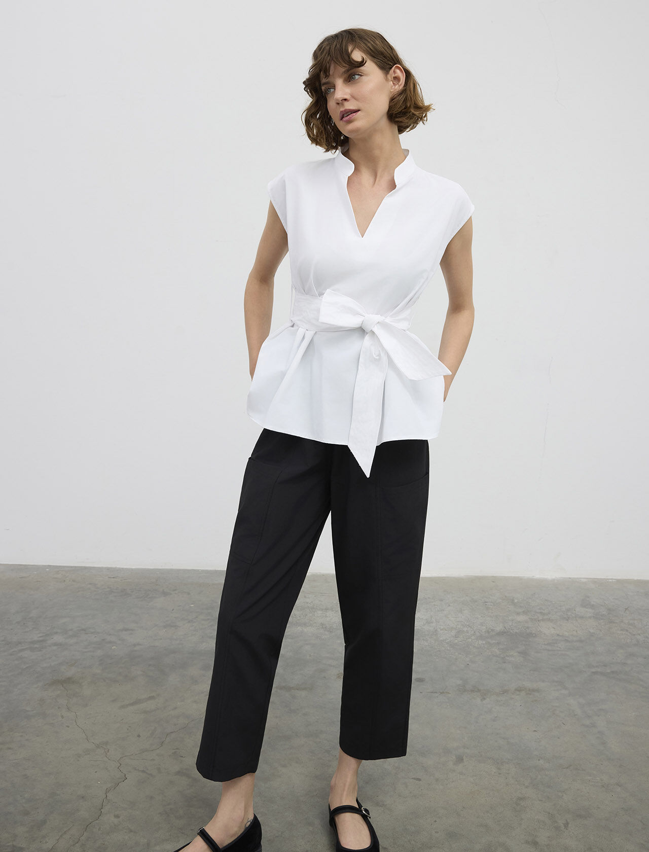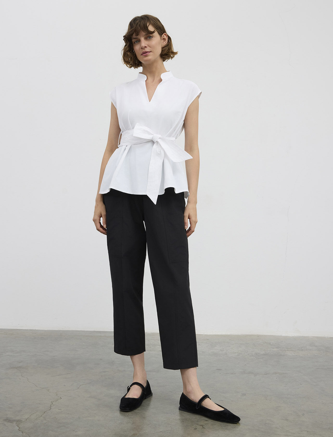 PAMUK KARISIM SUS DIKISLI KEMERLI KOLSUZ BLUZ