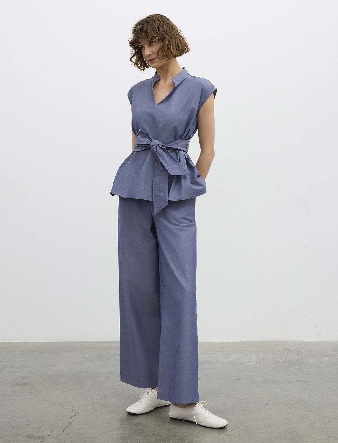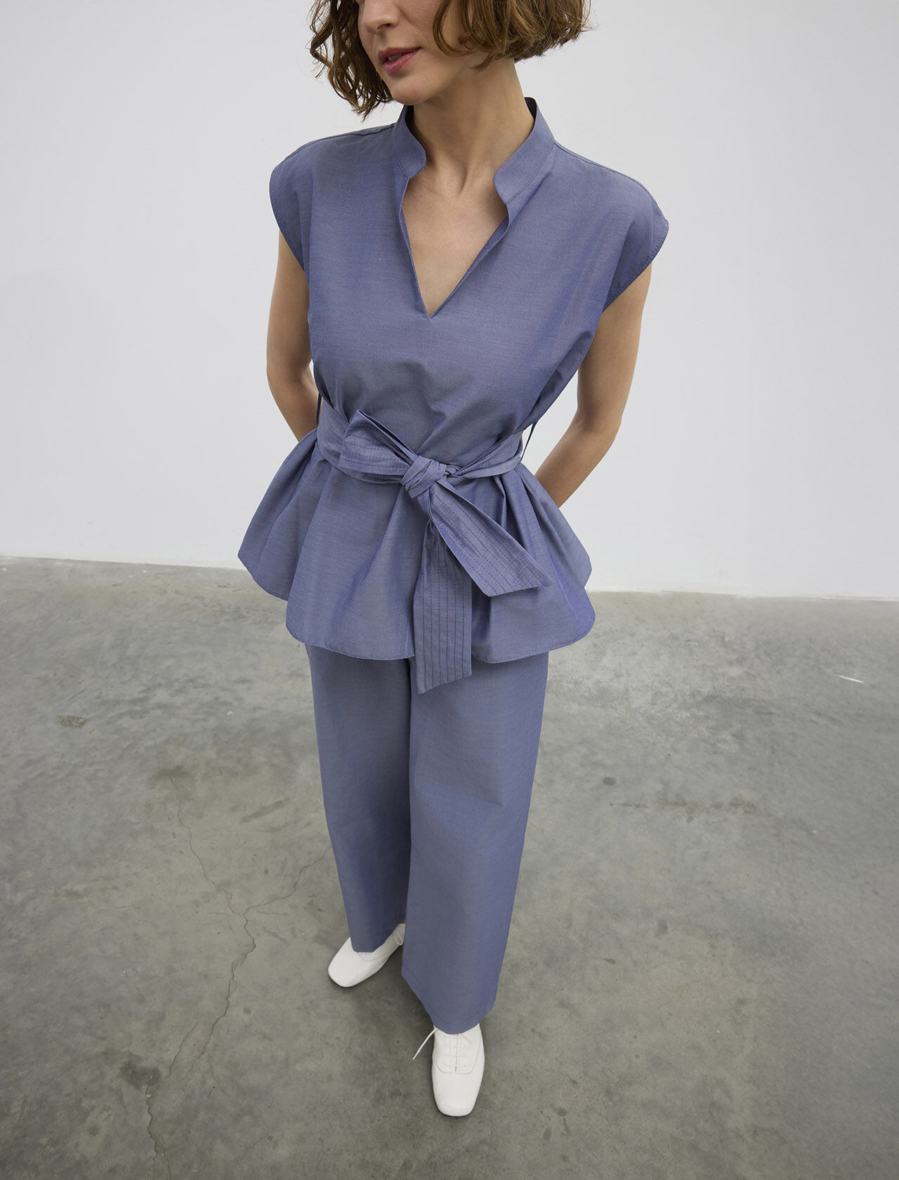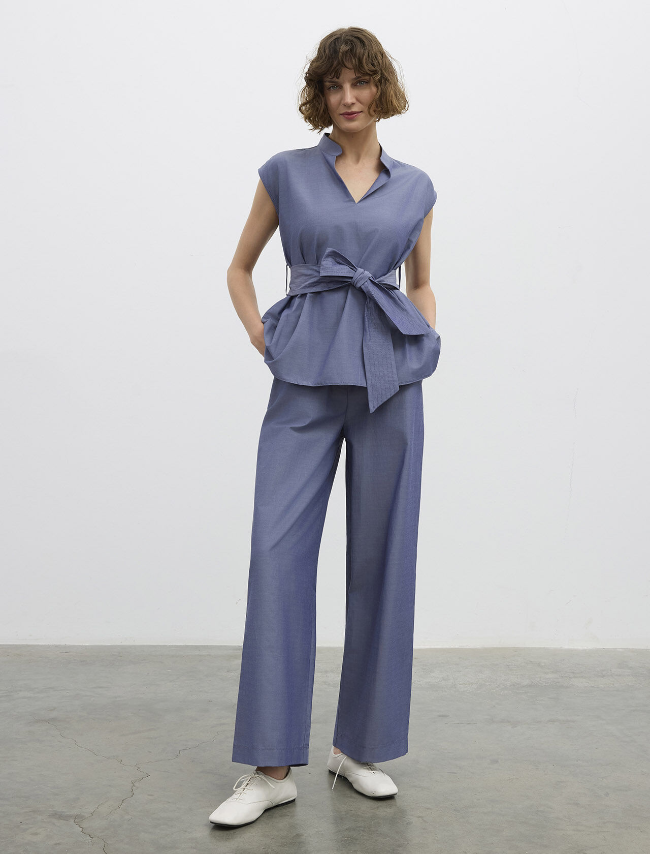 PAMUK KARISIM SUS DIKISLI KEMERLI KOLSUZ BLUZ
