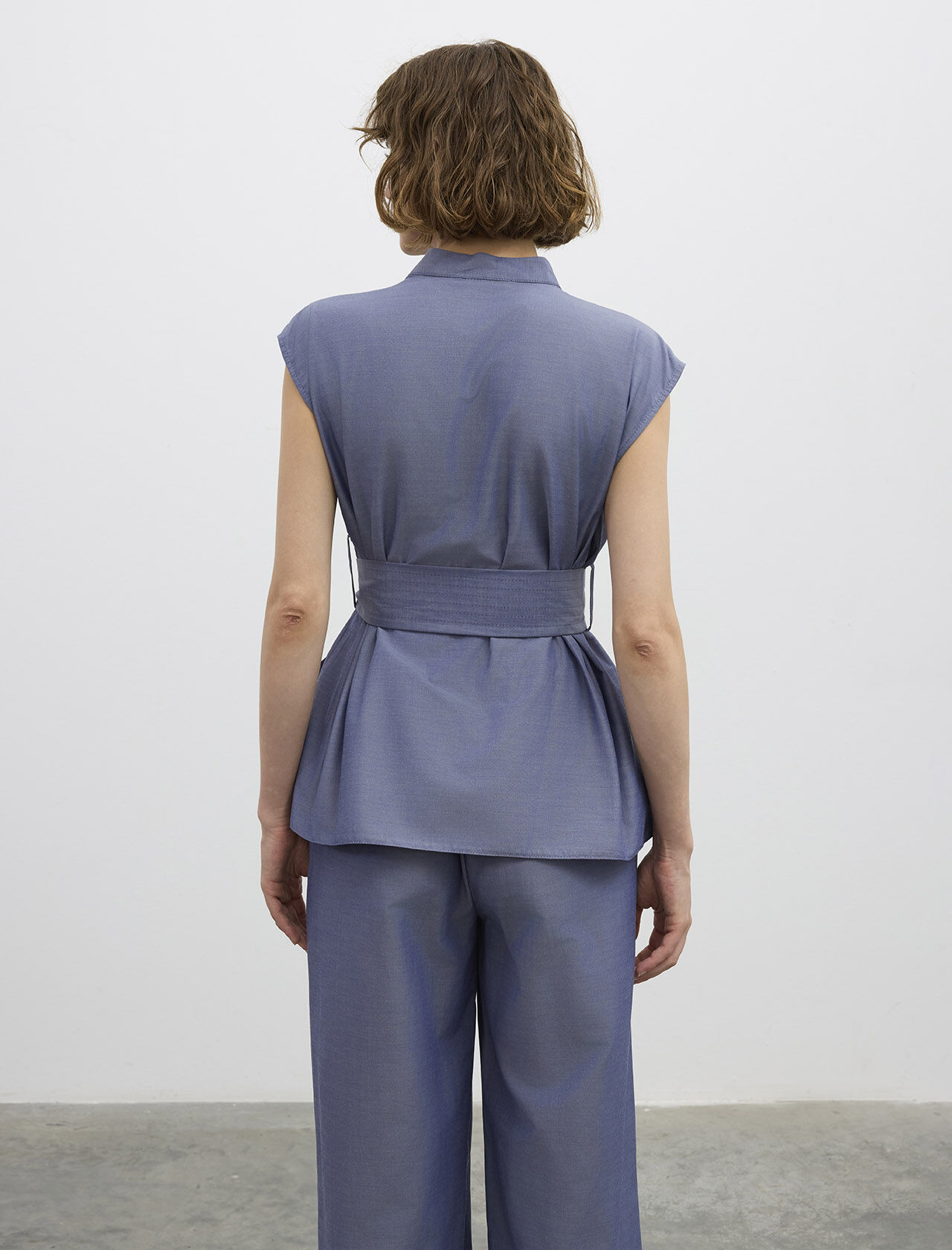 Süs Dikişli Kemerli Kolsuz Pamuk Bluz