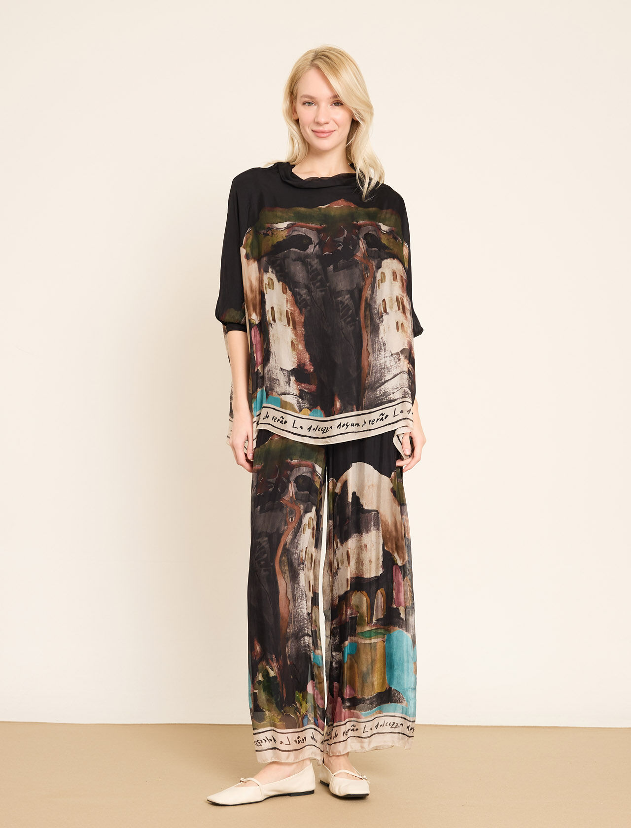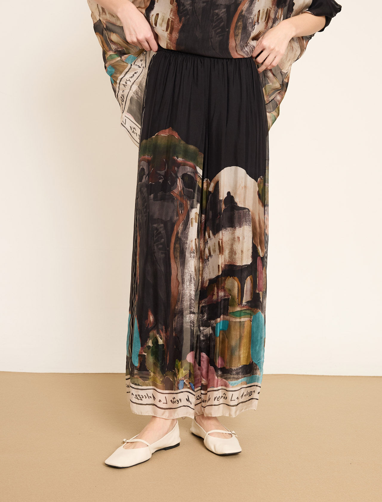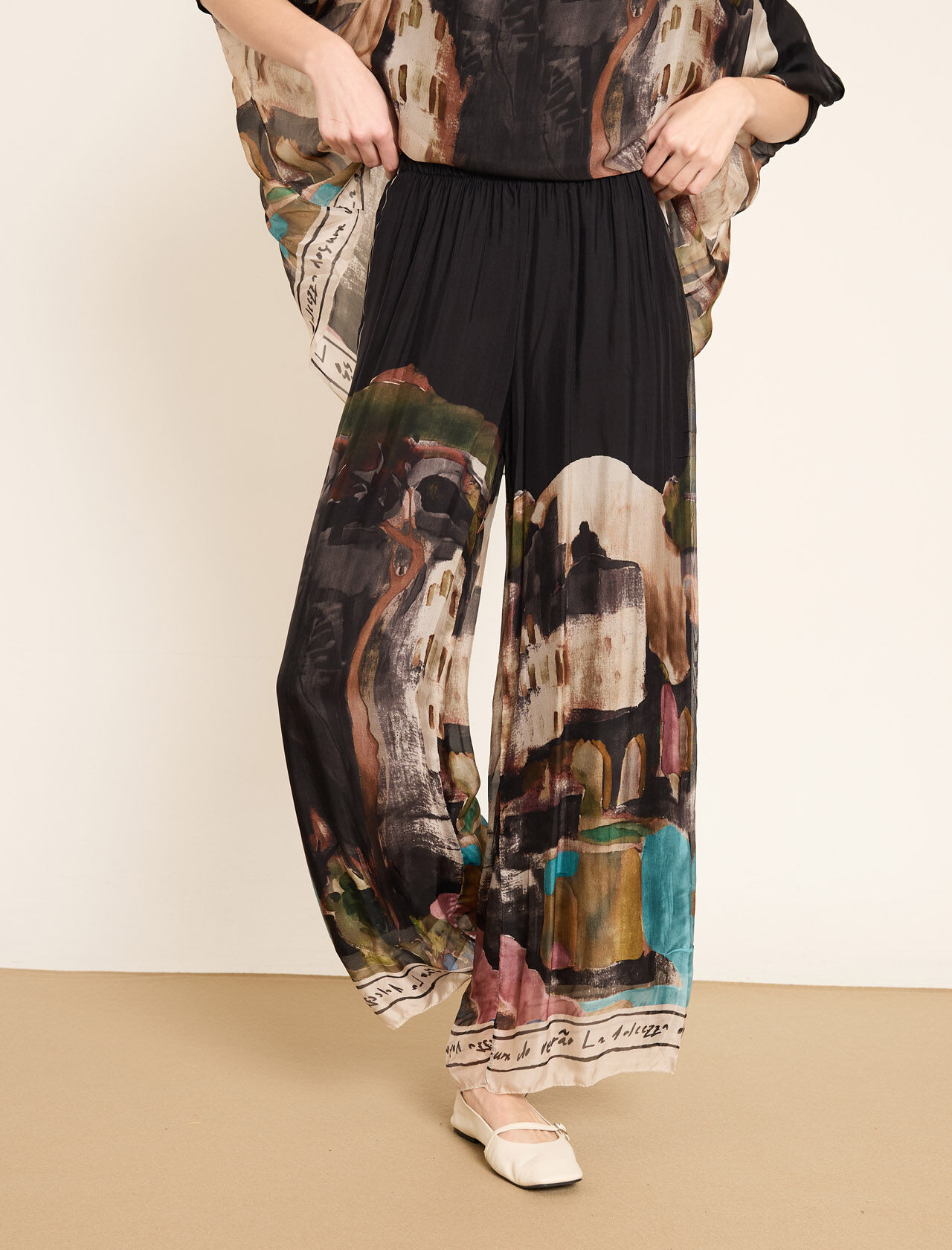 Sanatsal Desenli Geniş Paça Lastikli İpek Pantolon