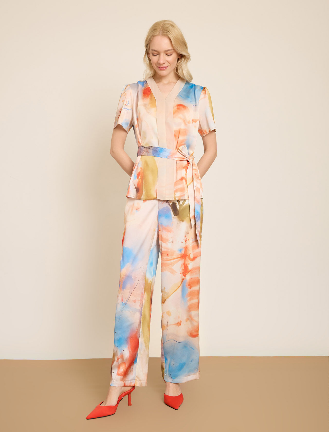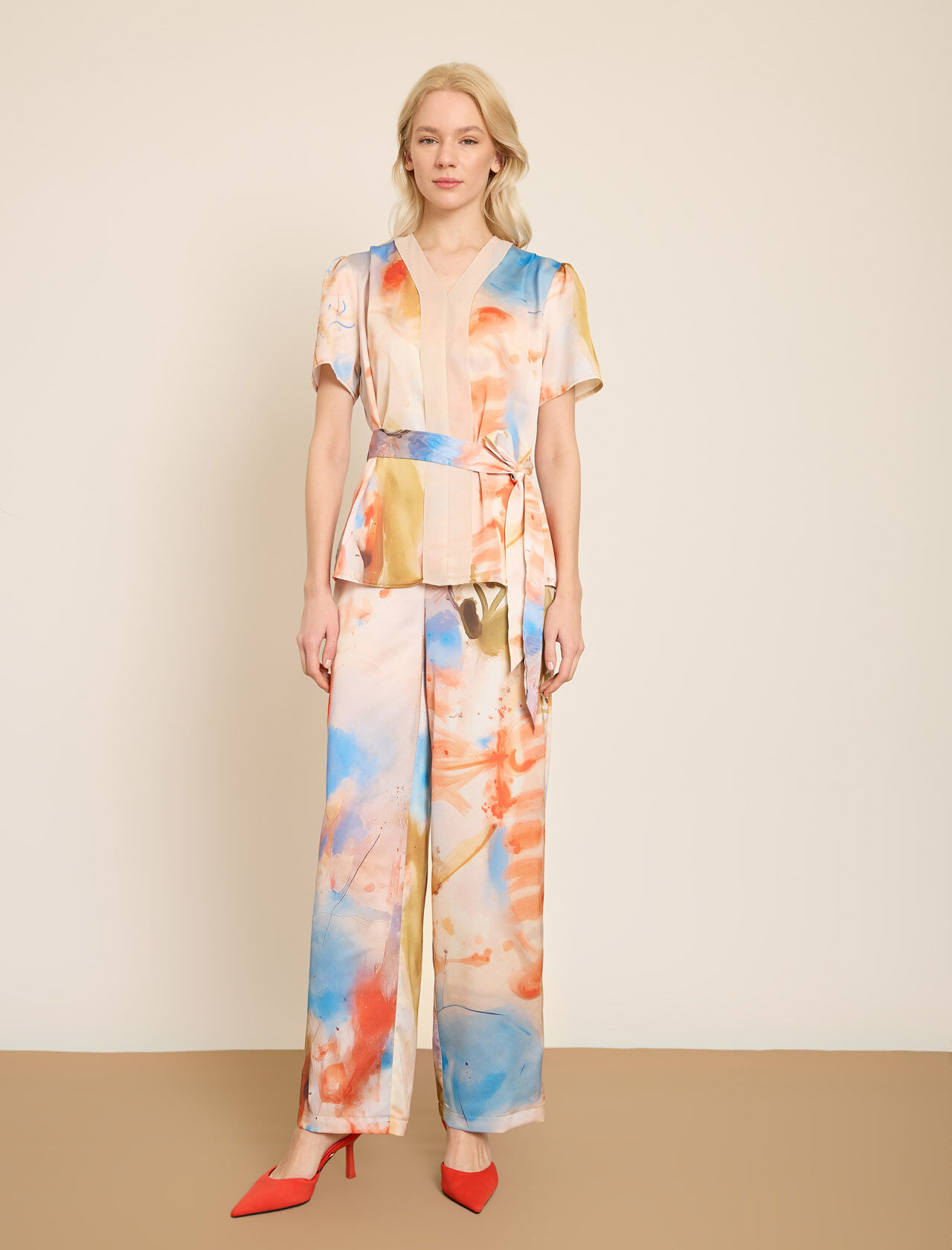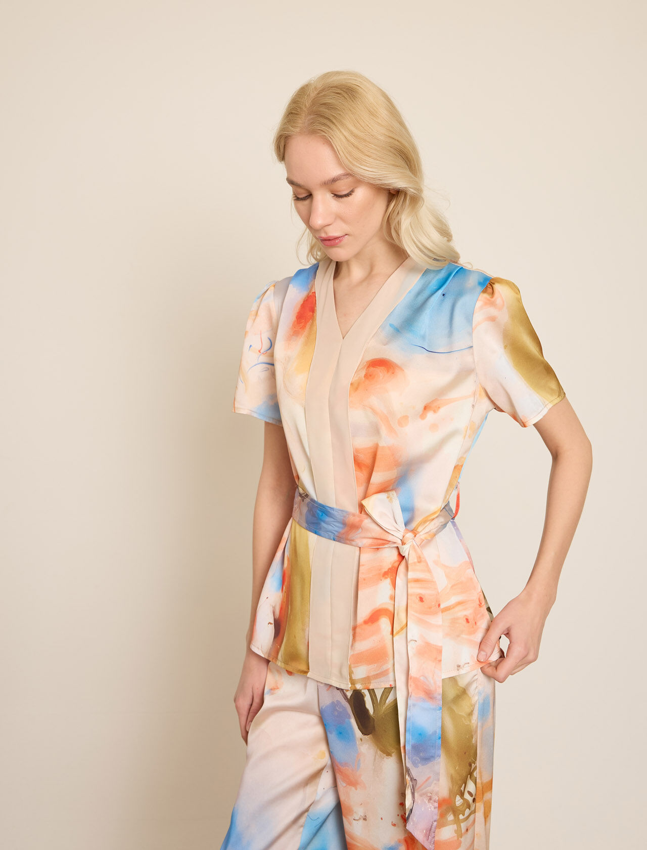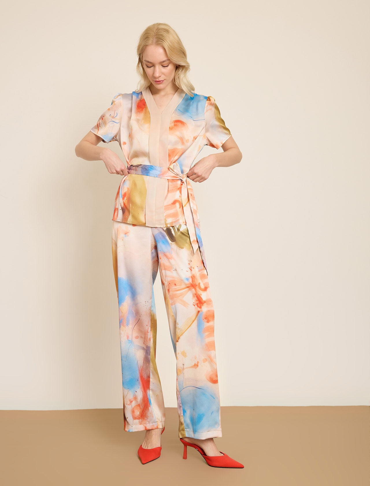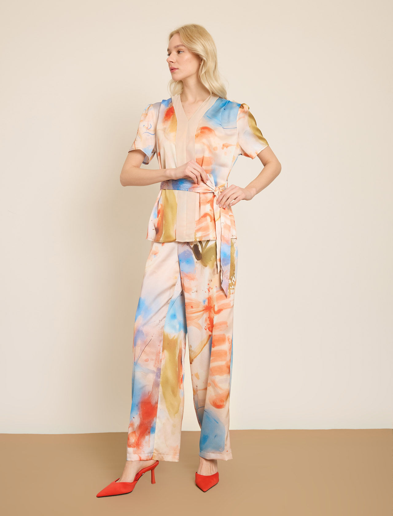 SIFON DETAYLI RENKLI BASKILI SATEN BLUZ