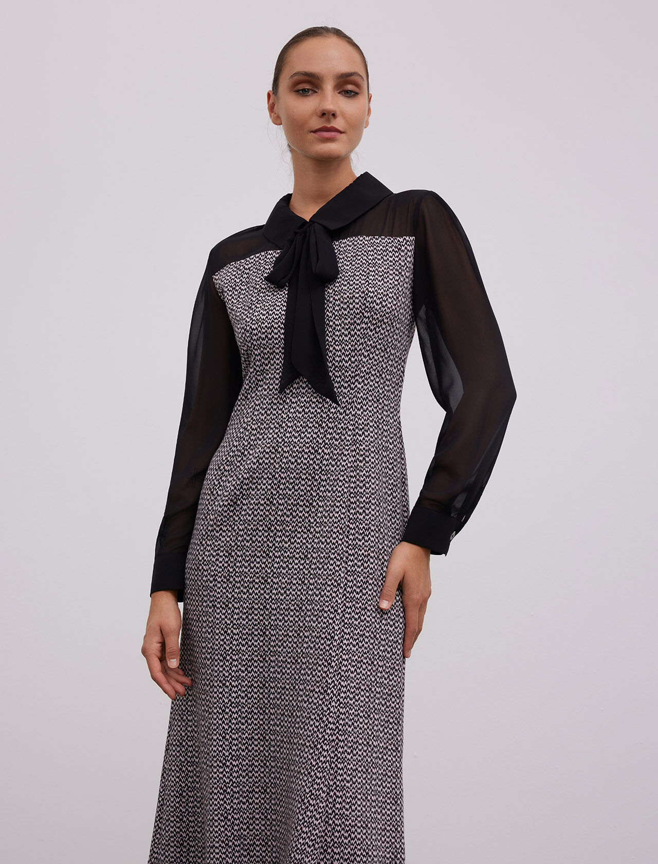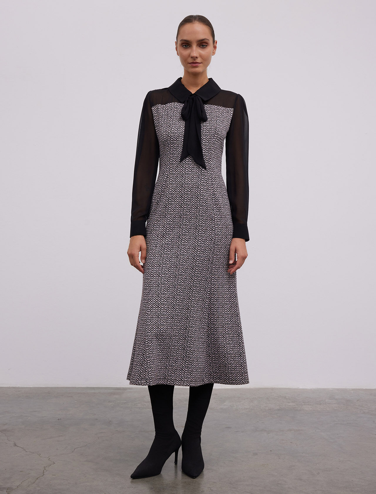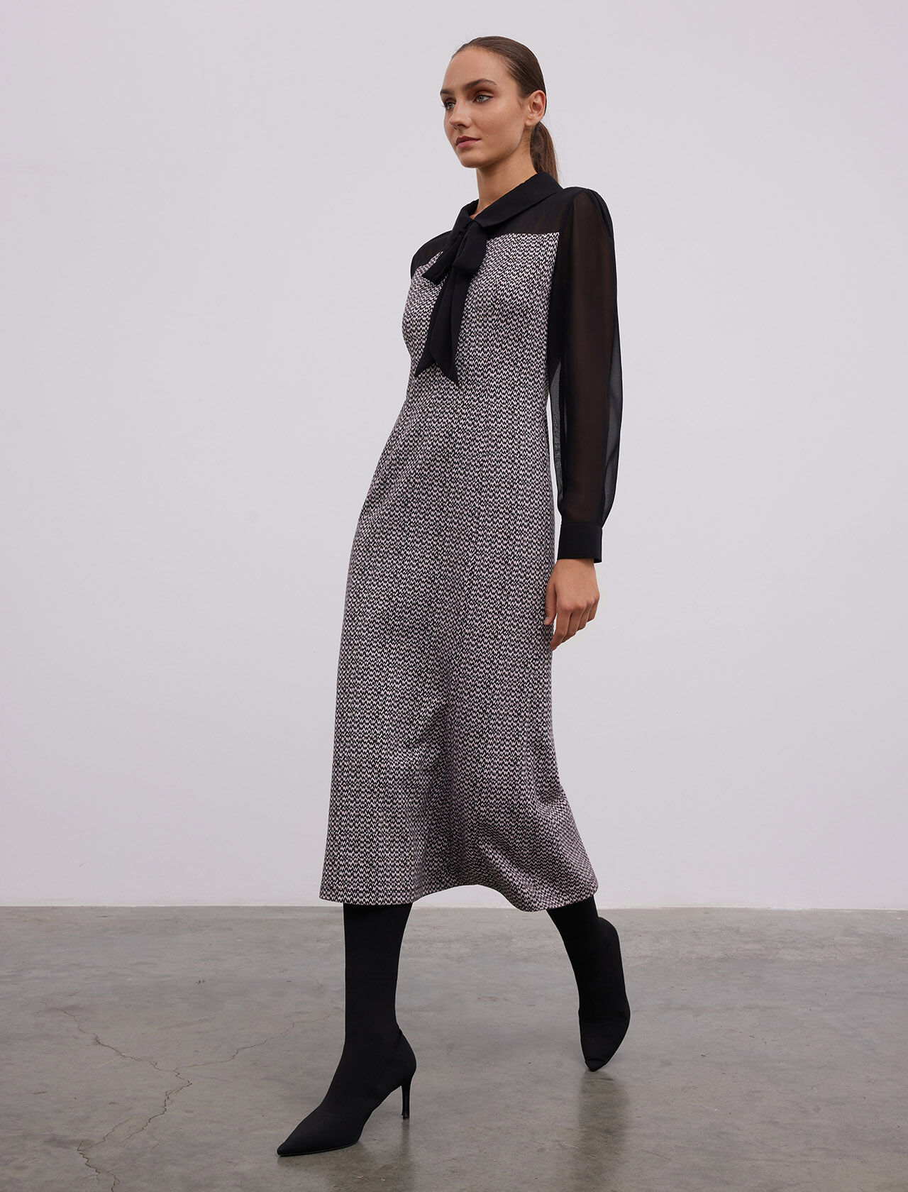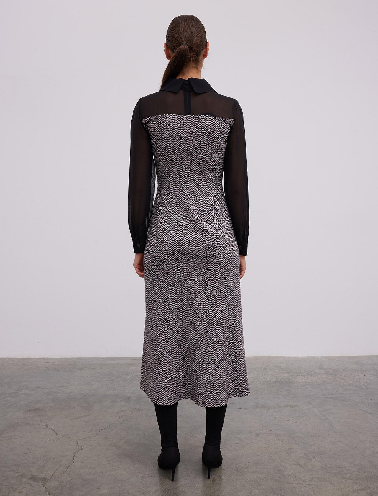 SIFON GARNILI YAKA DETAYLI DESENLI MIDI ELBISE