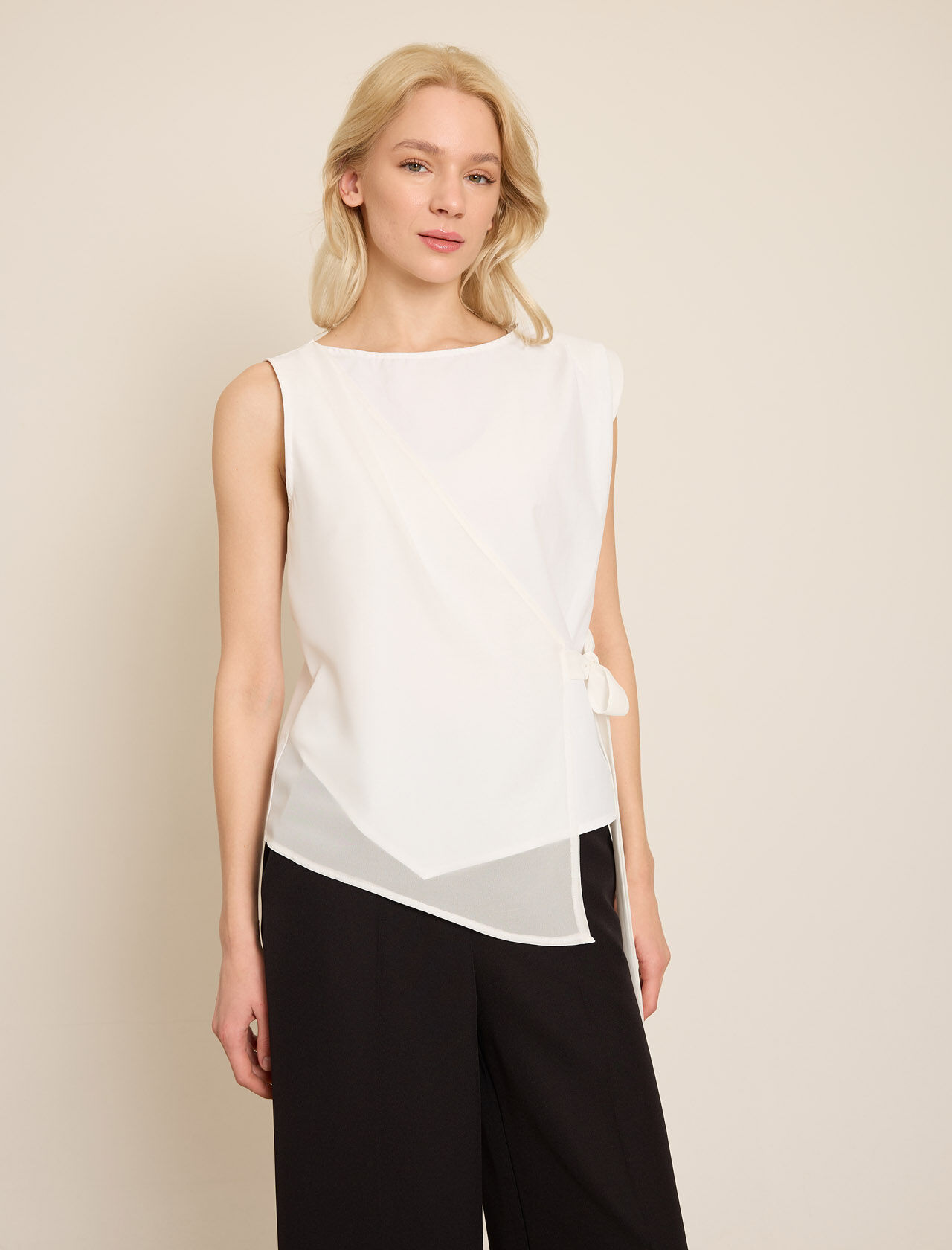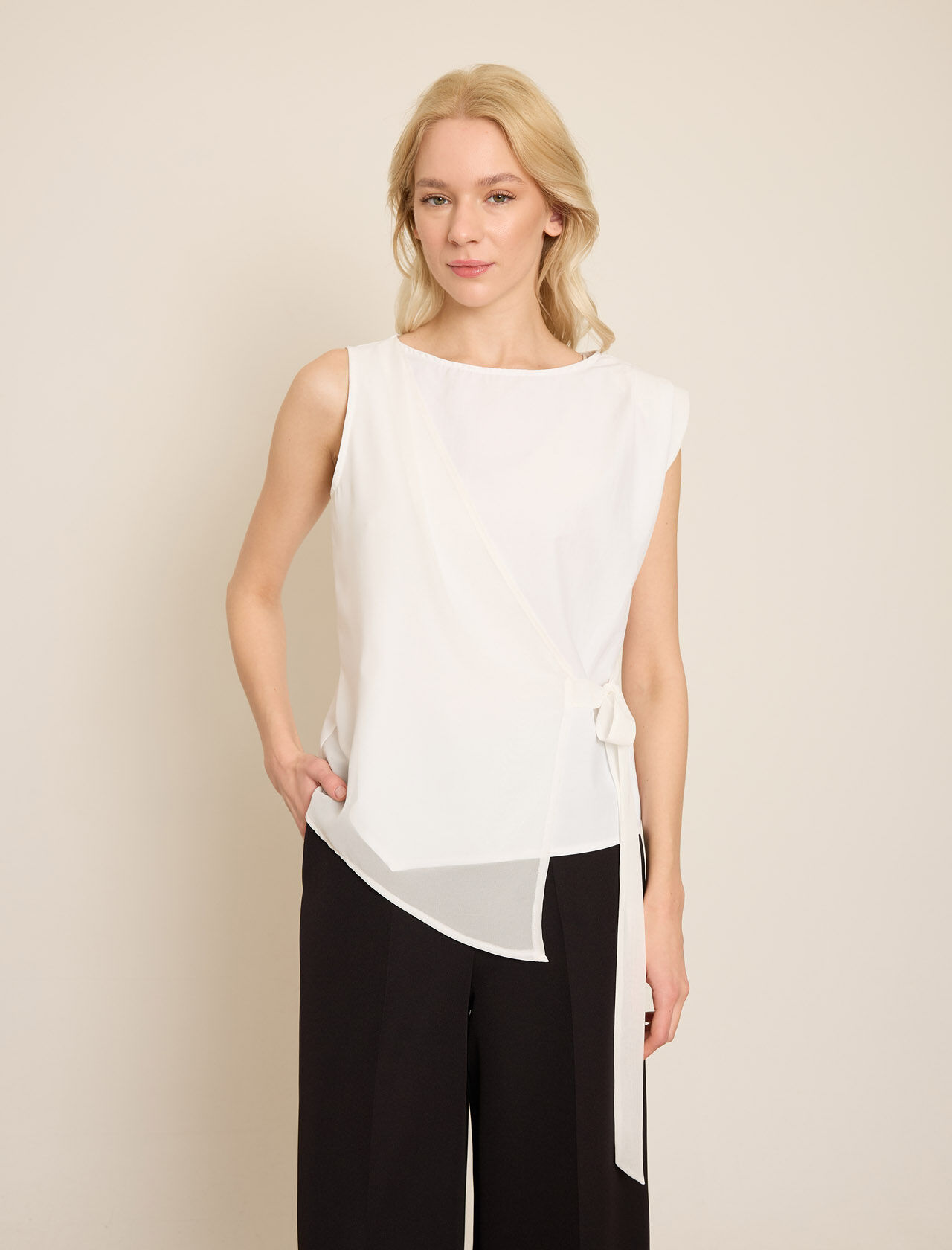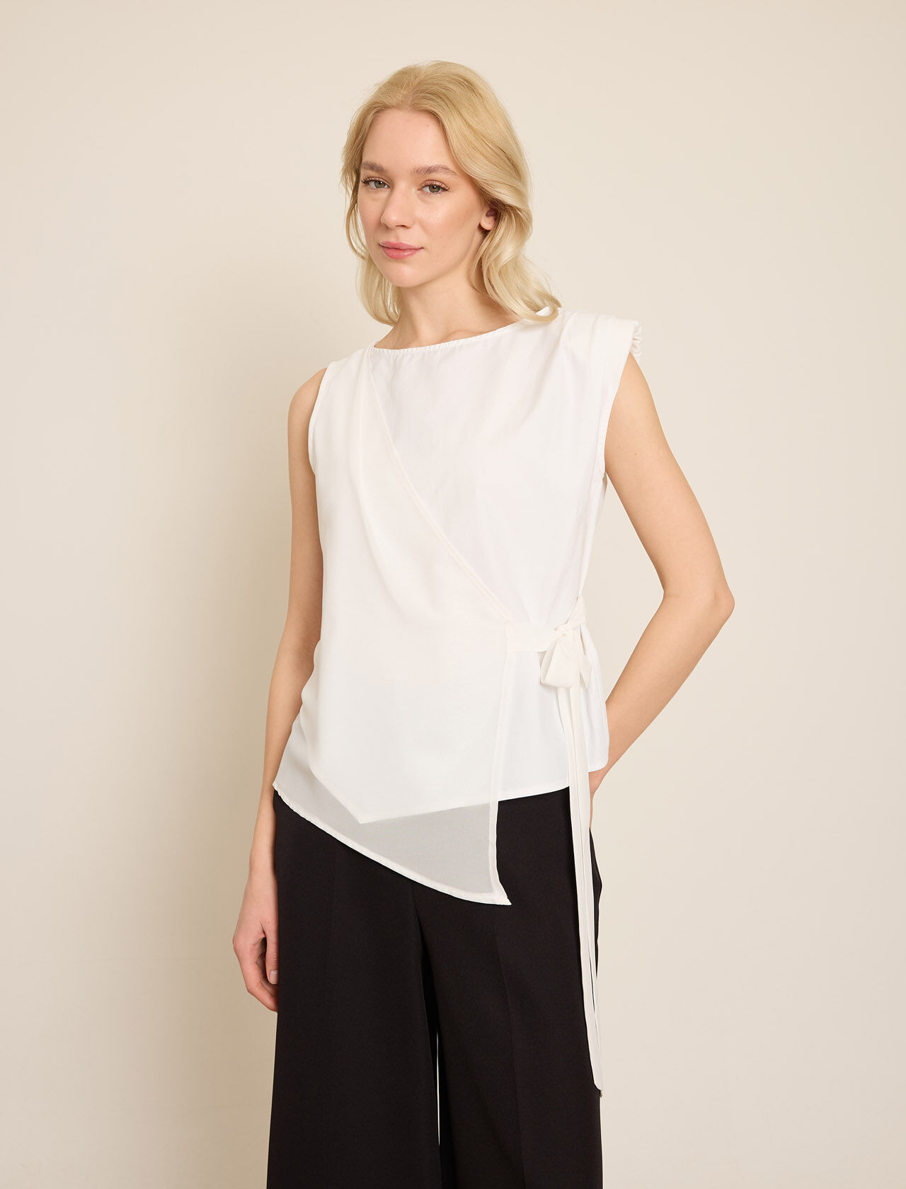 PAMUK KARISIM SUS DIKISLI KEMERLI KOLSUZ BLUZ