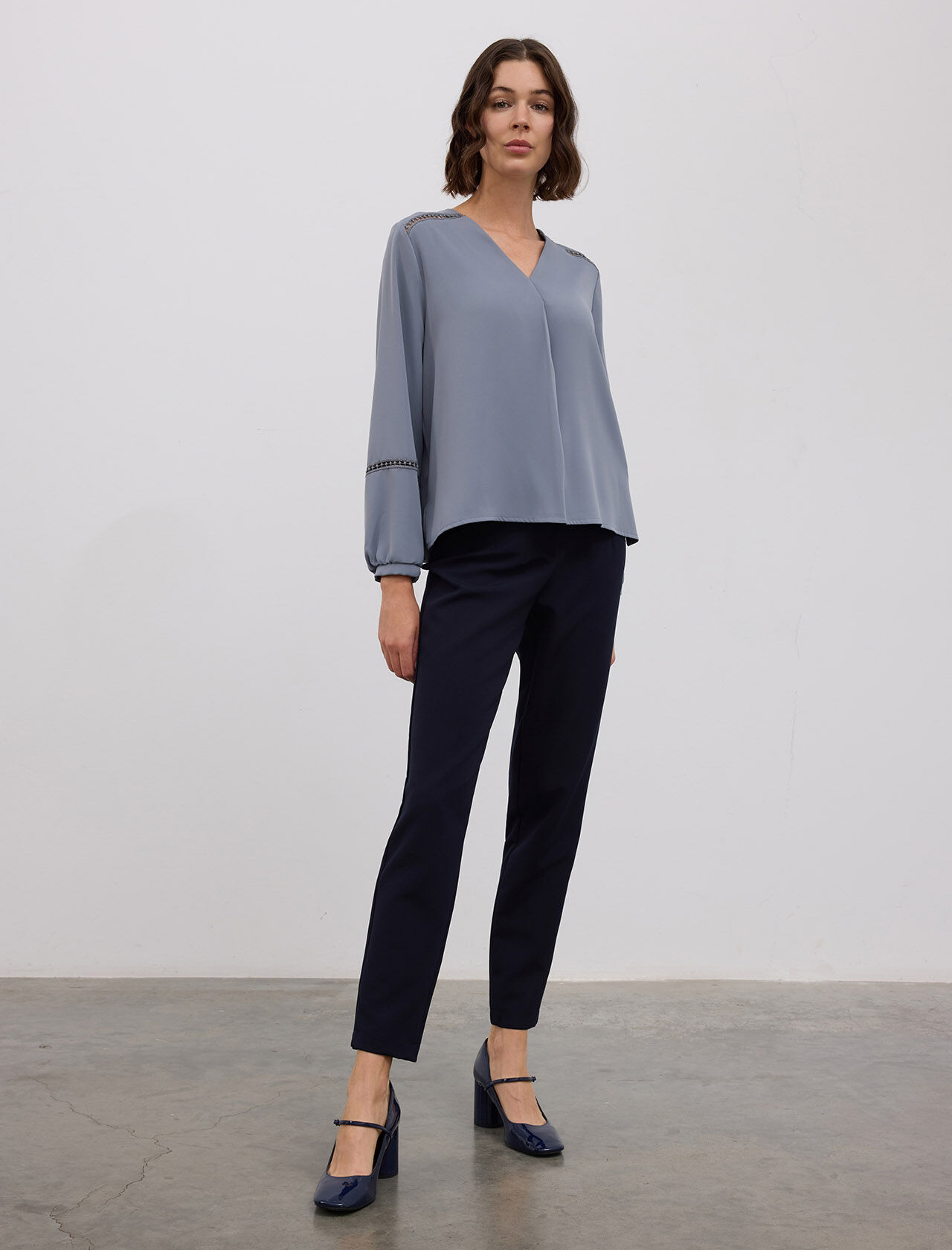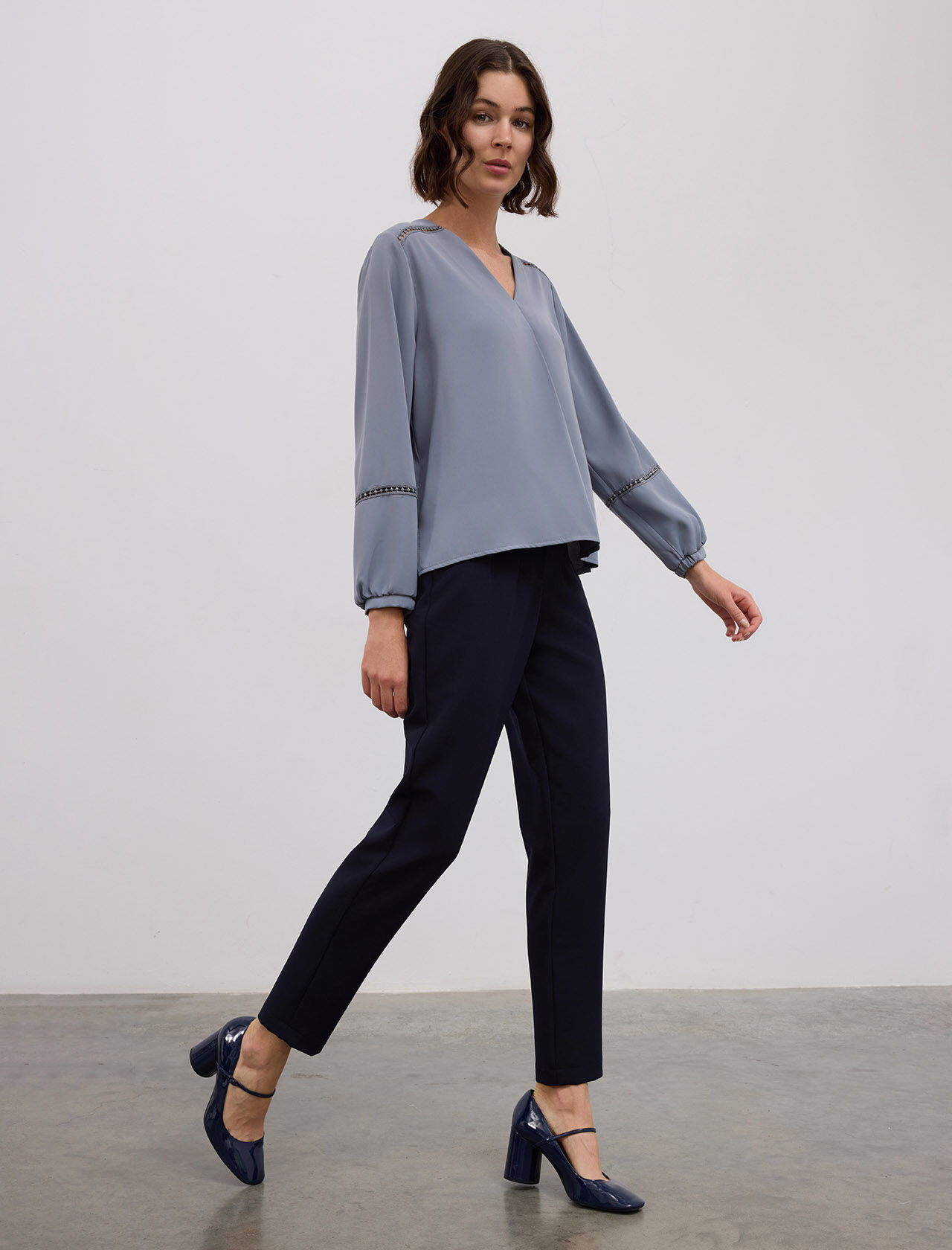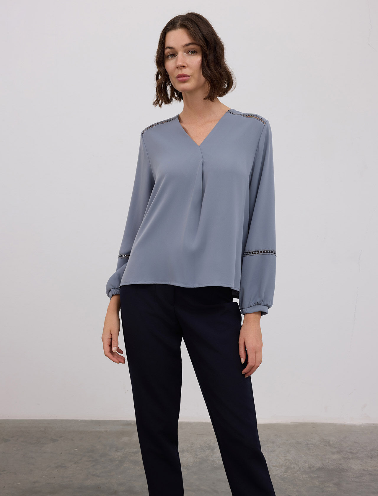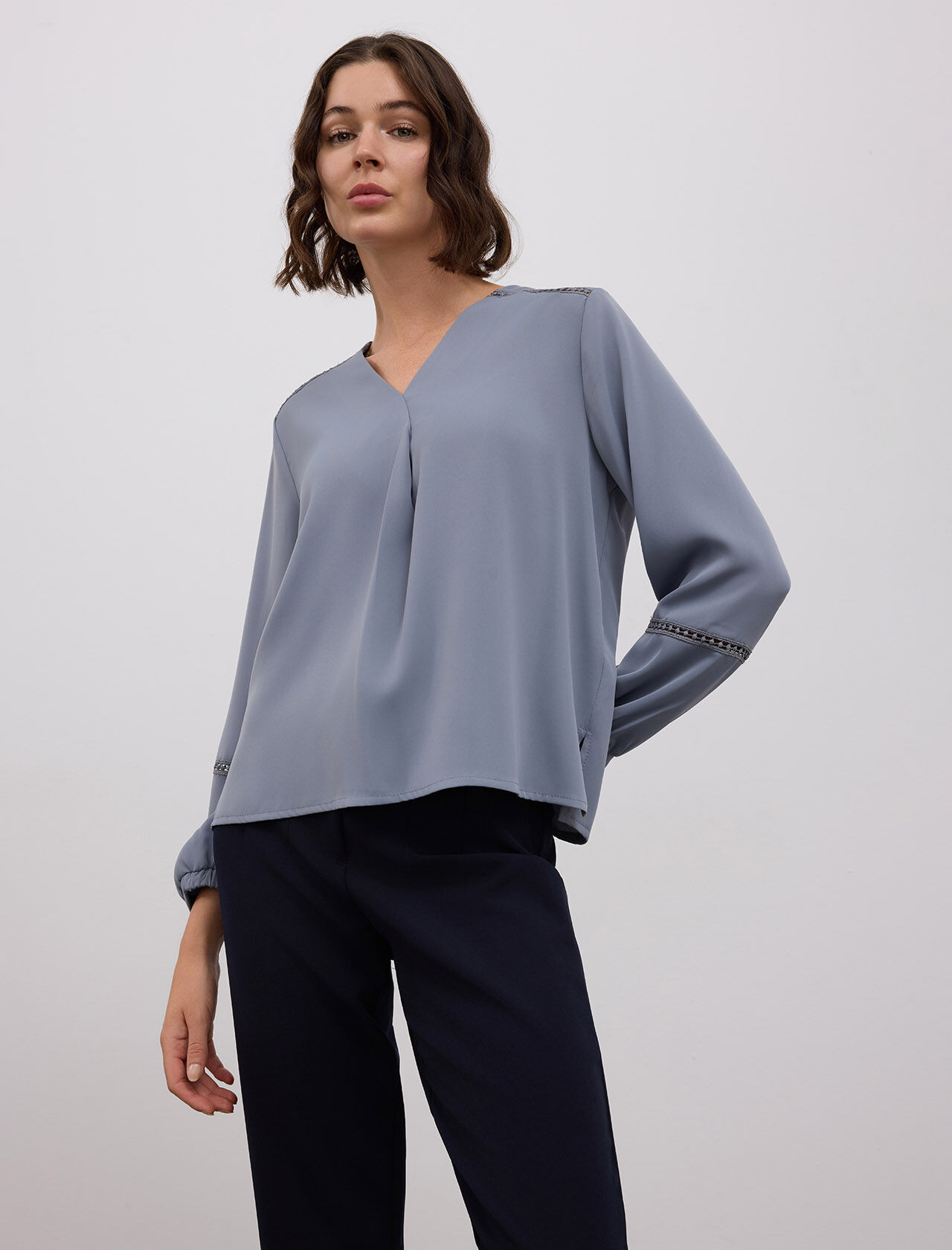 V YAKA-PILELI GUPUR DETAYLI SATEN BLUZ