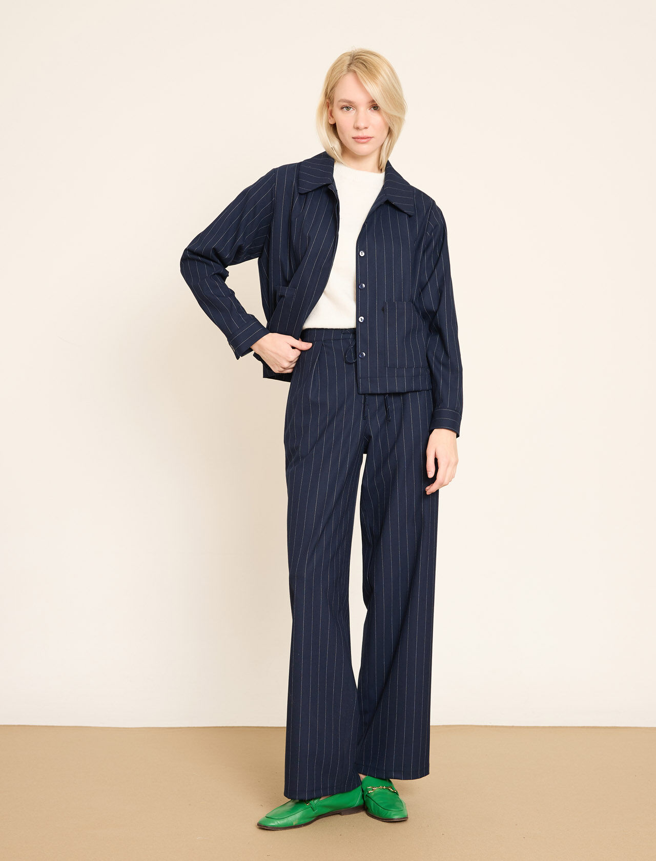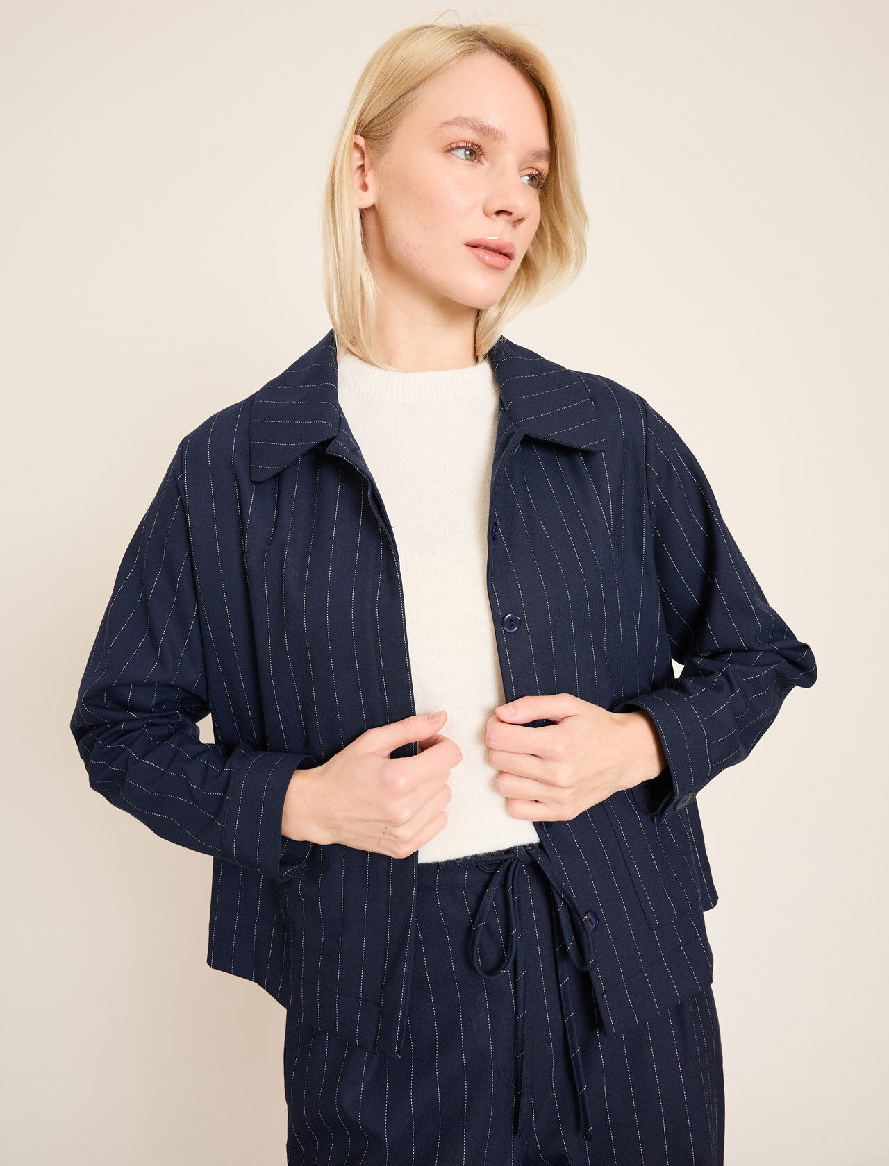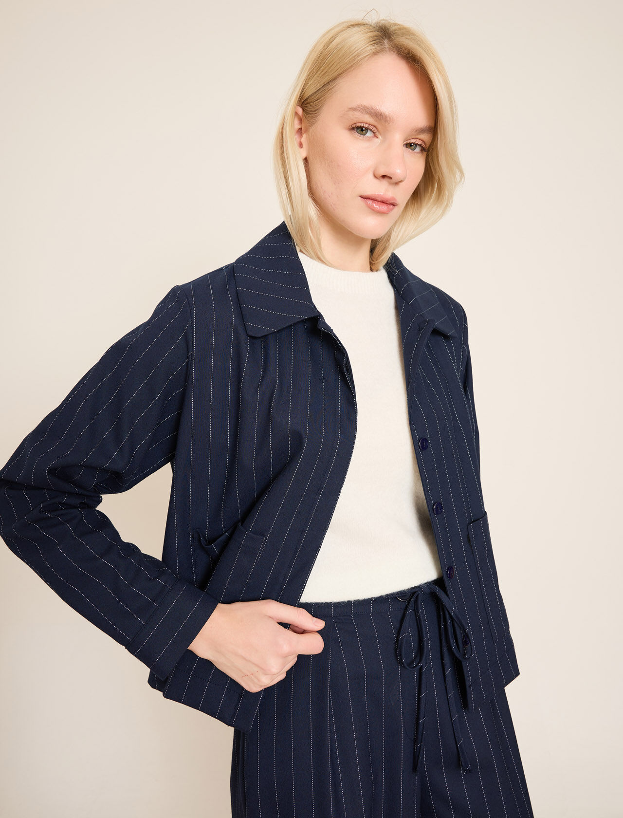 Düğmeli ve Ön Cepli Çizgili Keten Blazer