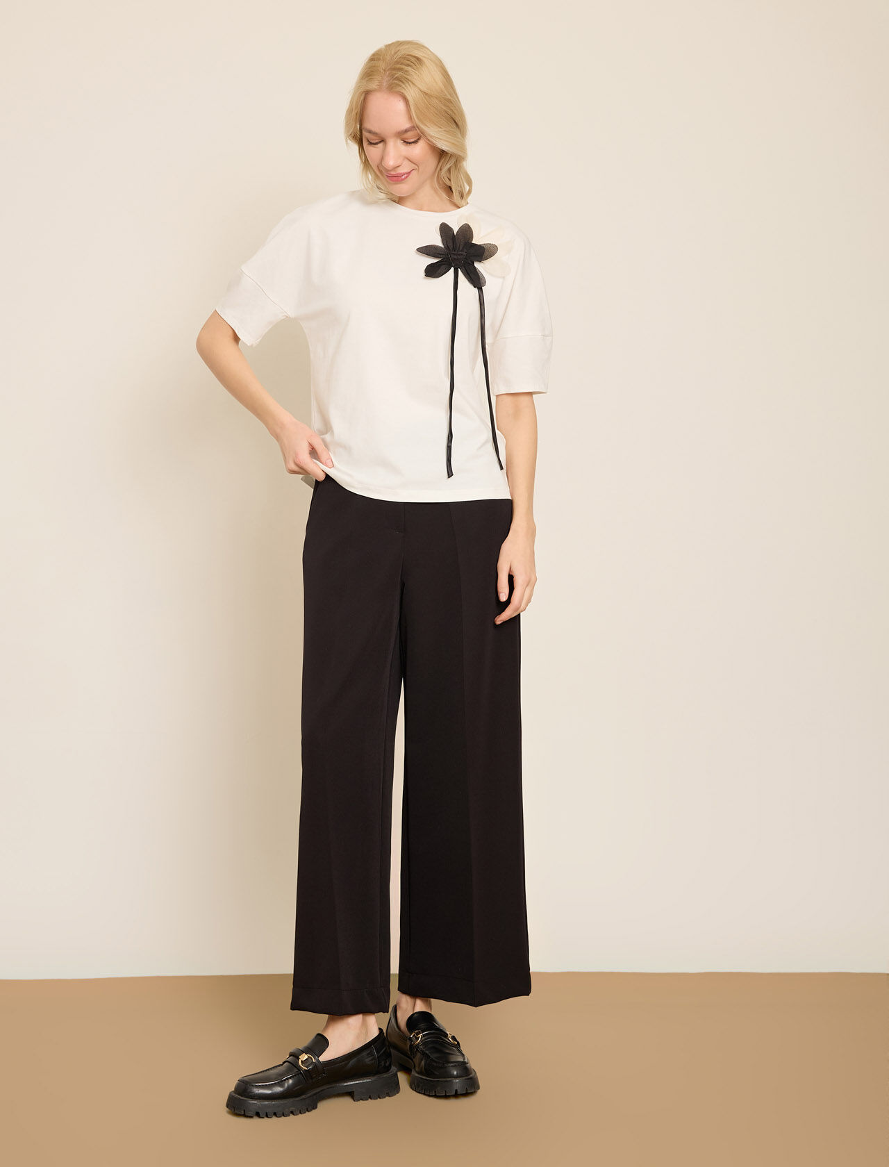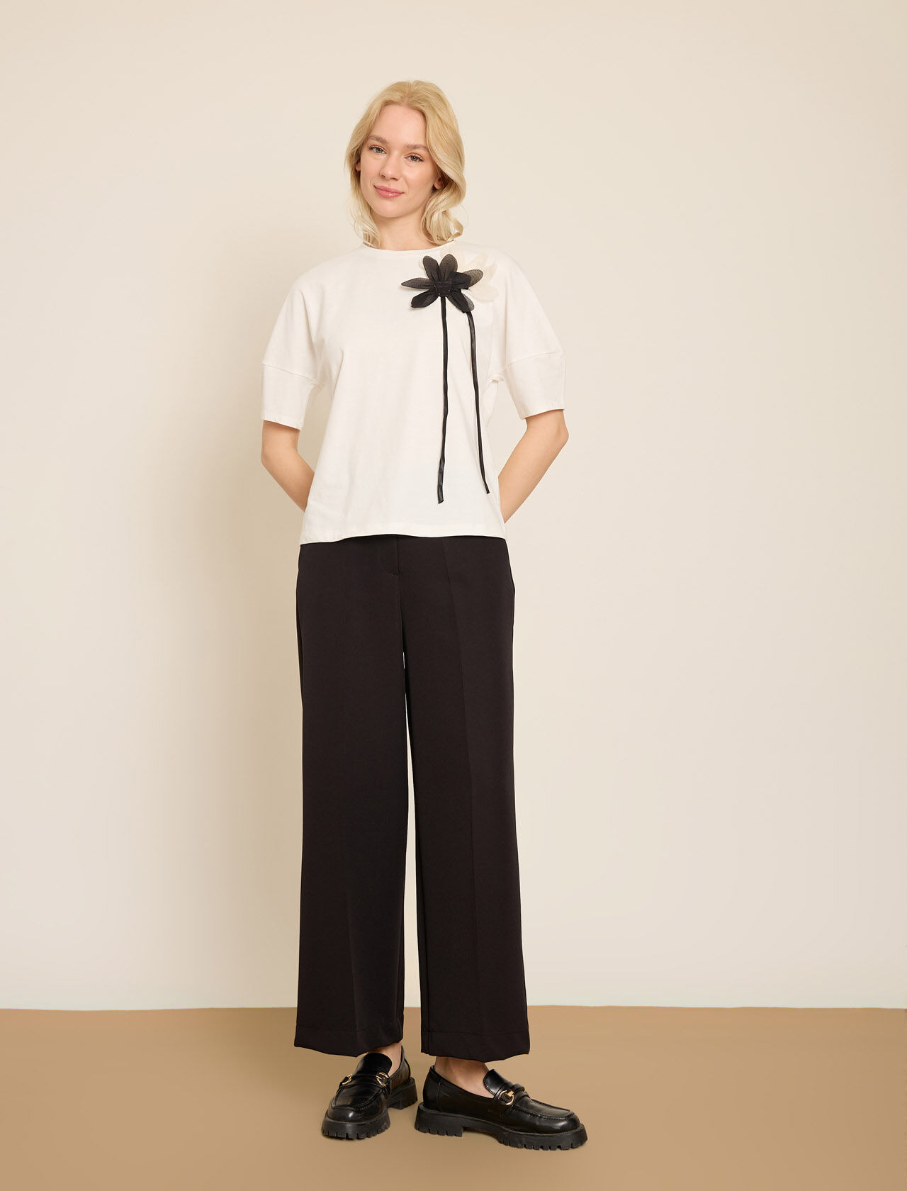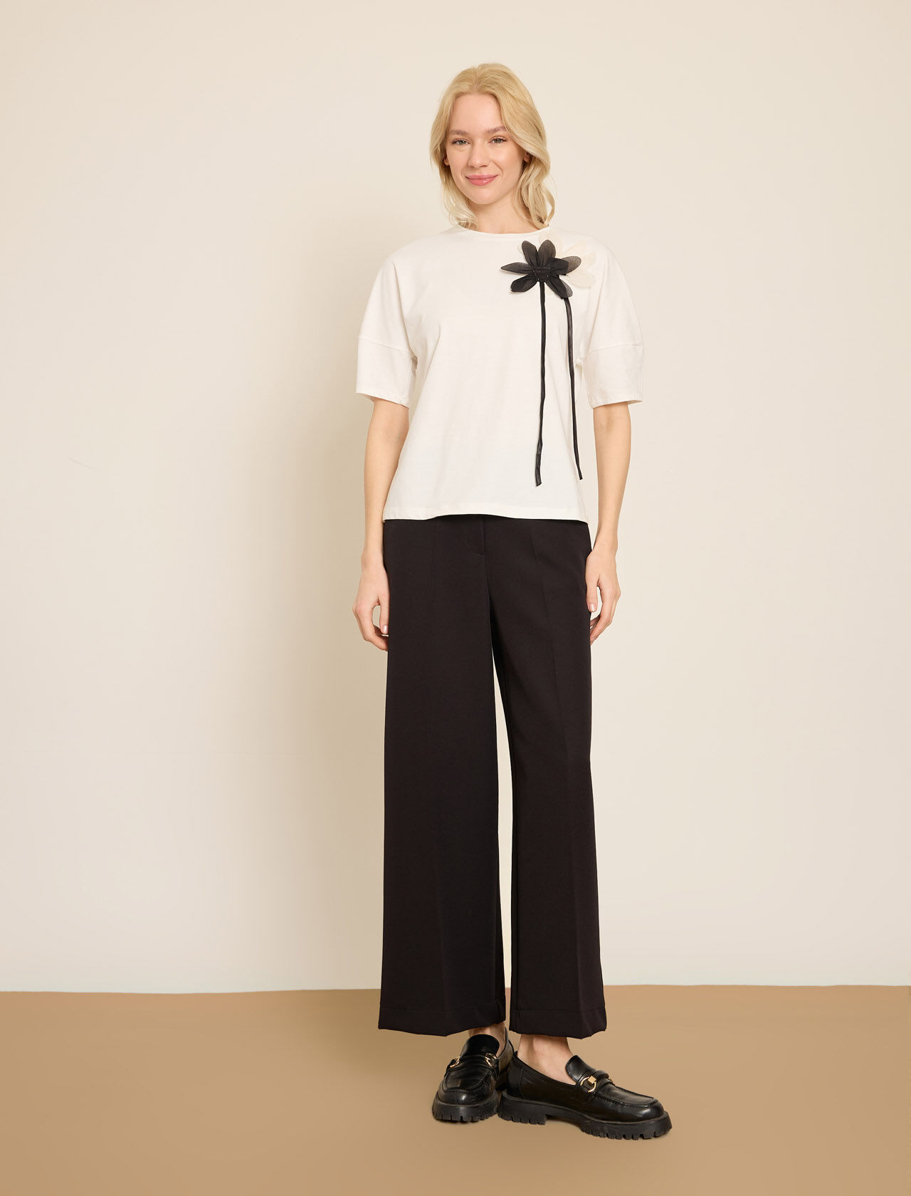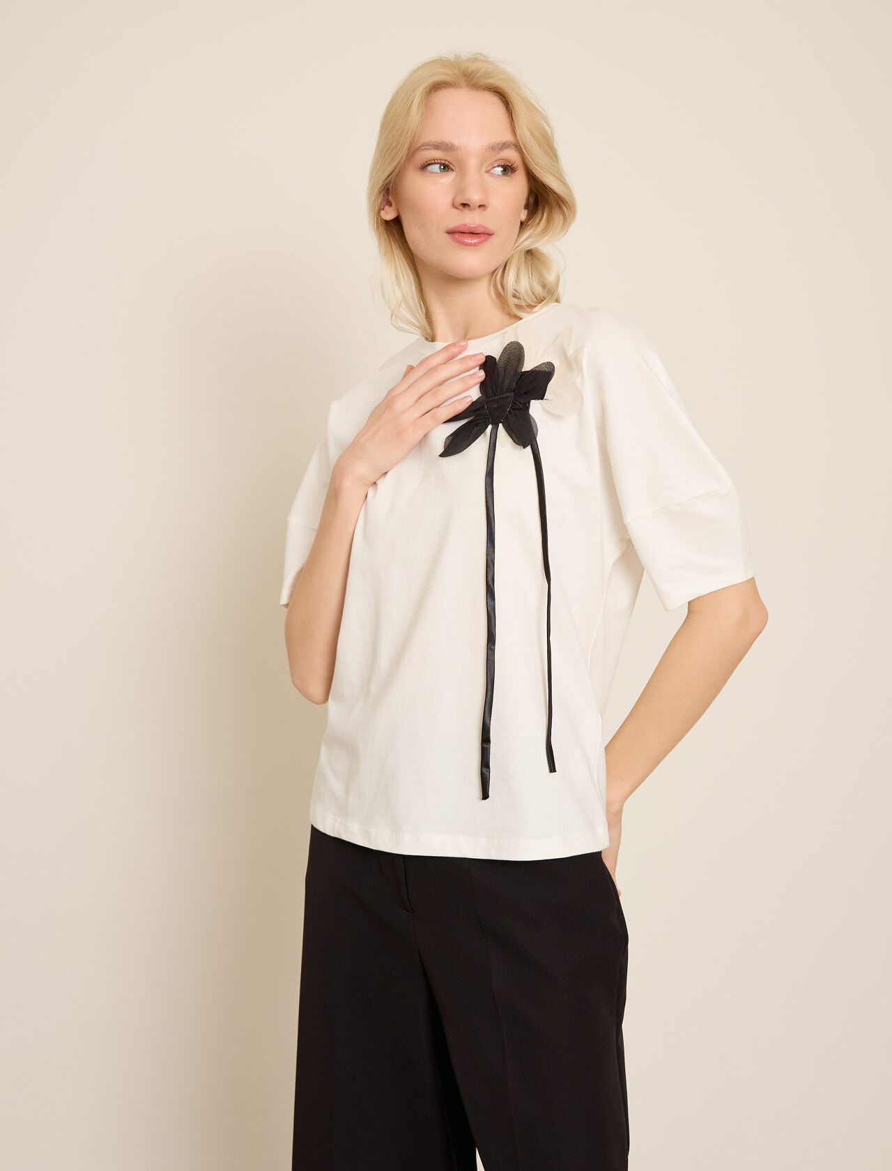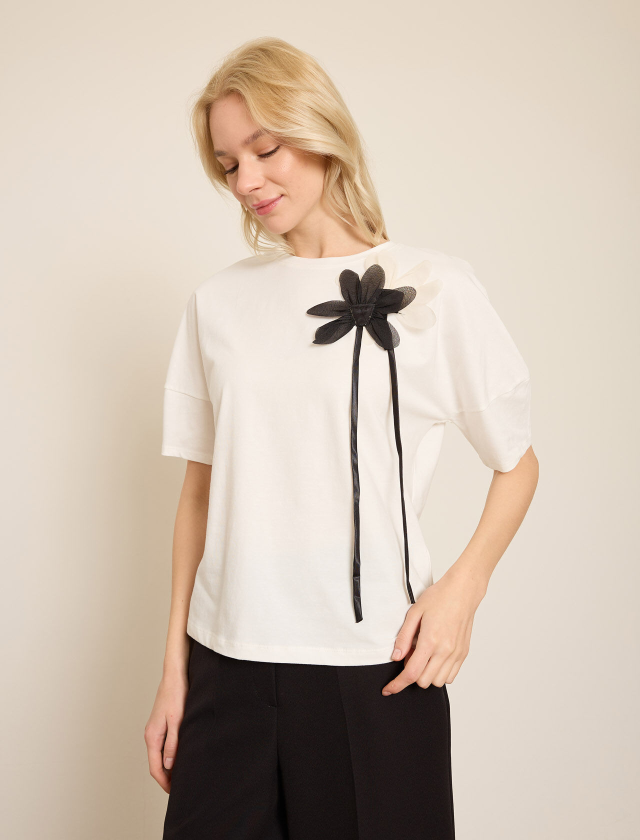 VOLUMLU KONTRAST CICEK APLIKELI PAMUKLU T-SHIRT