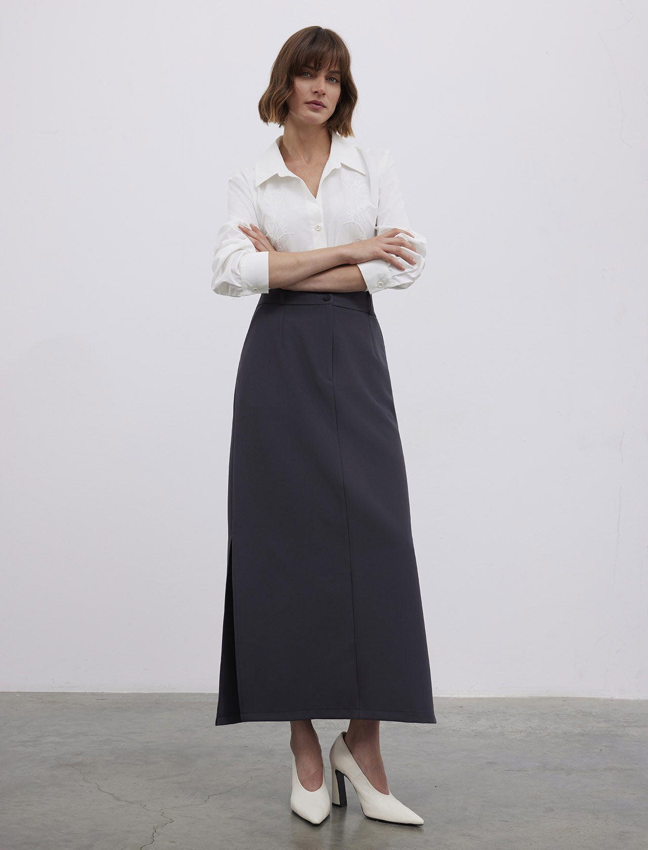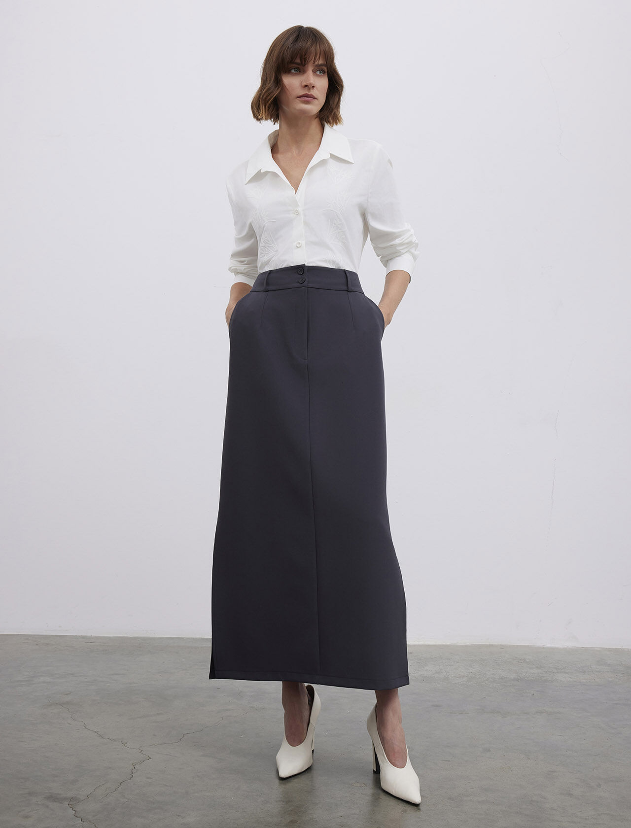 Dikiş Detaylı Midi Boy Pamuk Karışımlı Etek