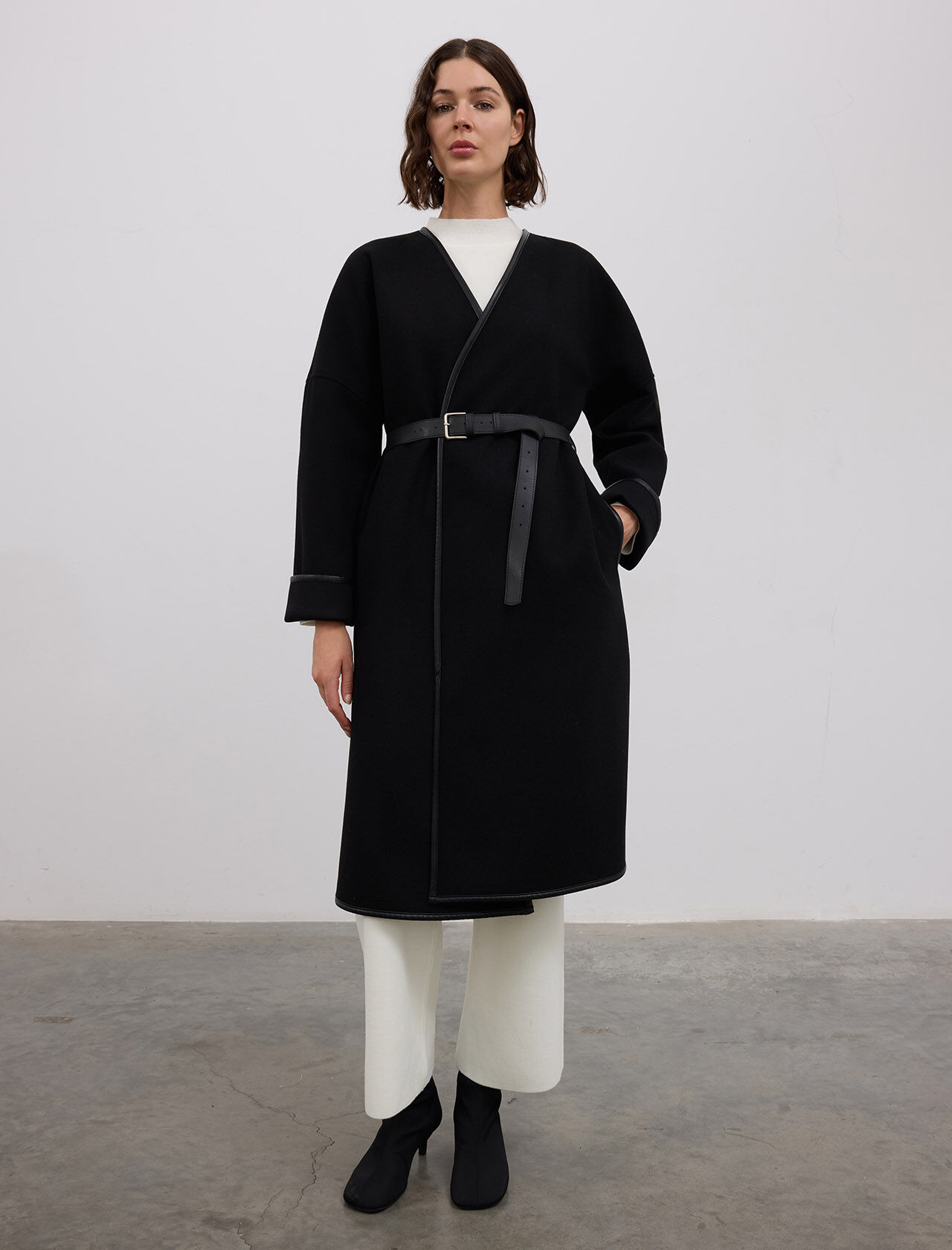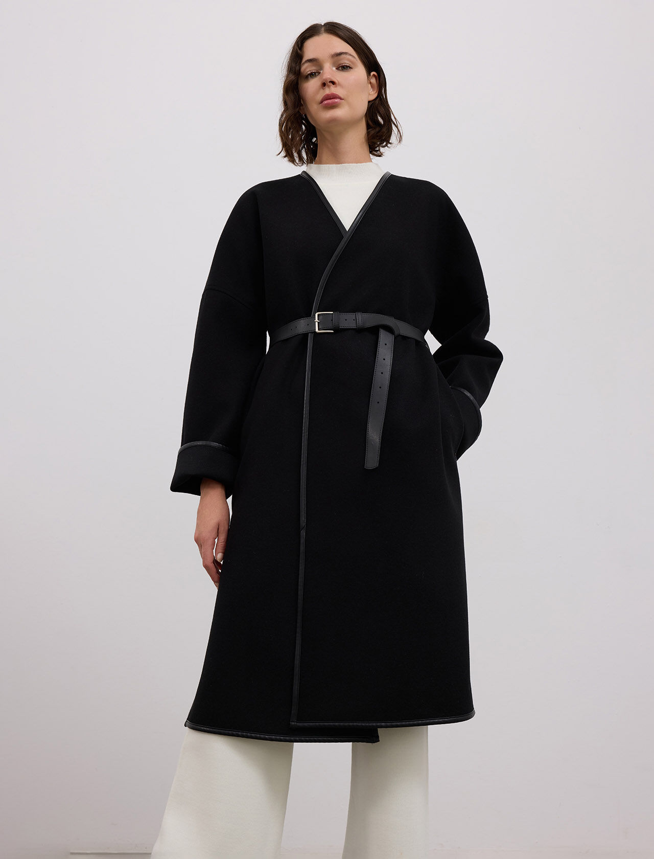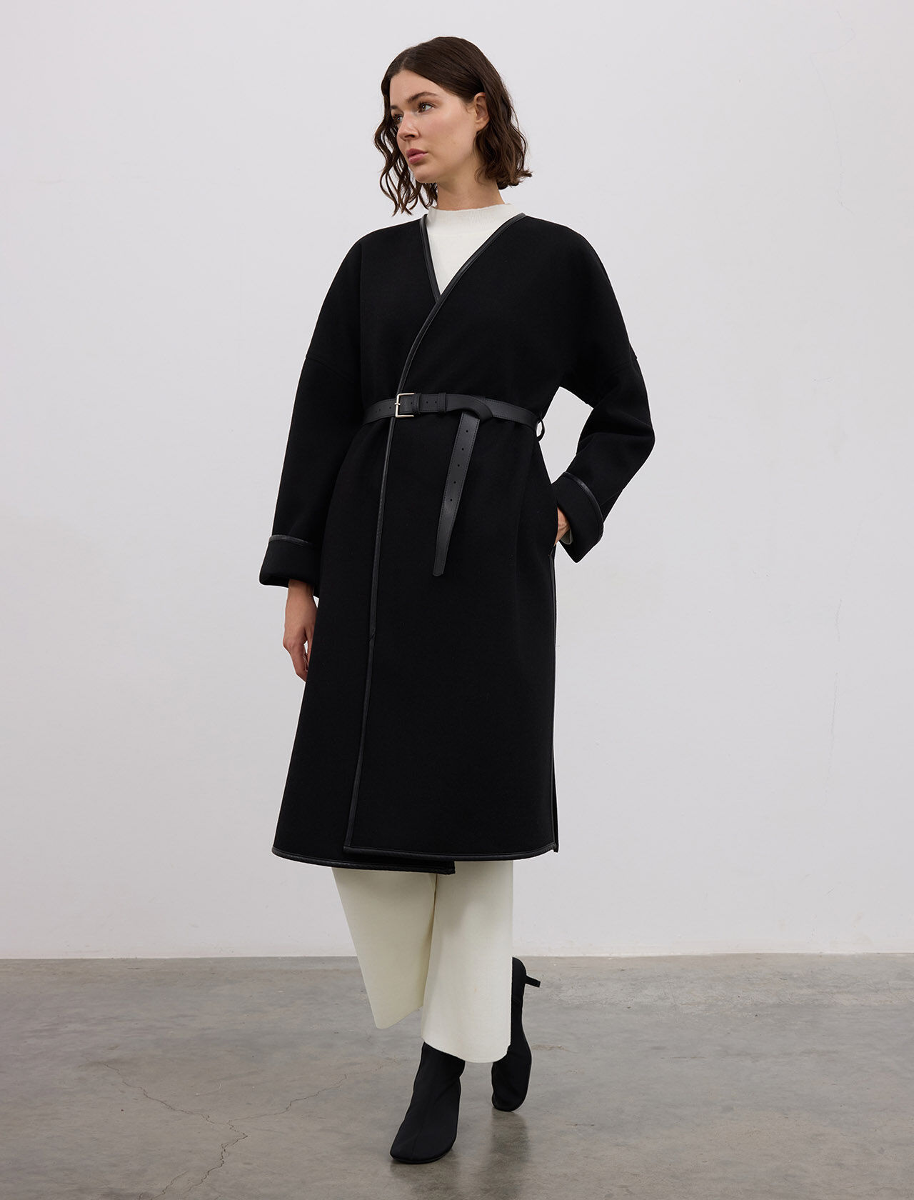 YUN KARISIMLI DERI BIYE DETAYLI DERI KEMERLI KABAN